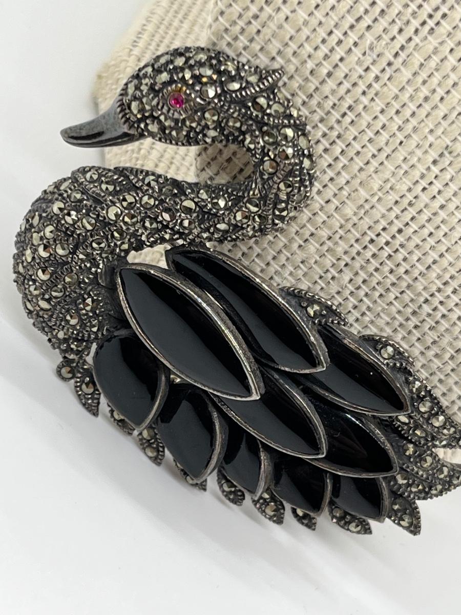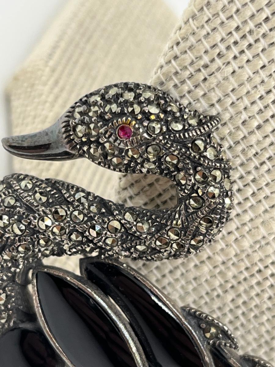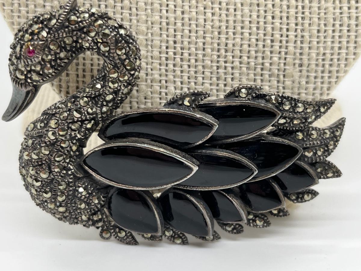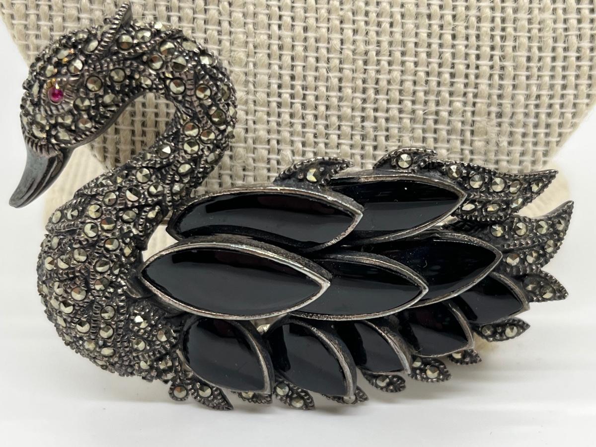 LOT 17: Sterling Silver, Marcasite Onyx Swan Brooch / Pin w/ Ruby Eye - 32.59 gtw