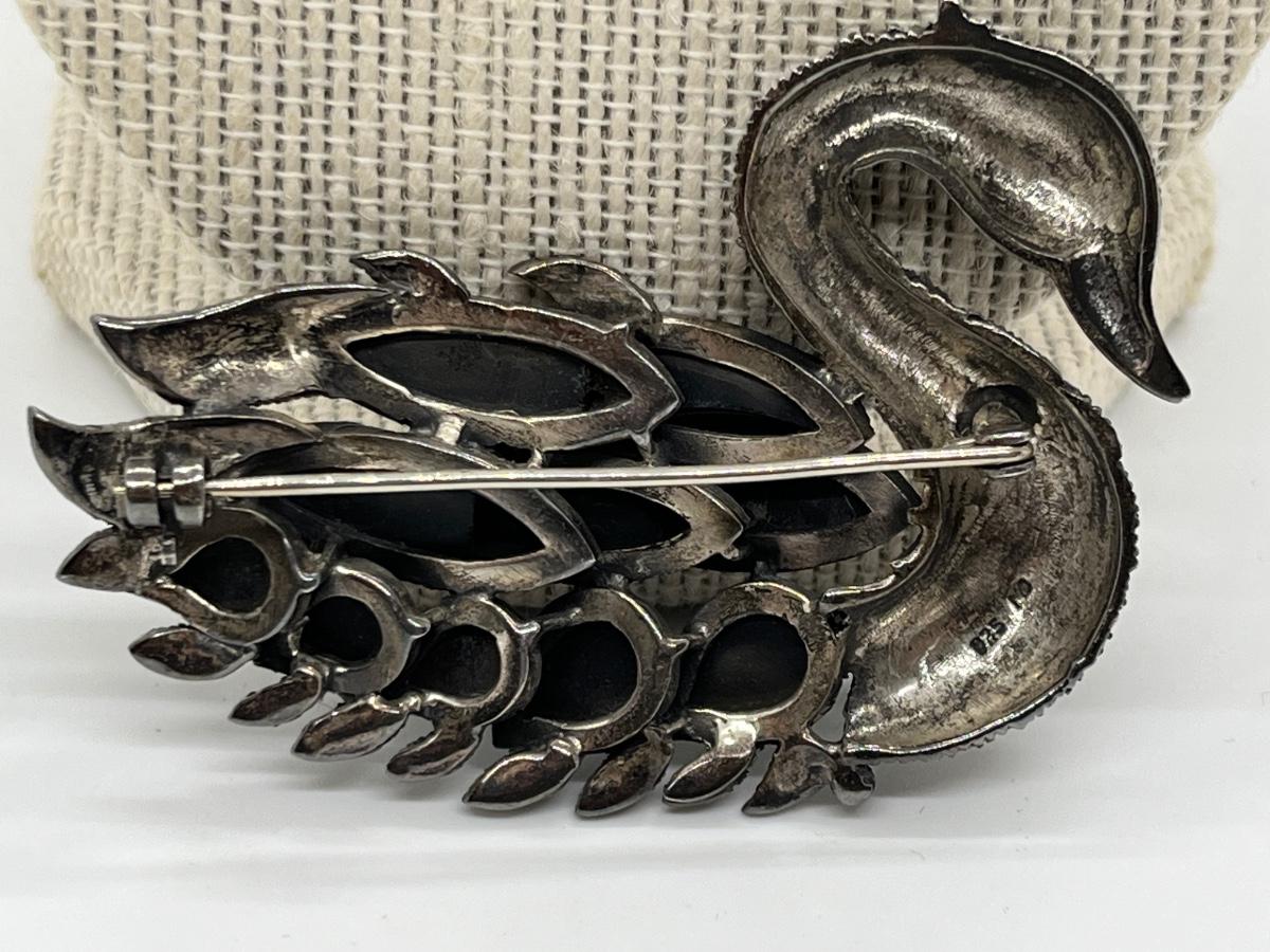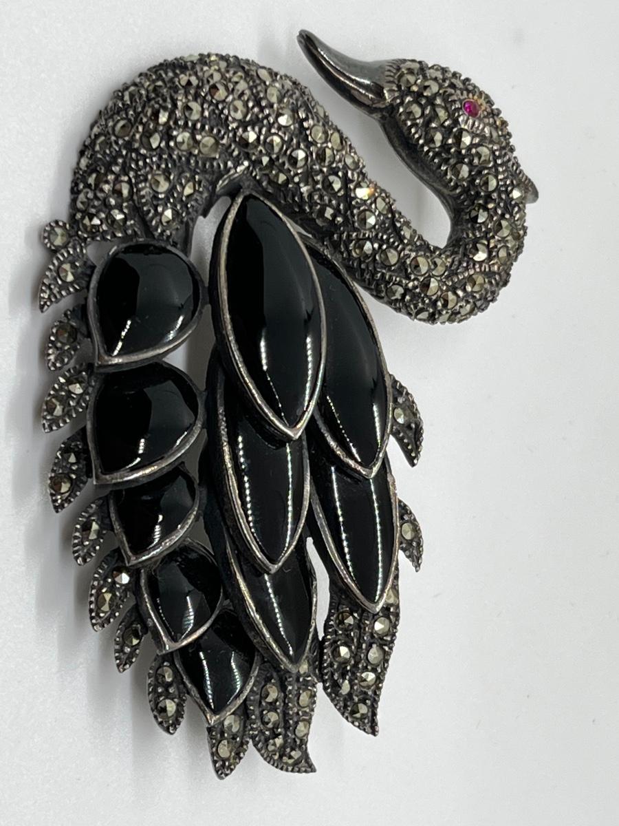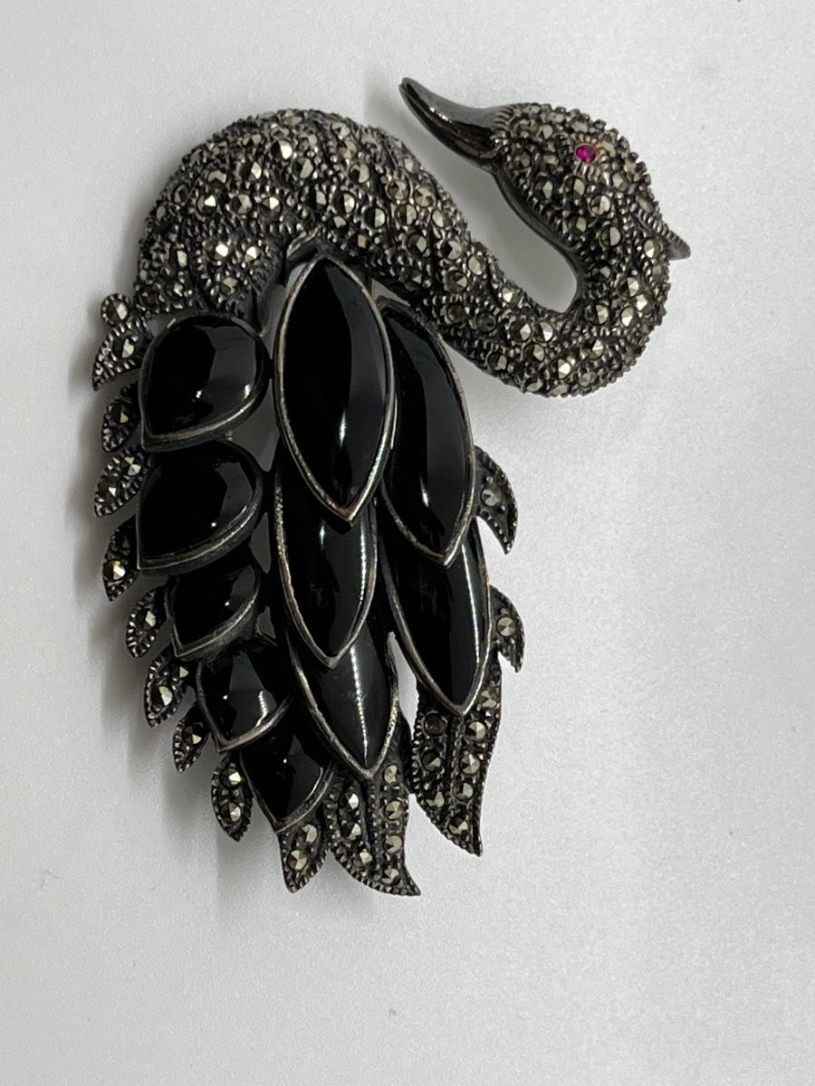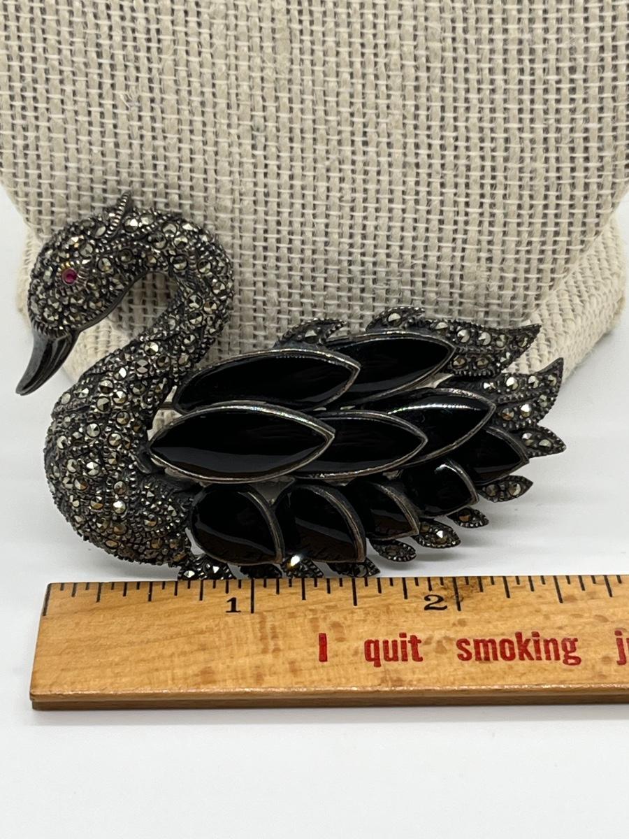 LOT 17: Sterling Silver, Marcasite Onyx Swan Brooch / Pin w/ Ruby Eye - 32.59 gtw