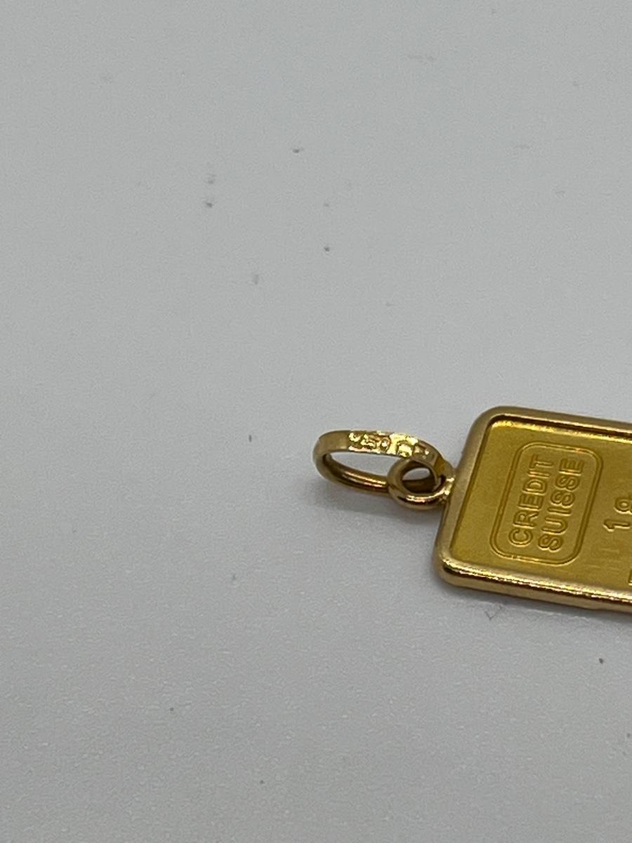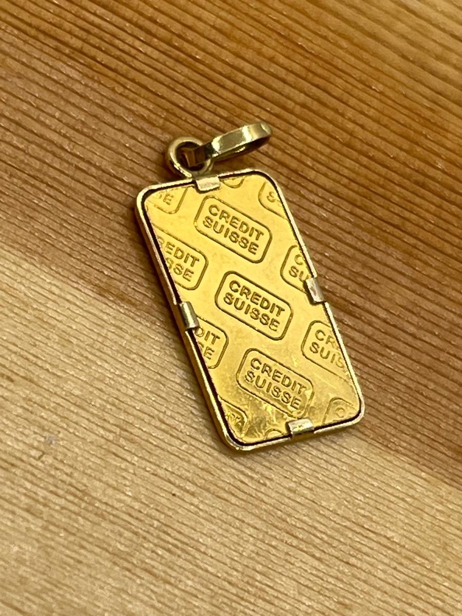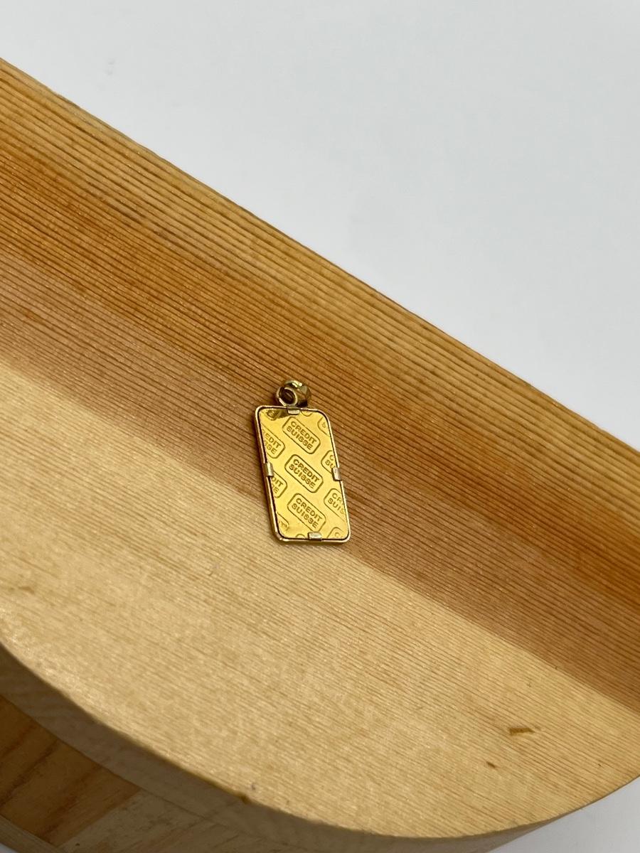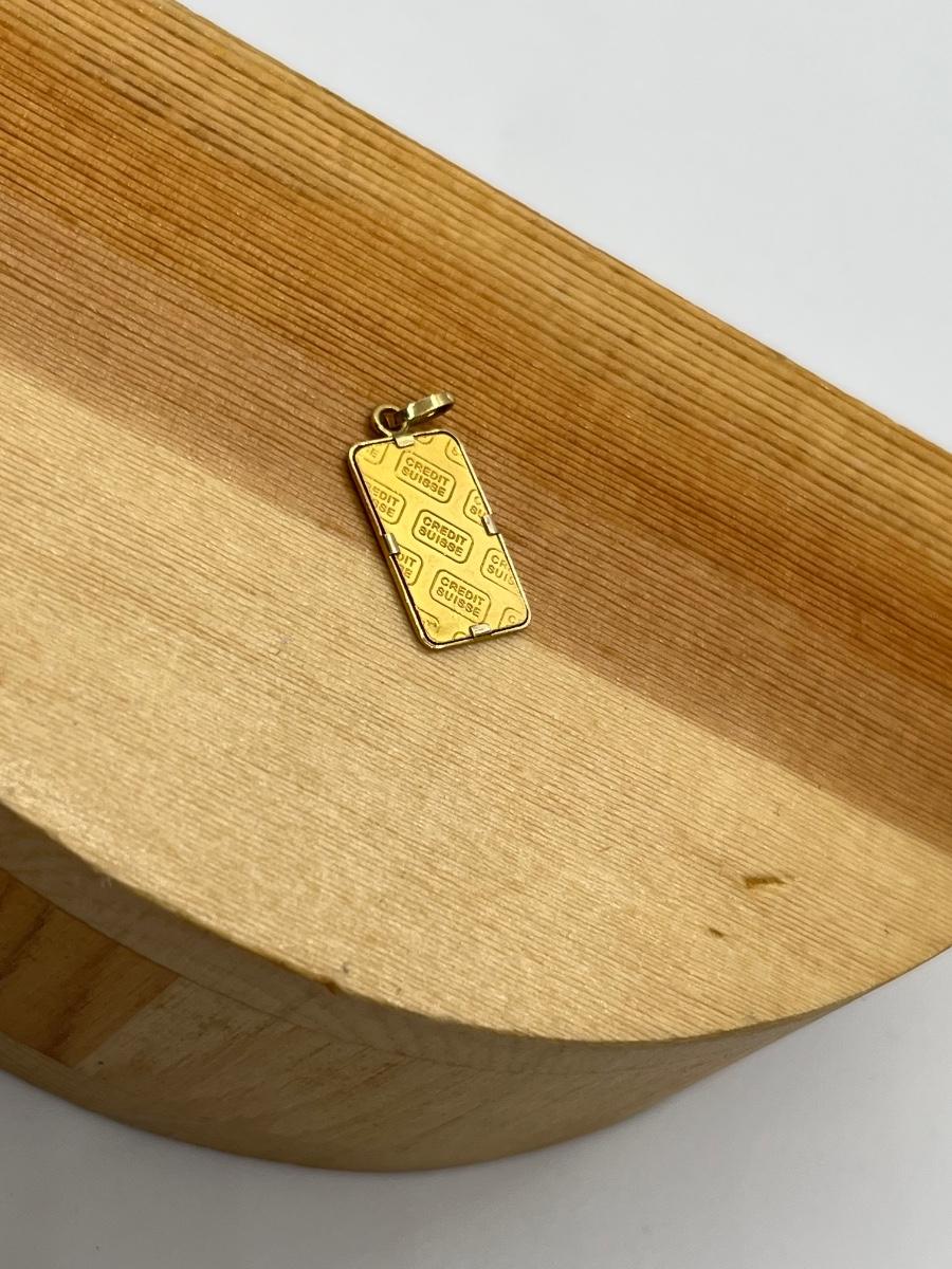 LOT 40: 24K Swiss Fine Gold Credit Suisse Ingot Pendant Framed in 18K - 1.2 Grams Total Weight