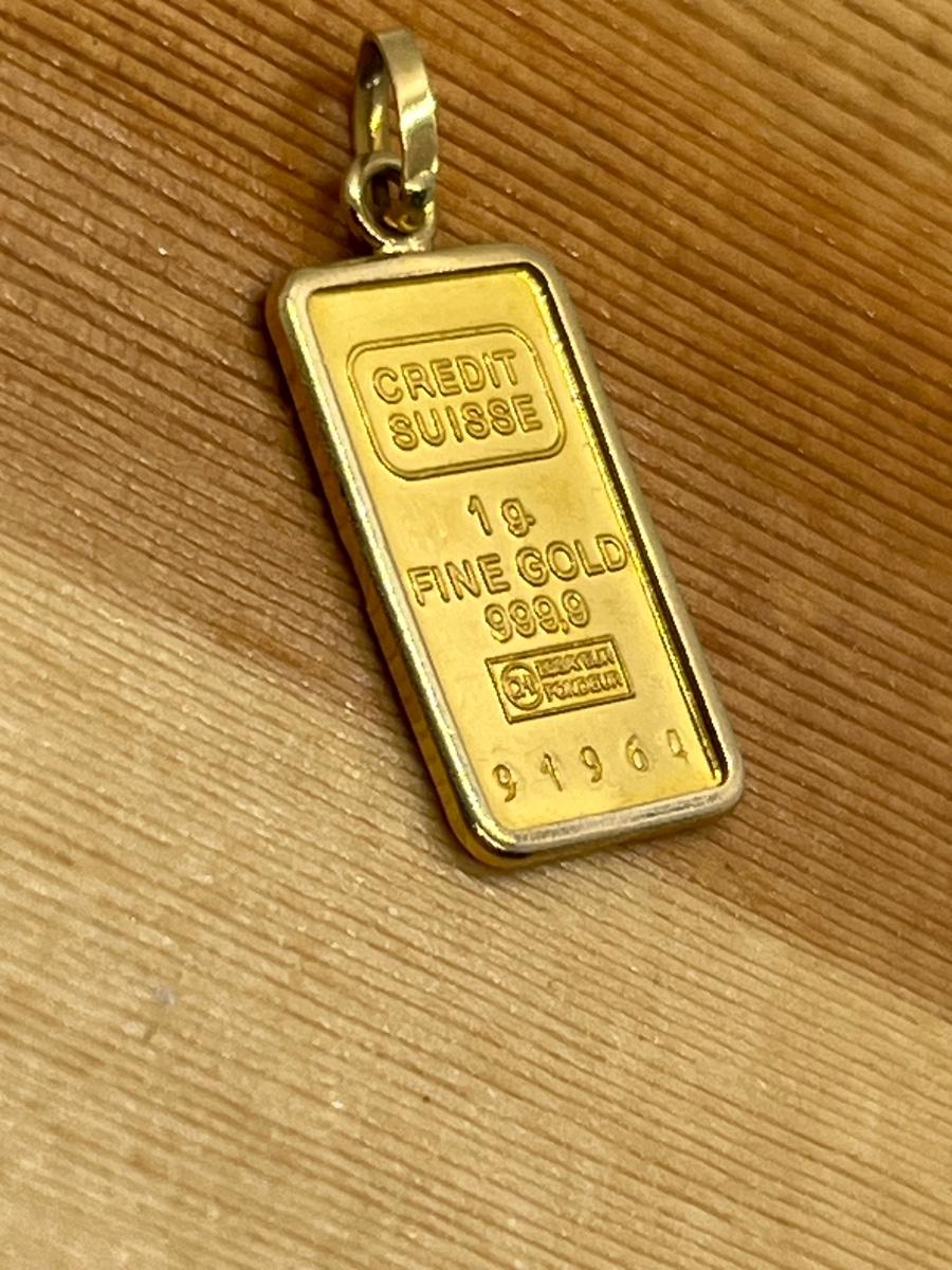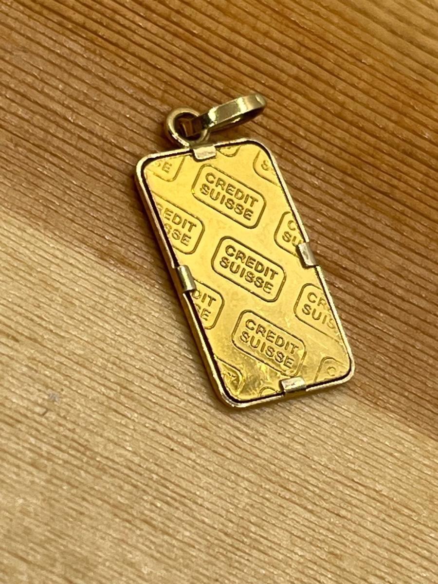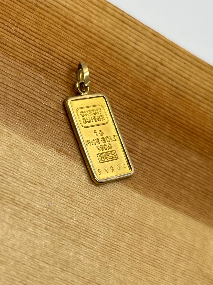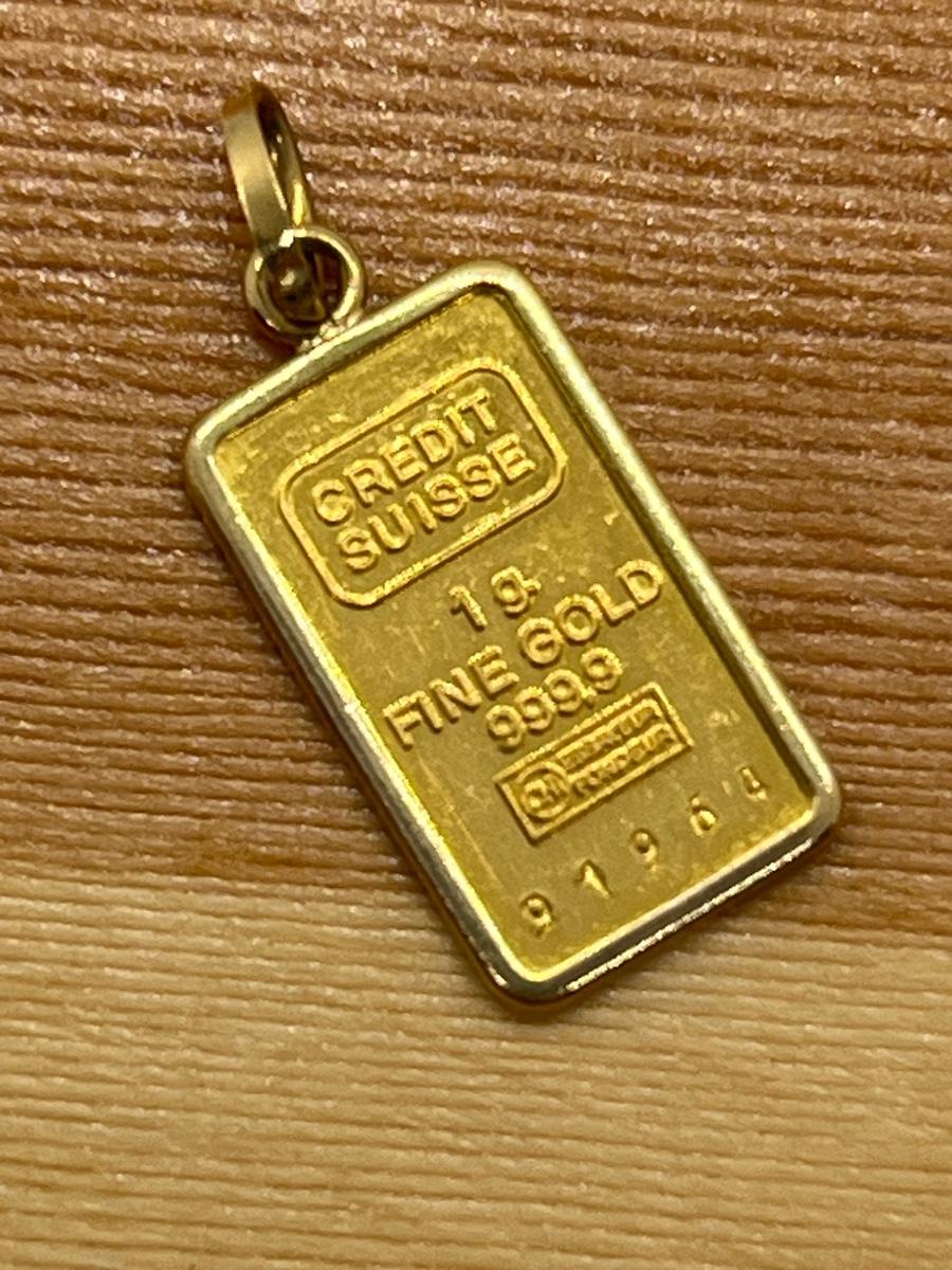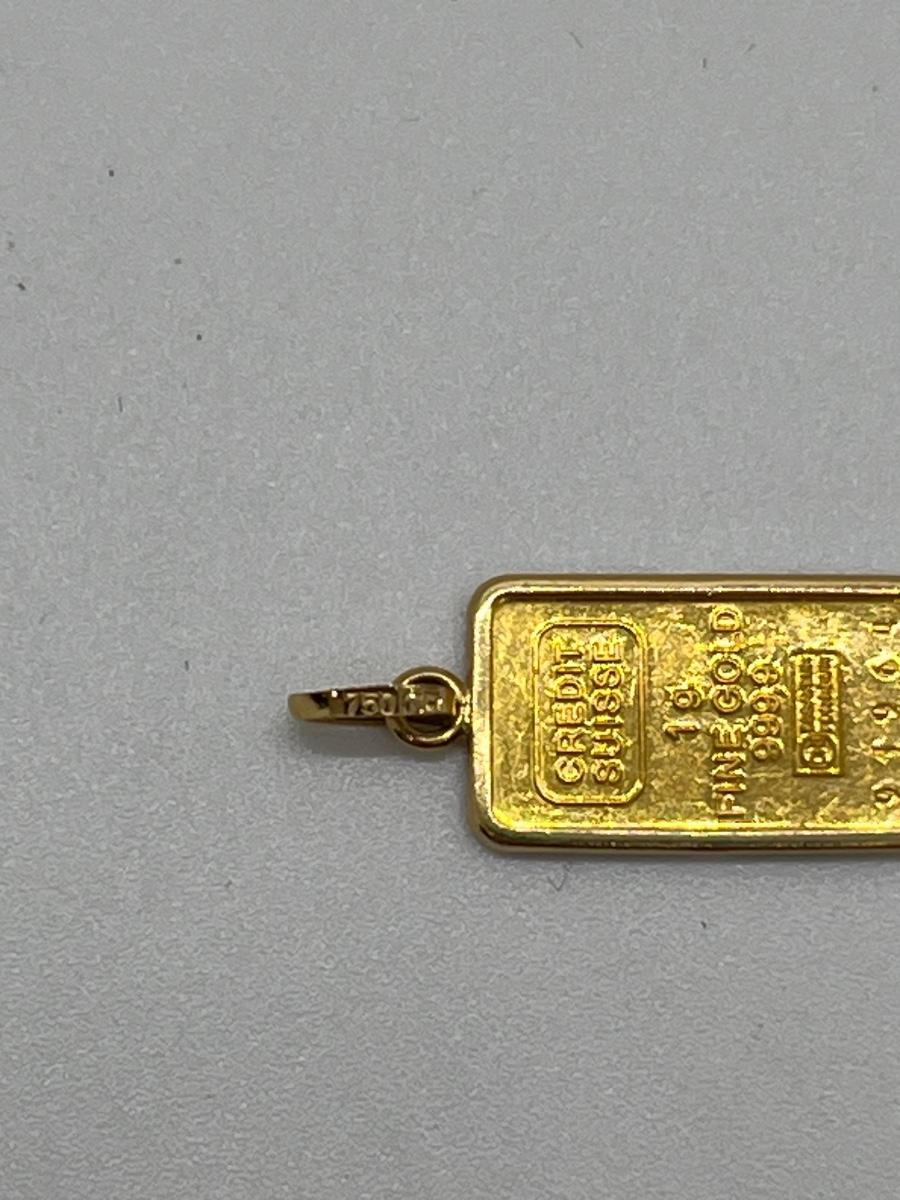 LOT 40: 24K Swiss Fine Gold Credit Suisse Ingot Pendant Framed in 18K - 1.2 Grams Total Weight
