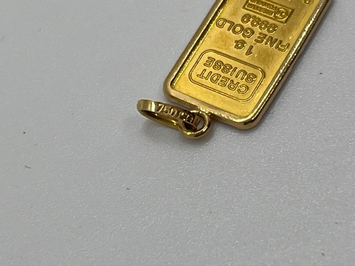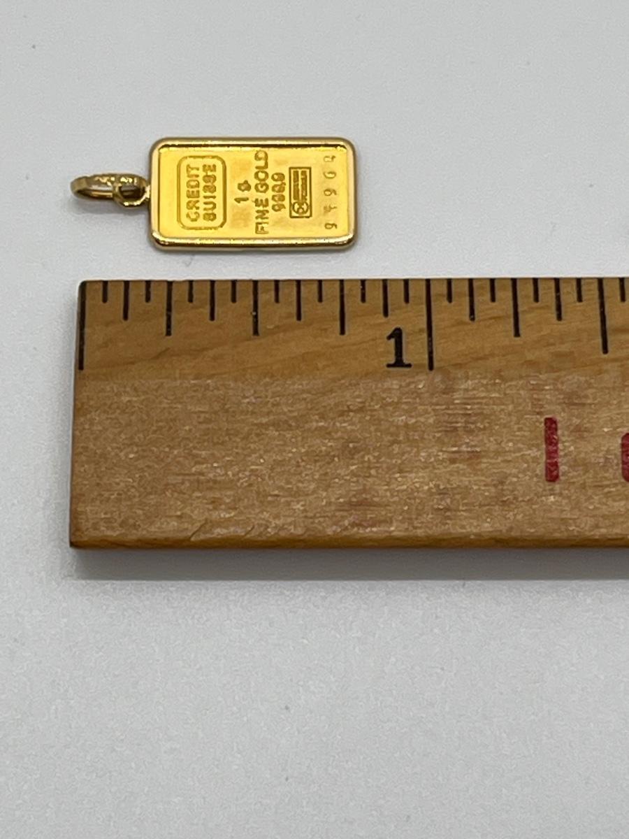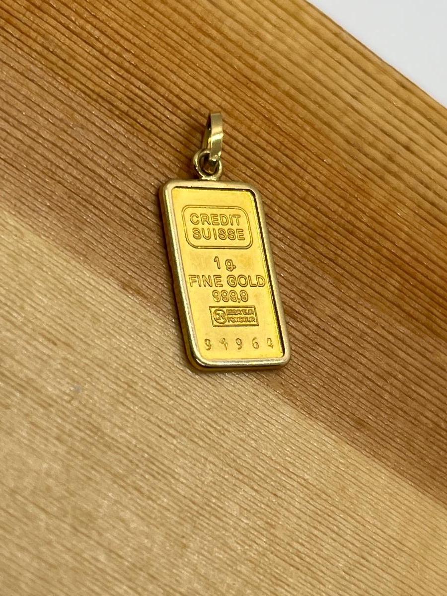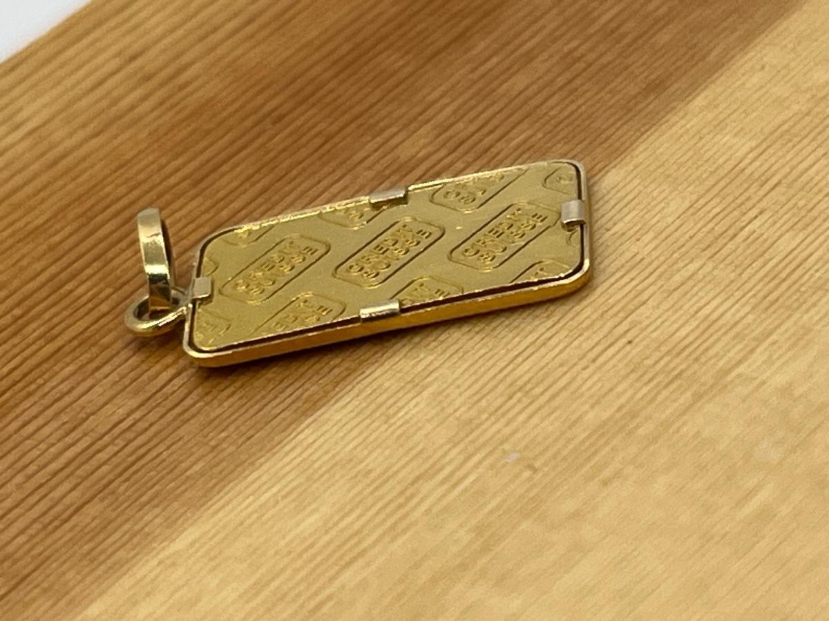 LOT 40: 24K Swiss Fine Gold Credit Suisse Ingot Pendant Framed in 18K - 1.2 Grams Total Weight