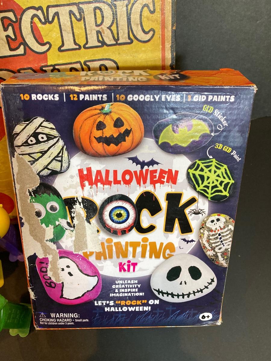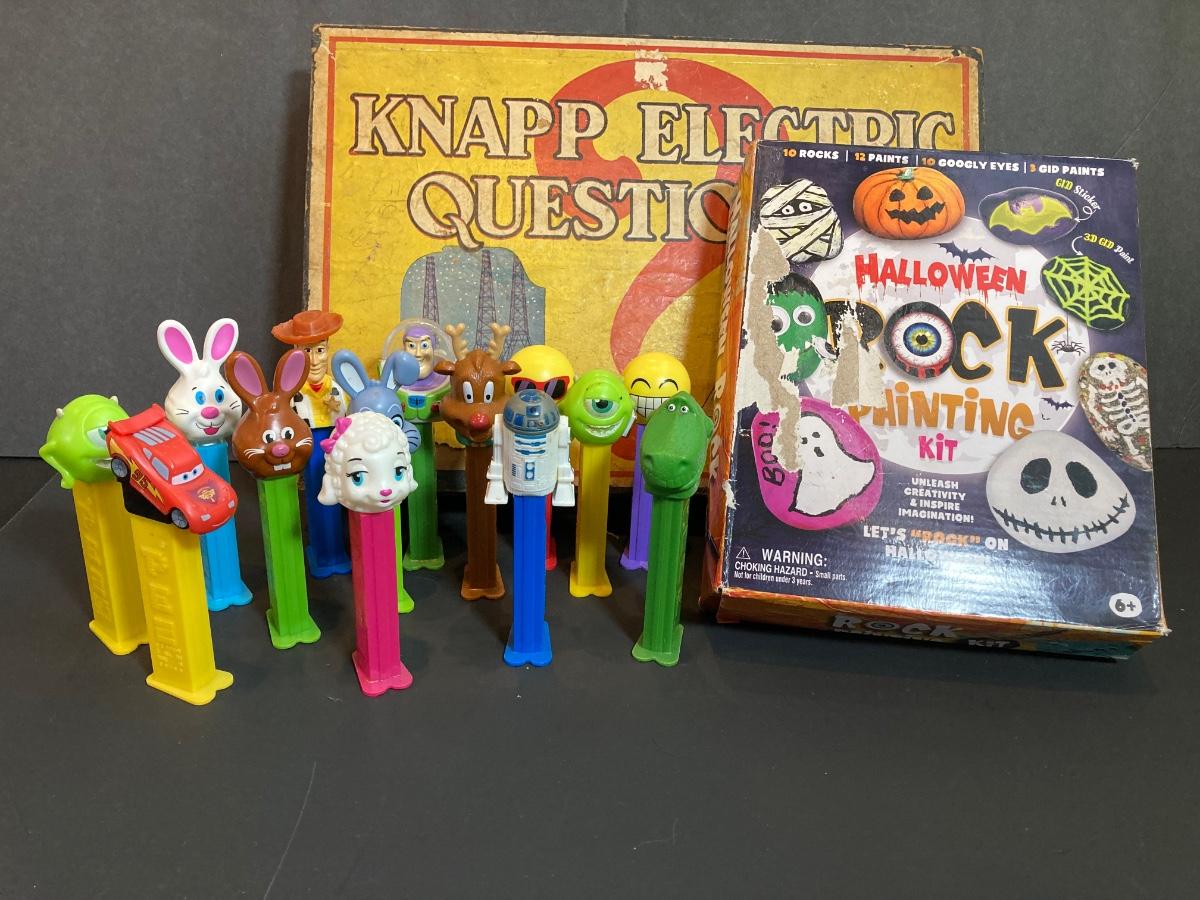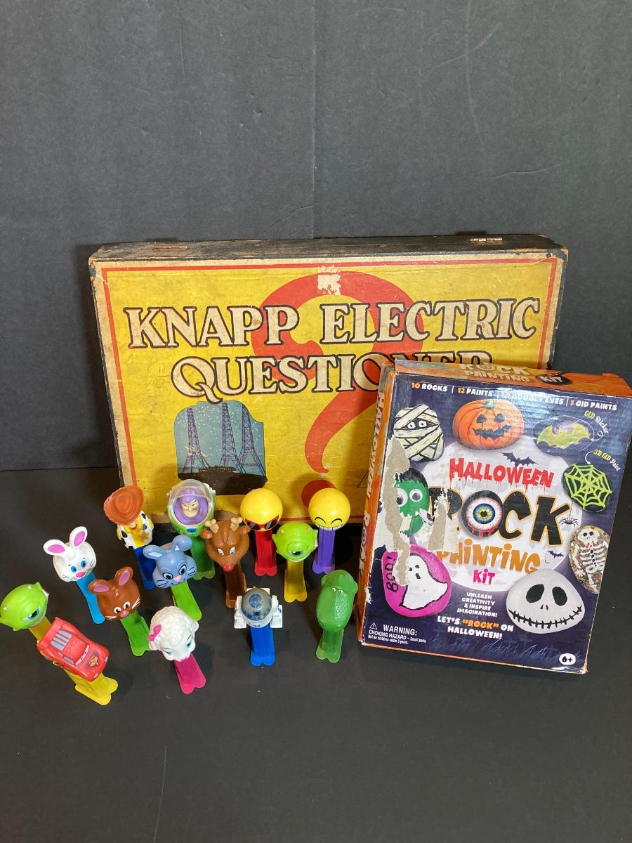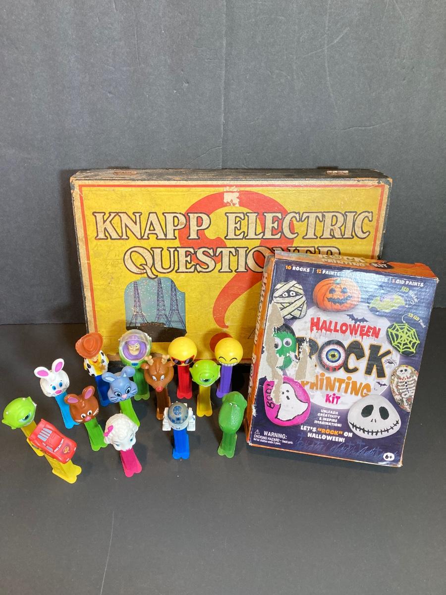 LOT 50: Vintage Knapp Electric Questioner Game, Pez and Halloween Rock Painting Kit