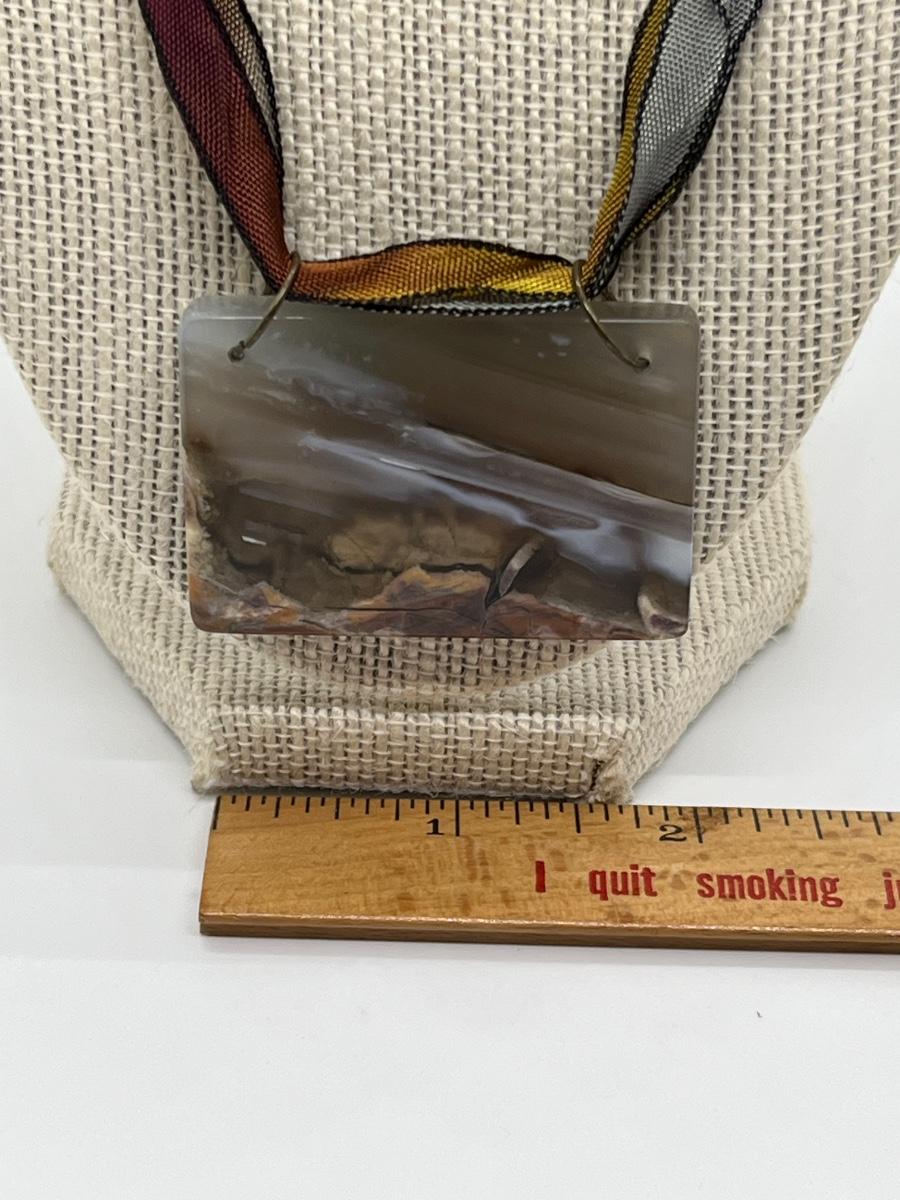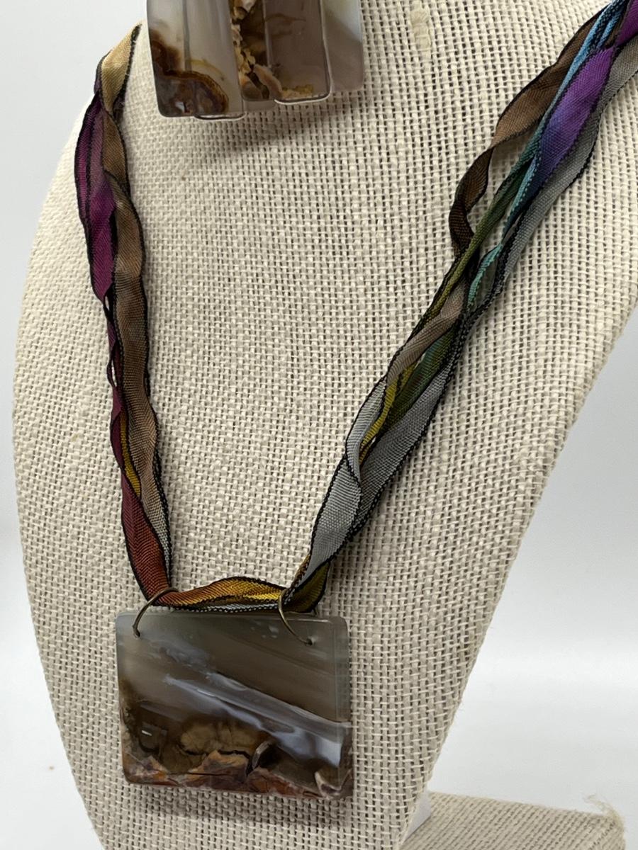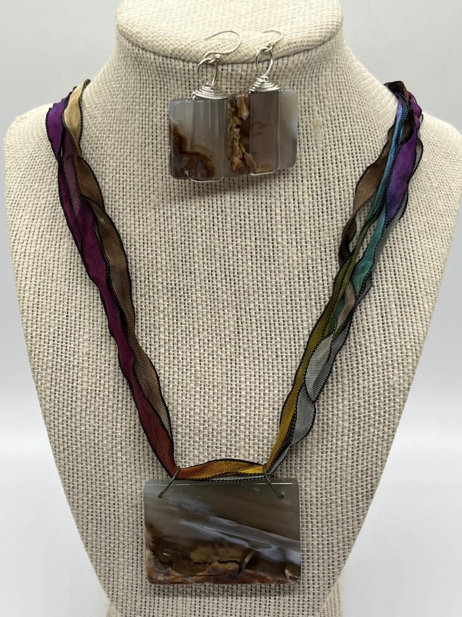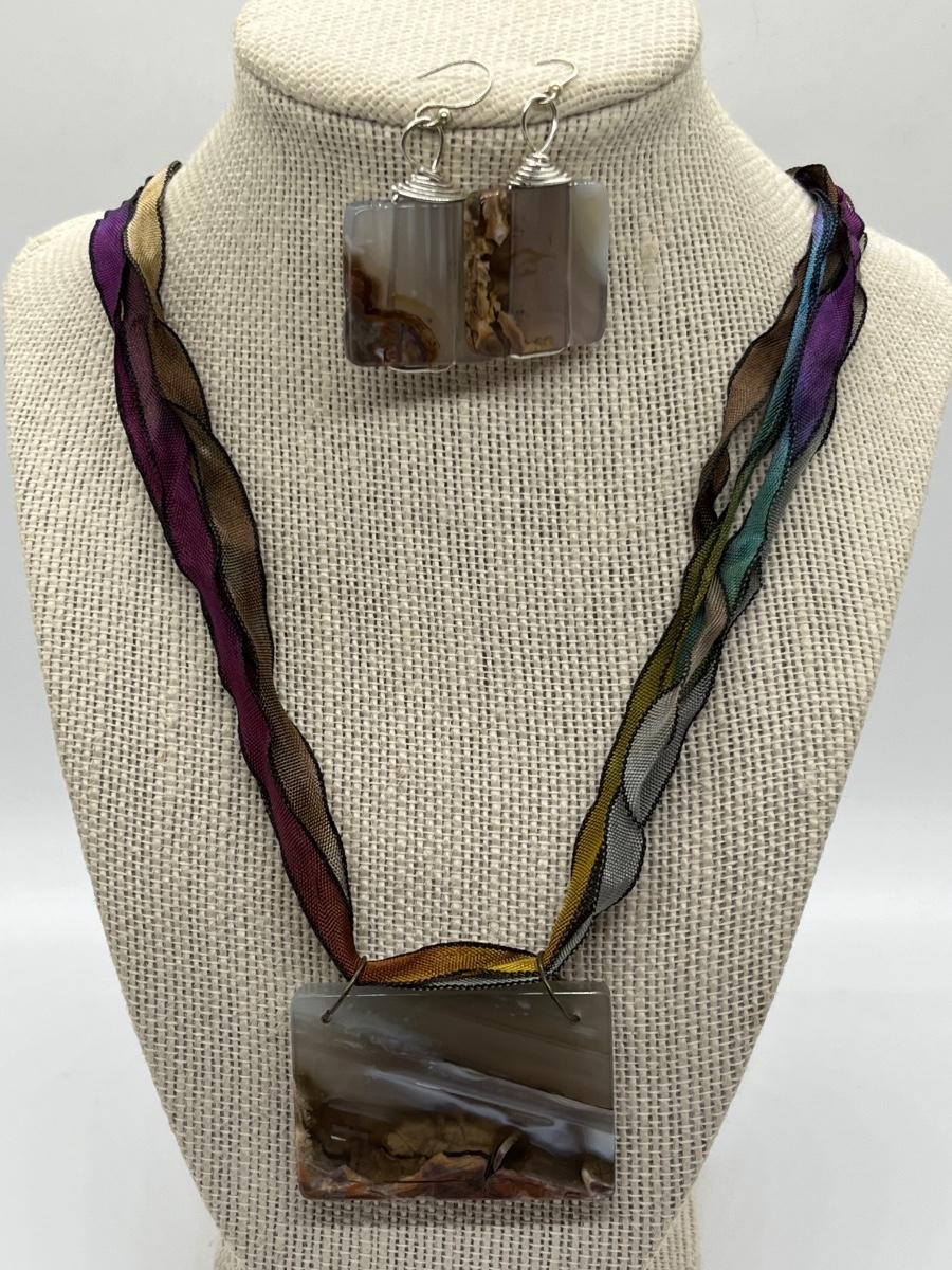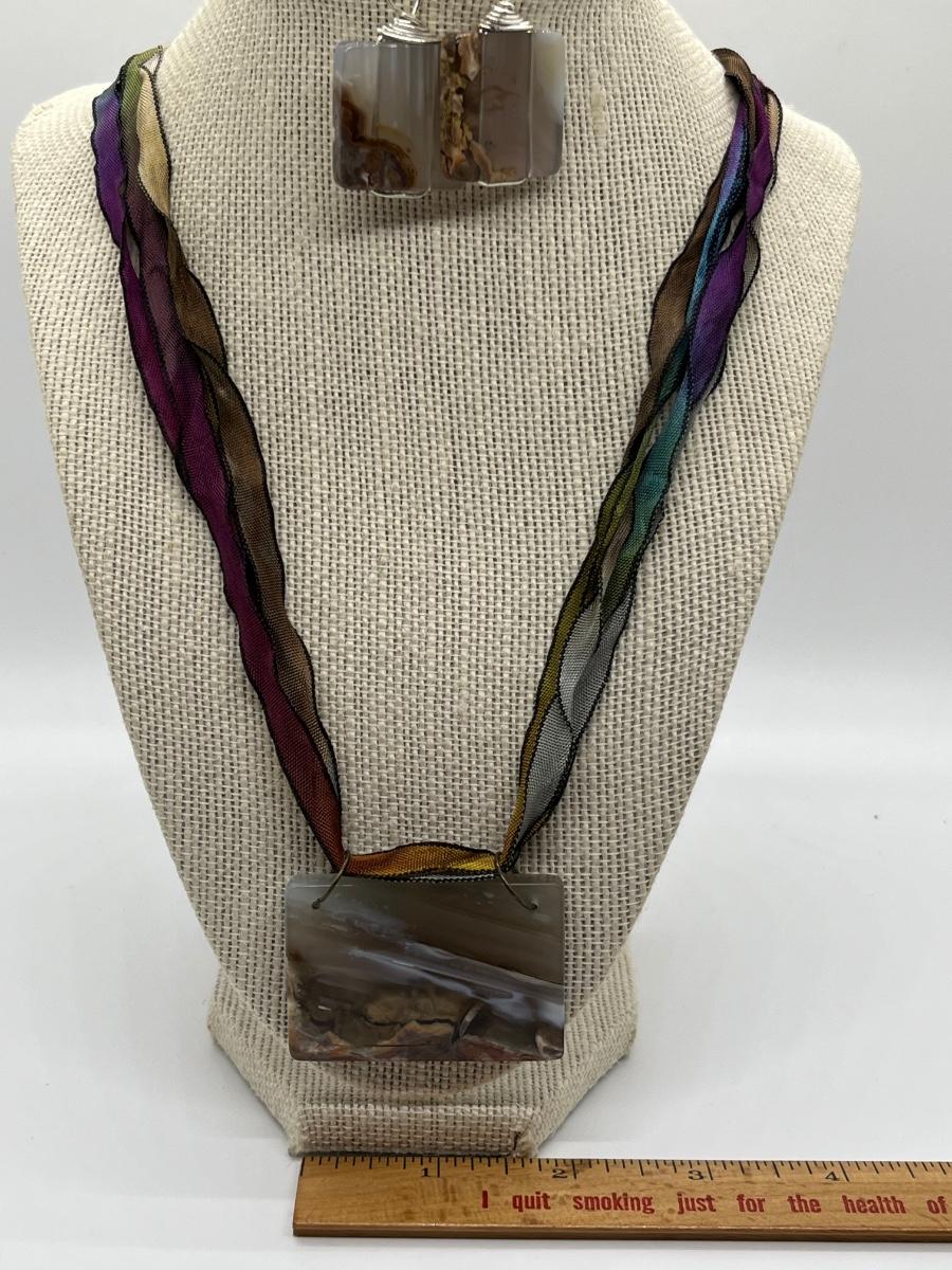 LOT 82: Natural Agate Gemstone Pierced Earrings and Pendant on 22" Ribbon Necklace
