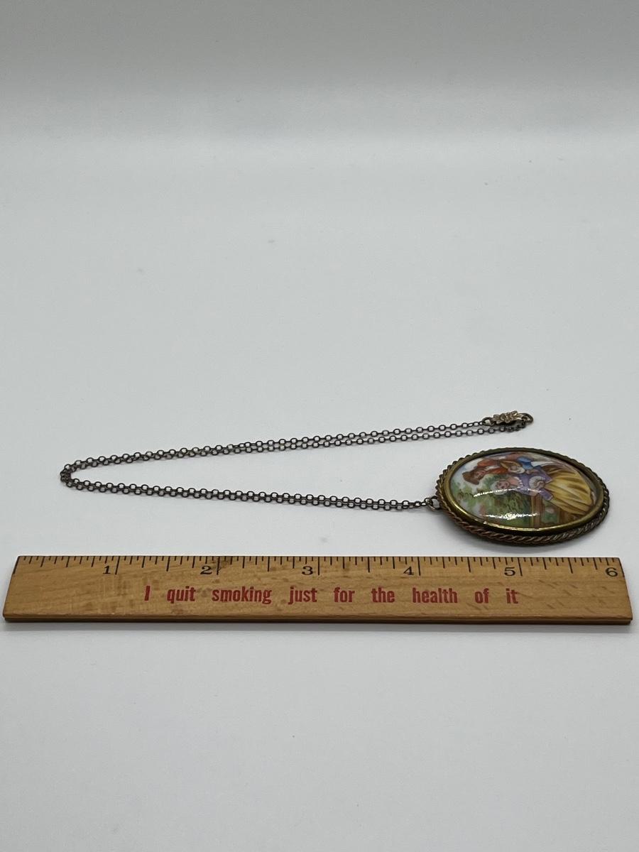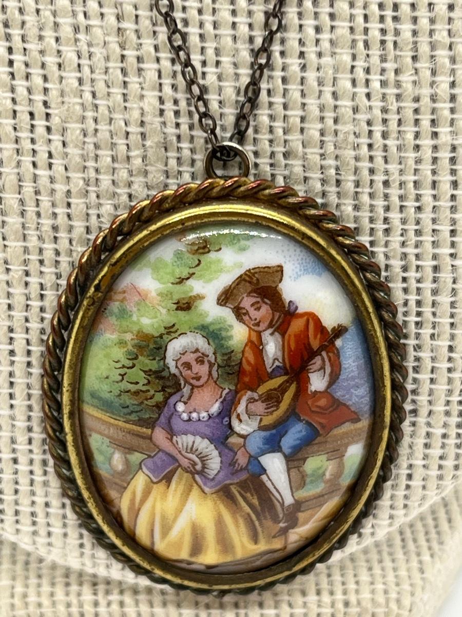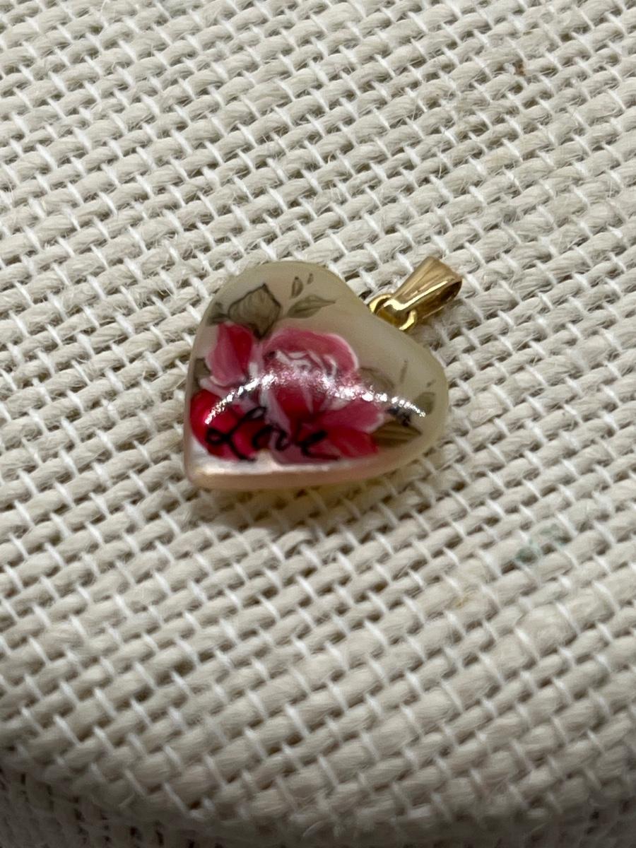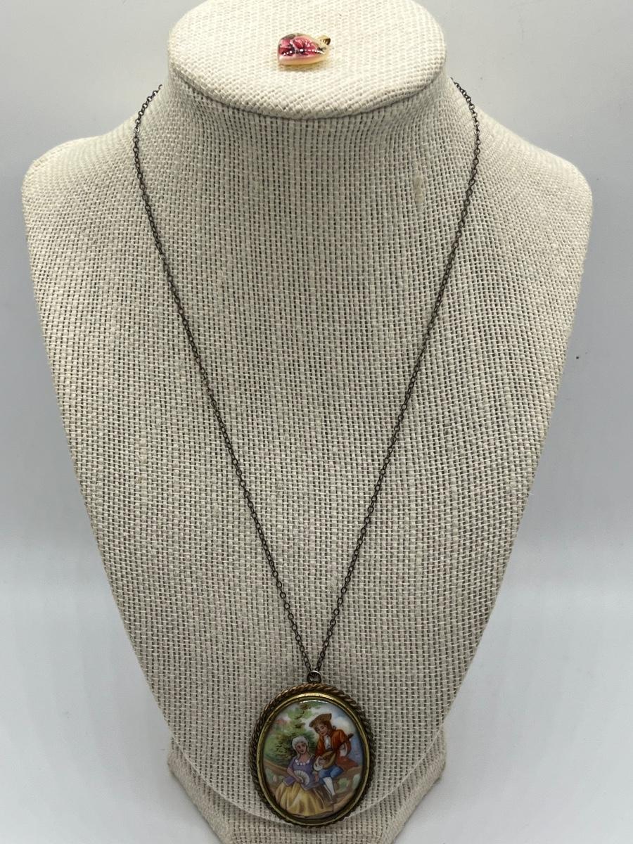 LOT 84: Antique Limoges France Handpainted Porcelain Pendant Set in Brass w/ Gold Overlay on 18" Sterling Chain + Mother of Pearl Heart Pendant
