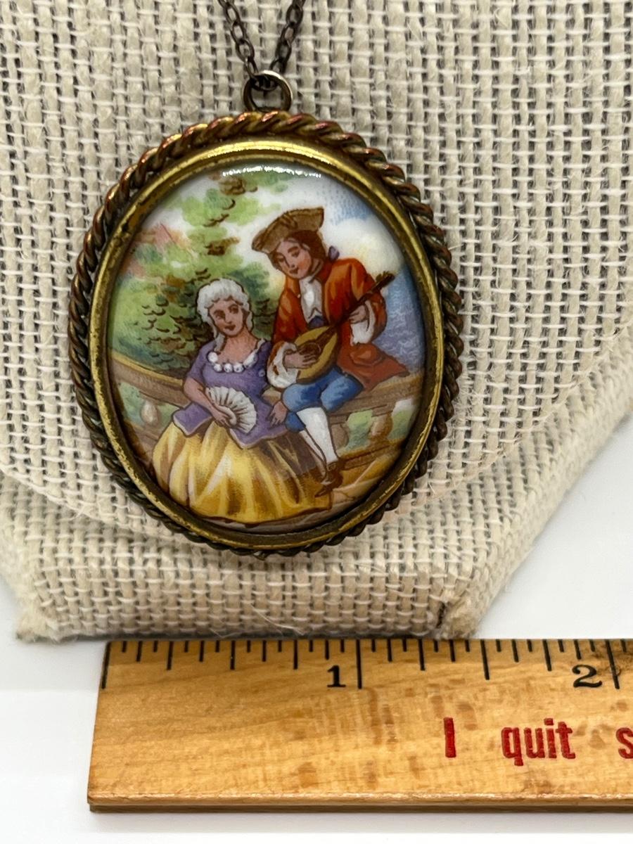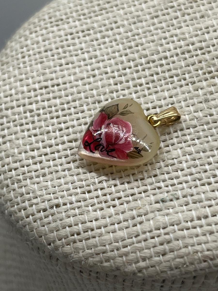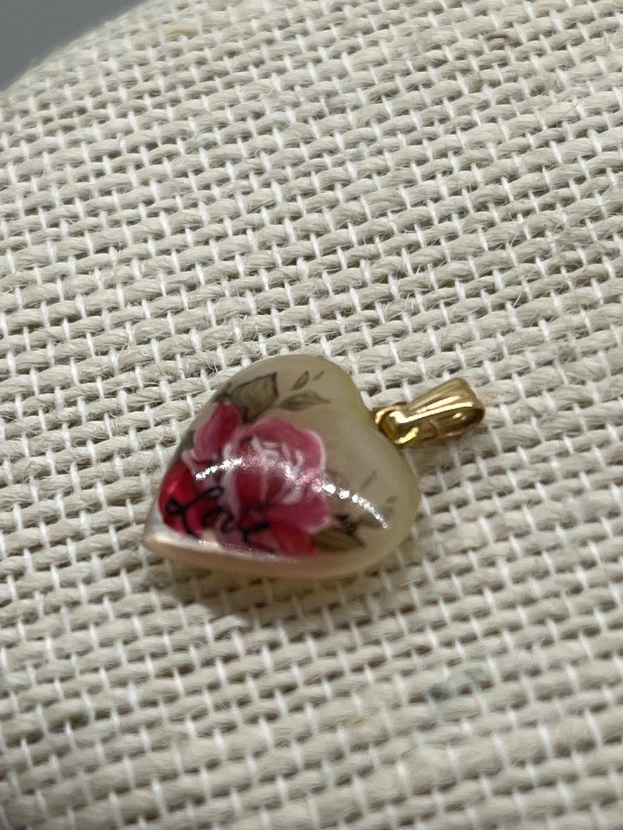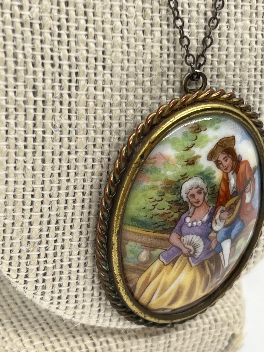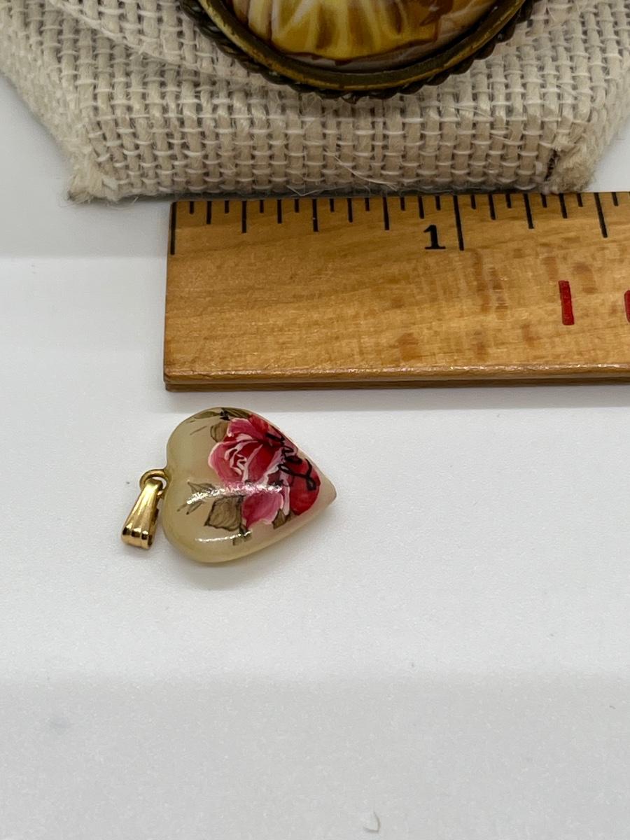 LOT 84: Antique Limoges France Handpainted Porcelain Pendant Set in Brass w/ Gold Overlay on 18" Sterling Chain + Mother of Pearl Heart Pendant