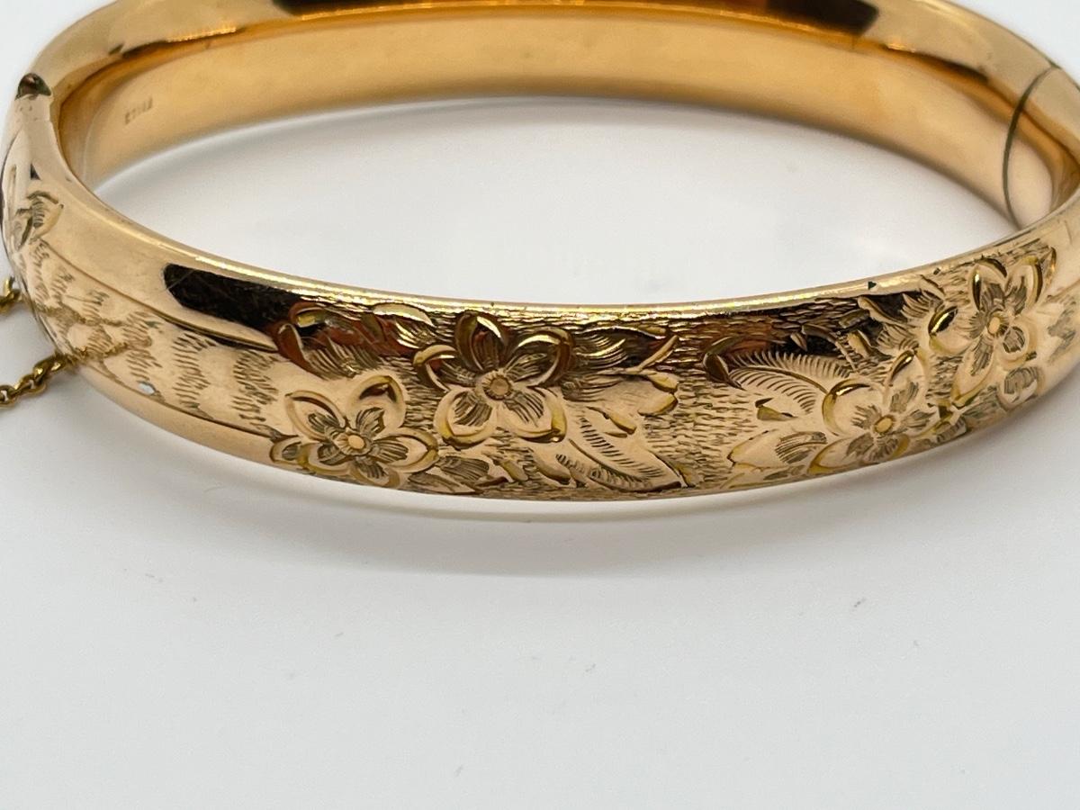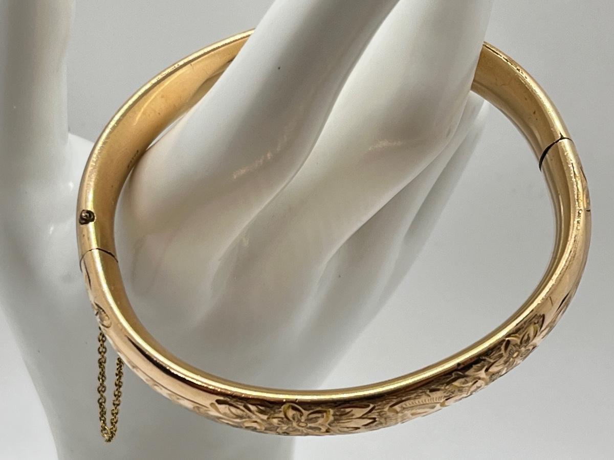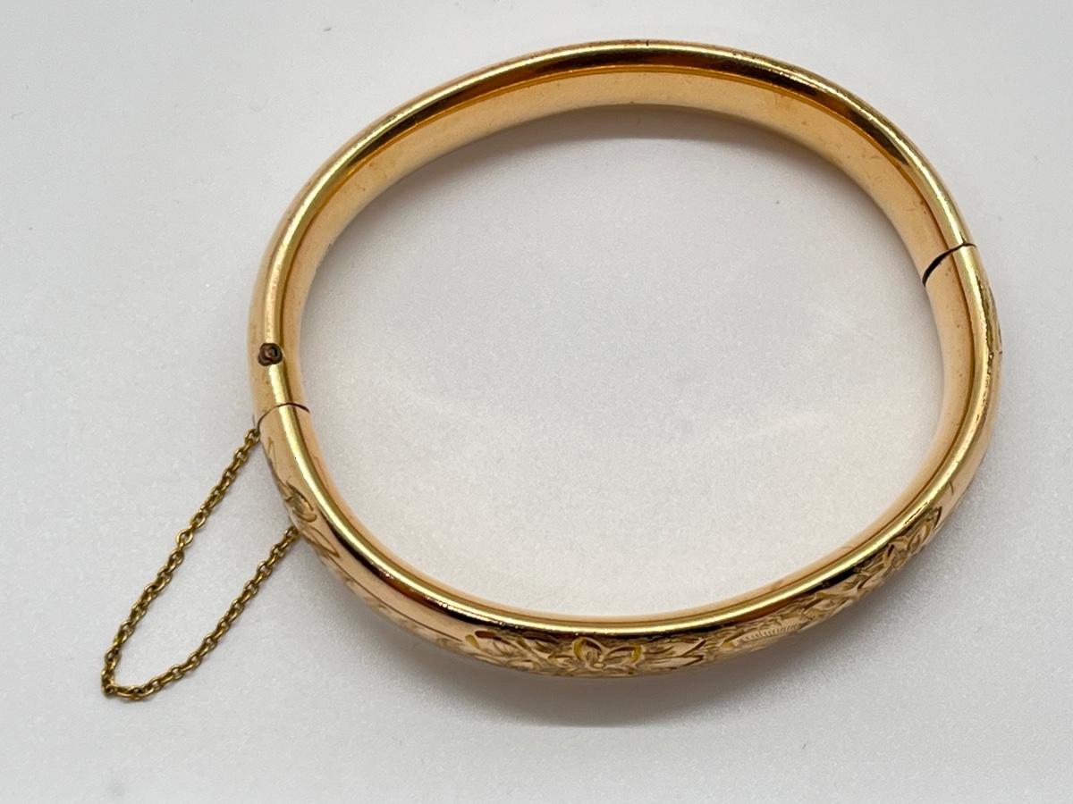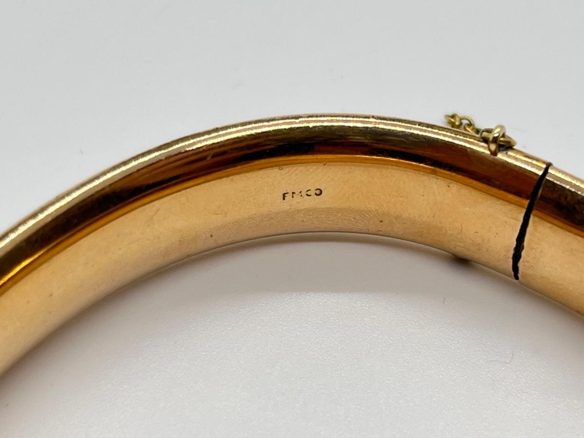 LOT 114: Vintage FMCO Gold Filled Hinged Bangle Bracelet w/ Safety Chain