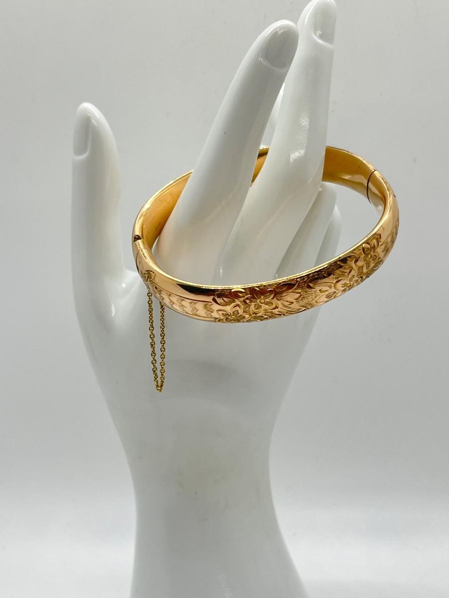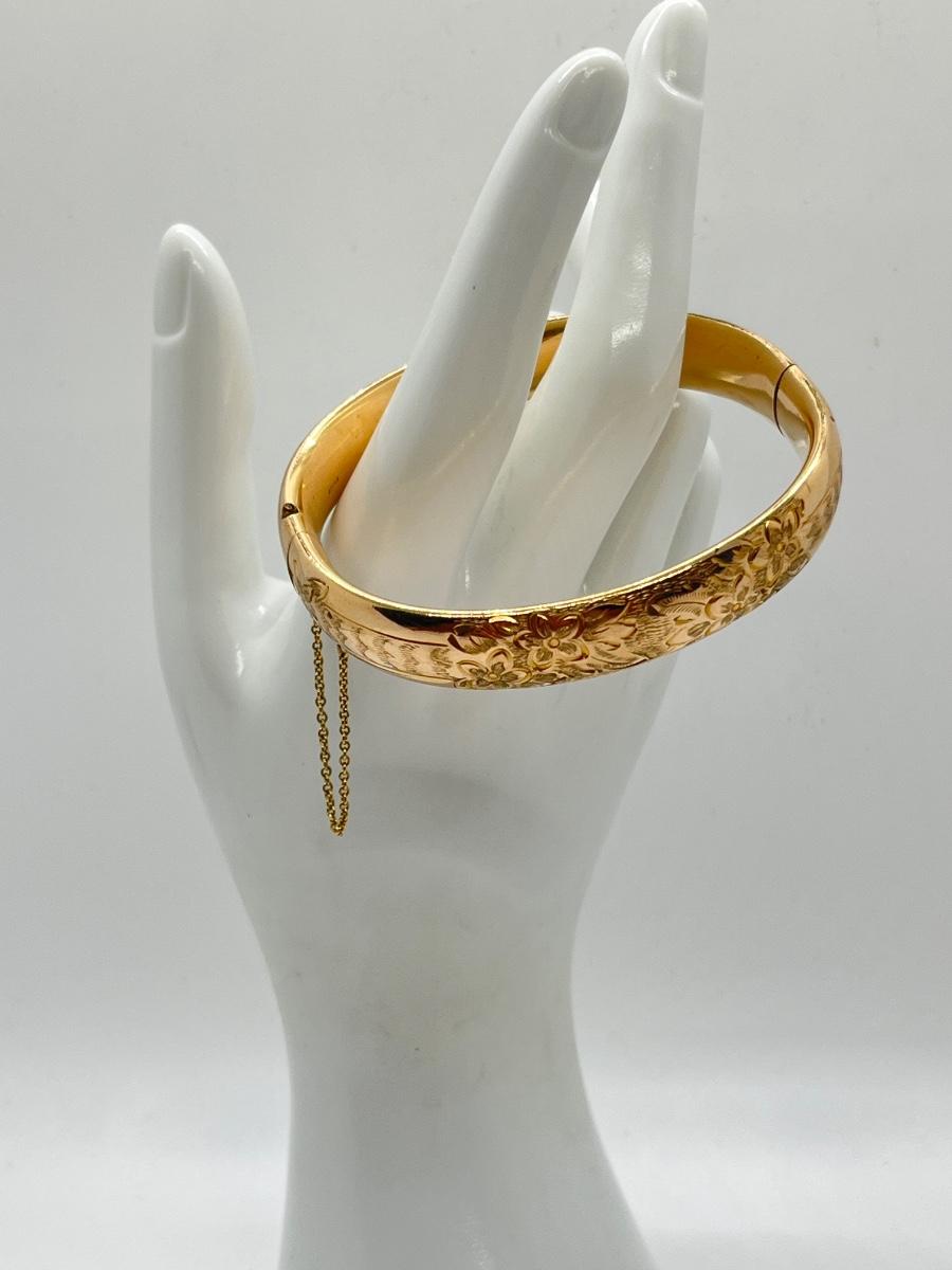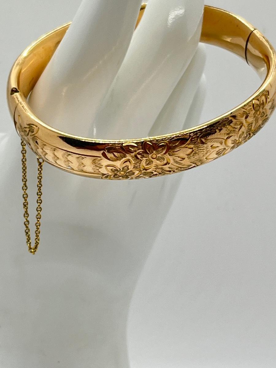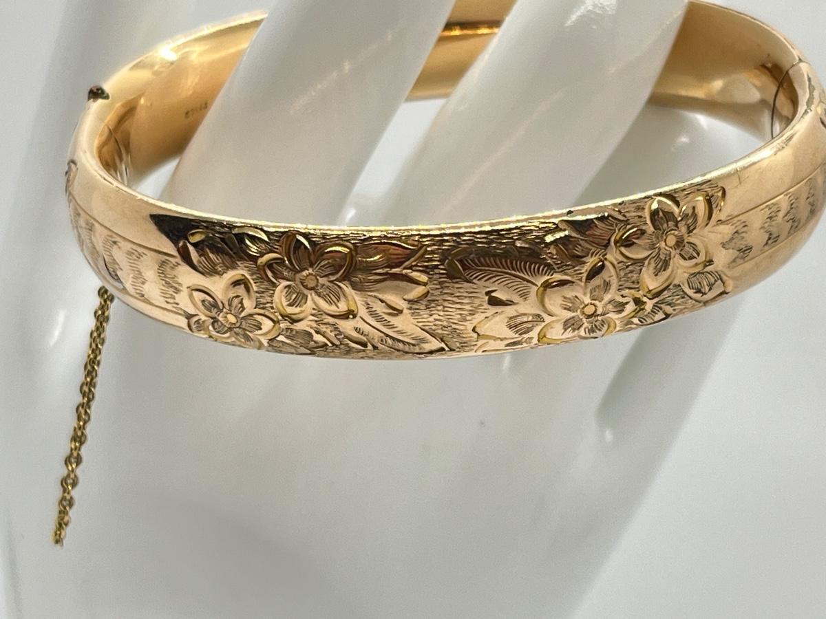 LOT 114: Vintage FMCO Gold Filled Hinged Bangle Bracelet w/ Safety Chain