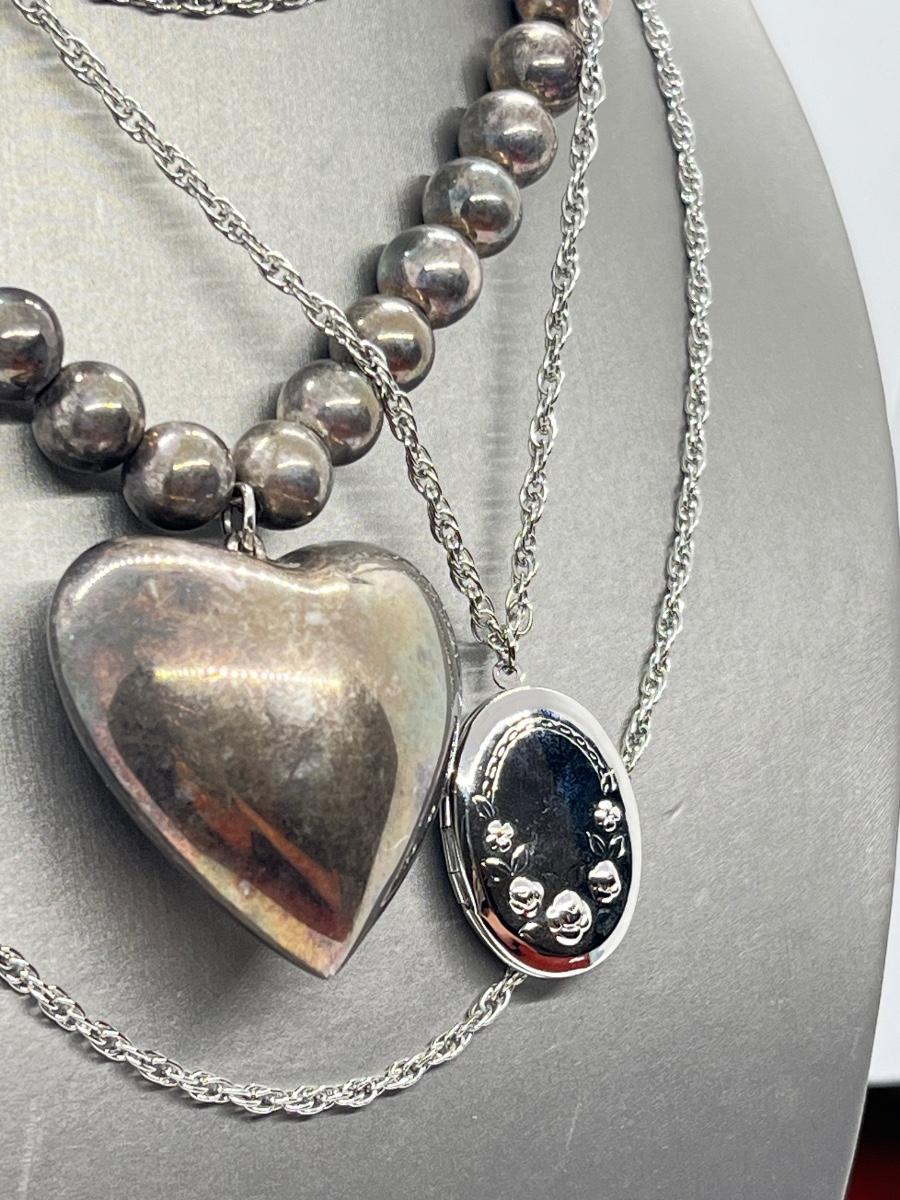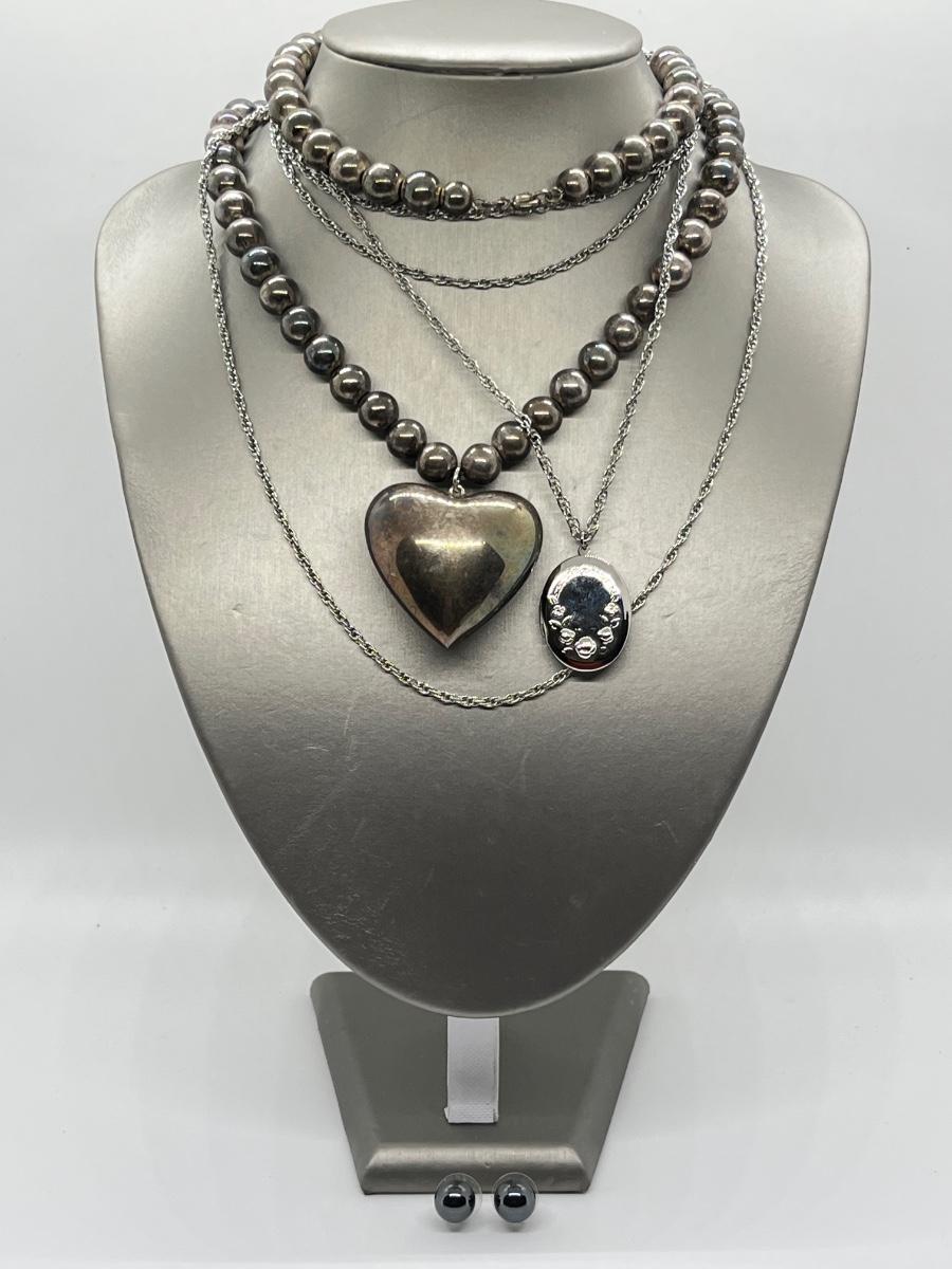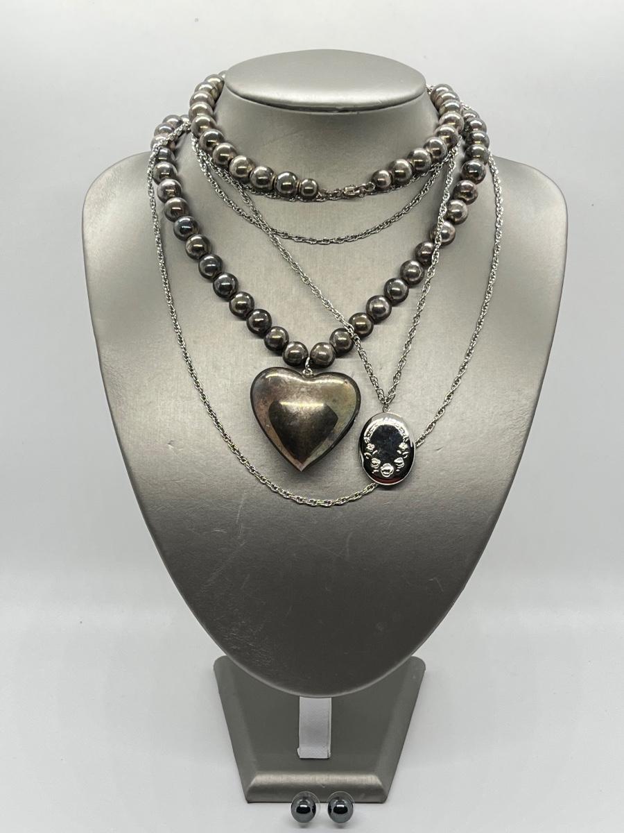 LOT 127: Vintage Beaded Heart Necklace, Pierced Earrings and Floral Silvertone Locket Necklace