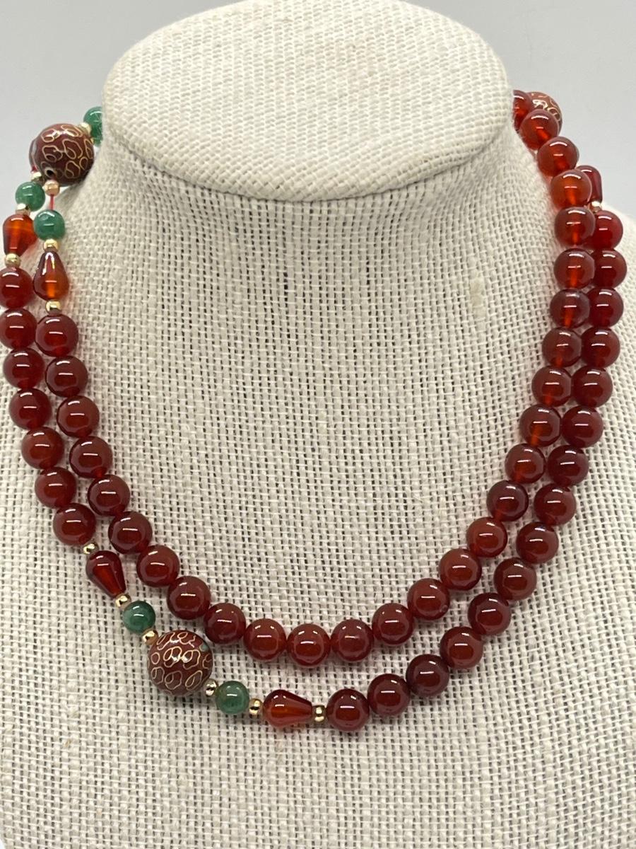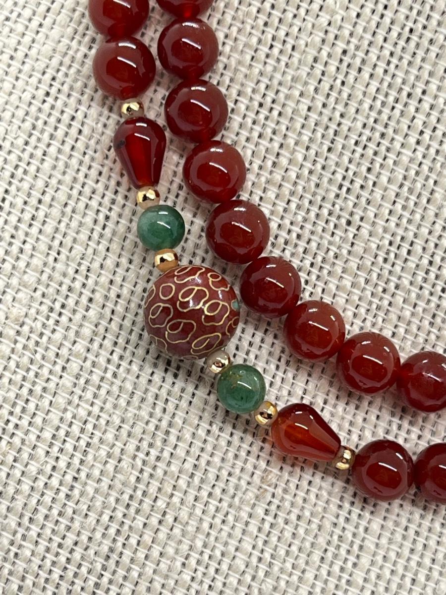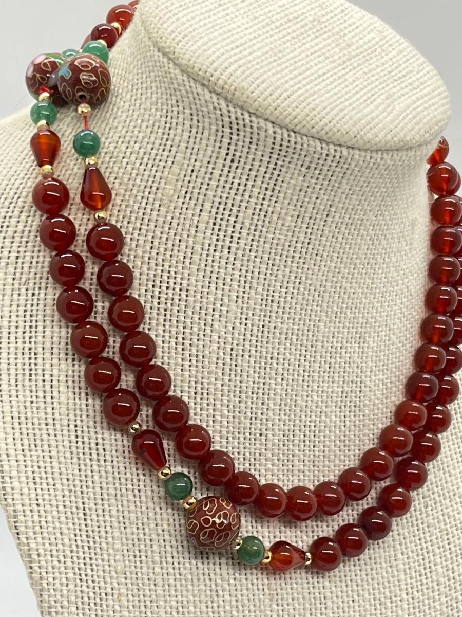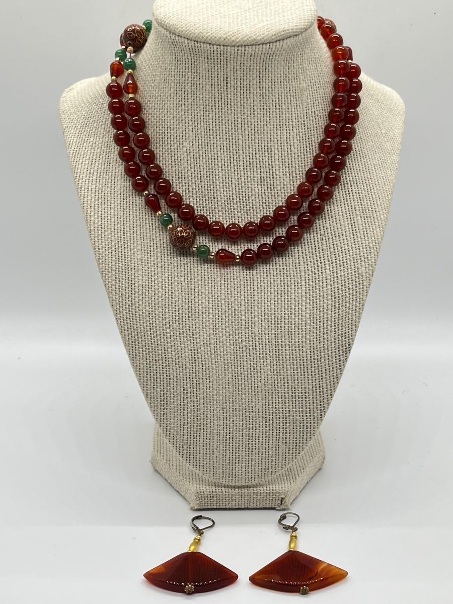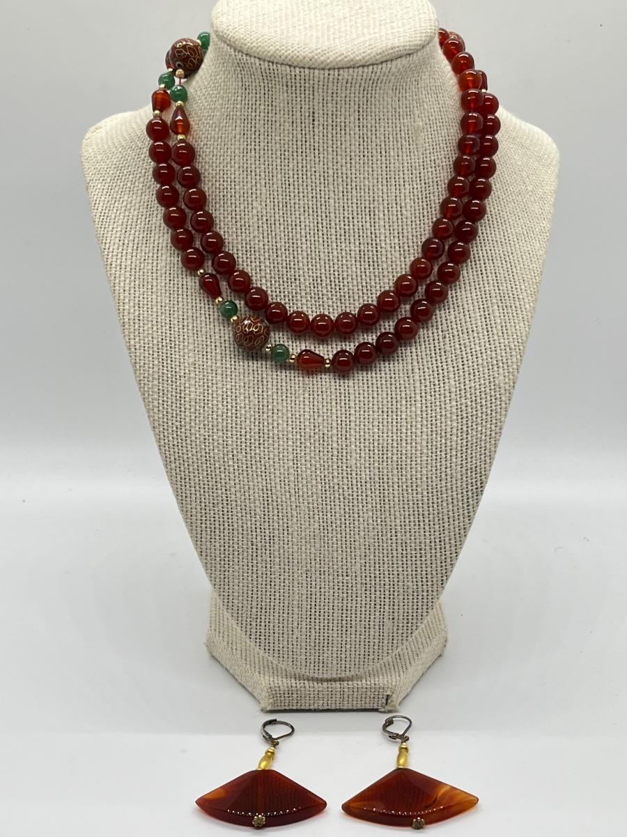 LOT 148: Cinnabar, Jade & Cloisonne Bead Necklace with Natural Gemstone Pierced Earrings