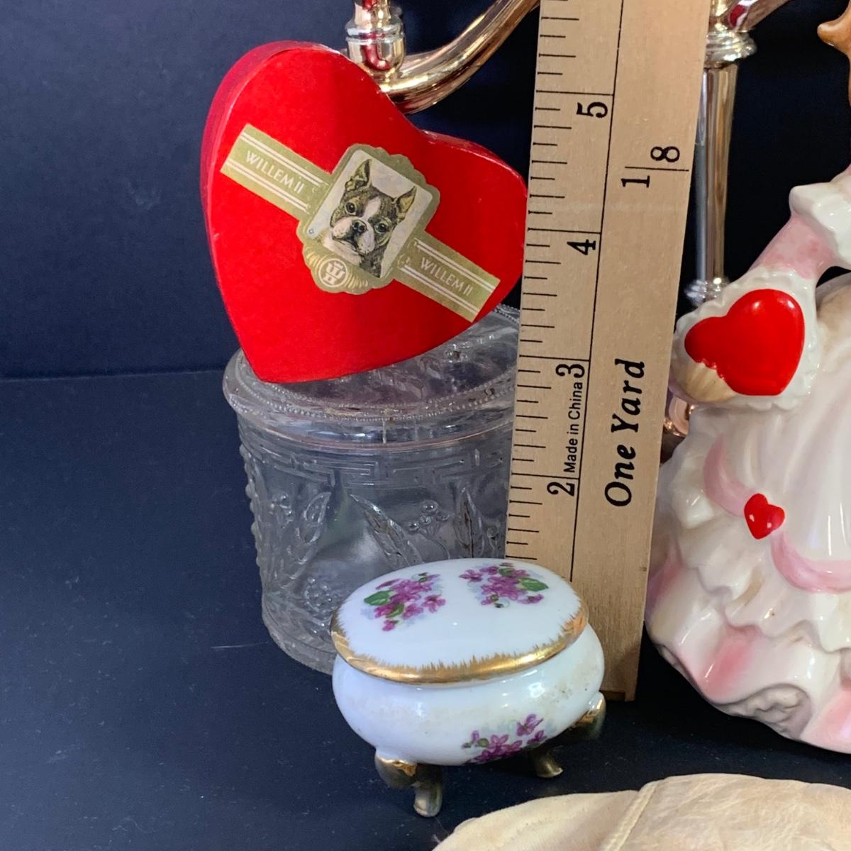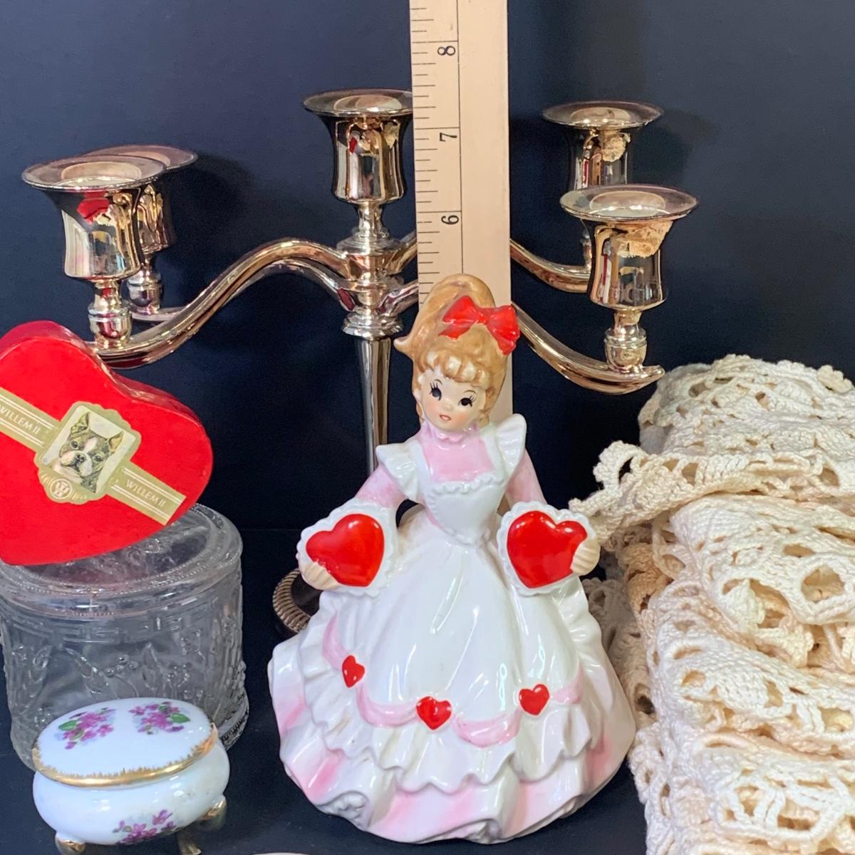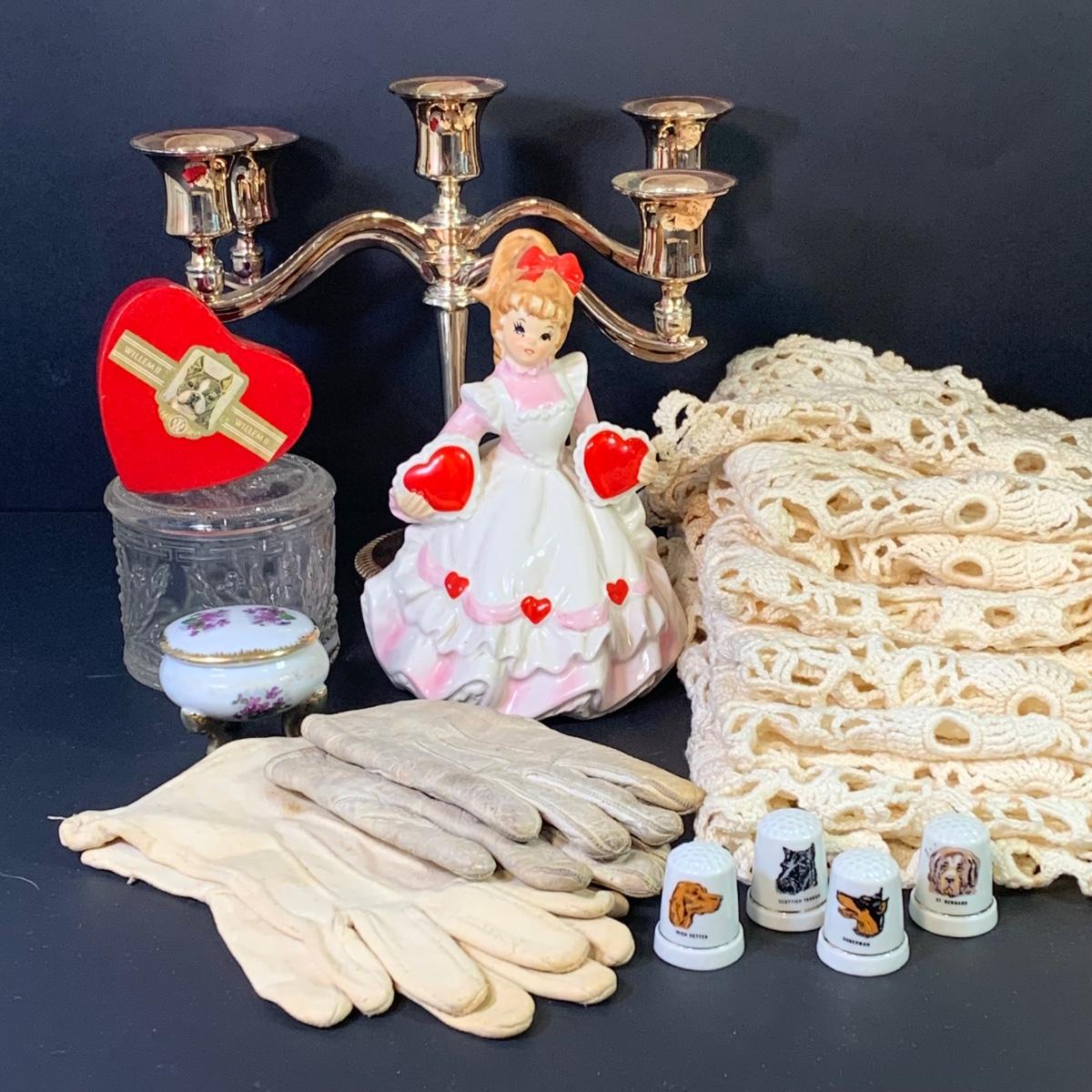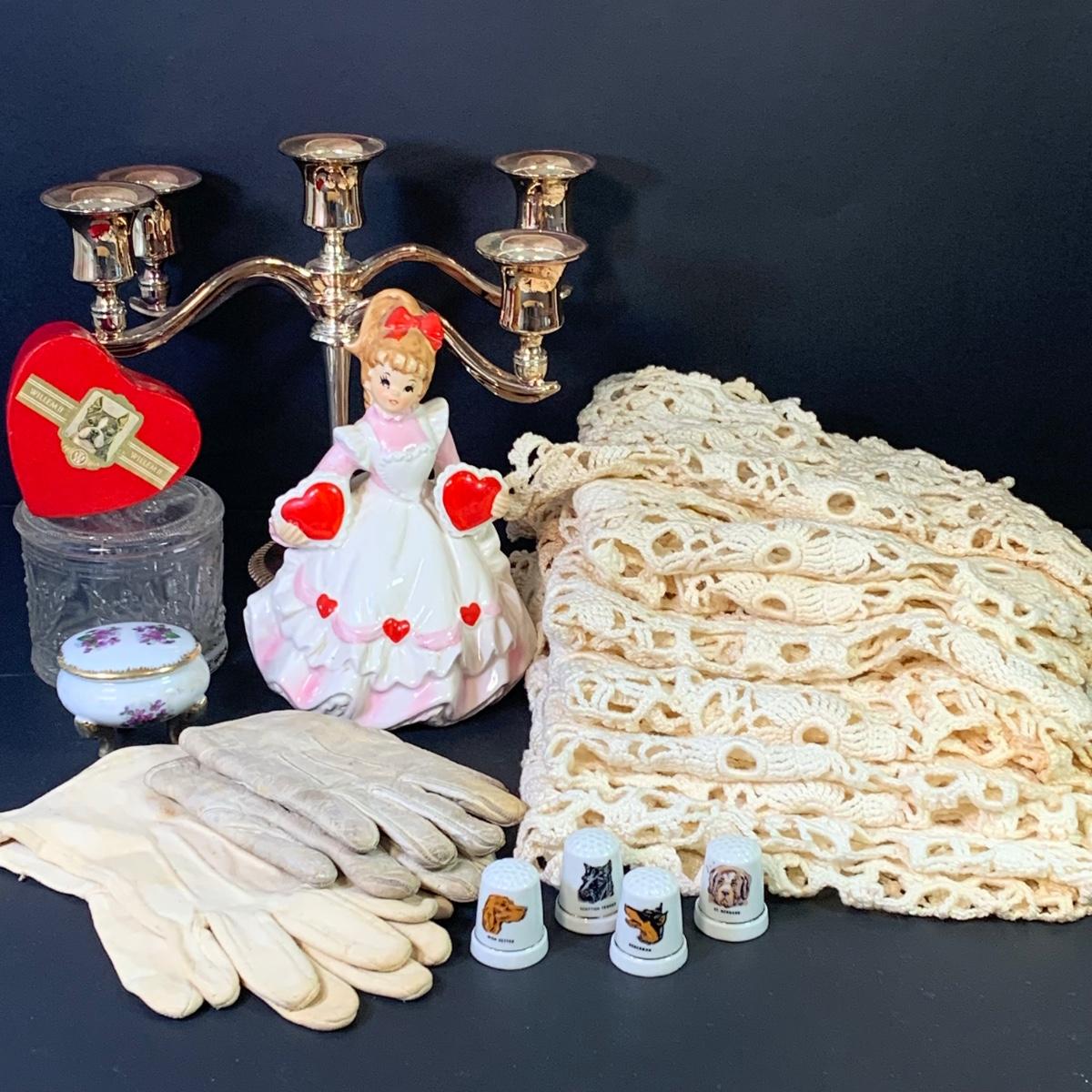 LOT 15R: Vintage Lefton Valentine Music Box, H&P Childrens Gloves, Crochets Doilies, & More