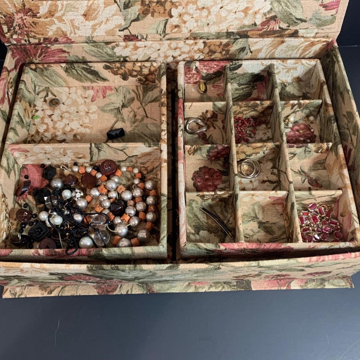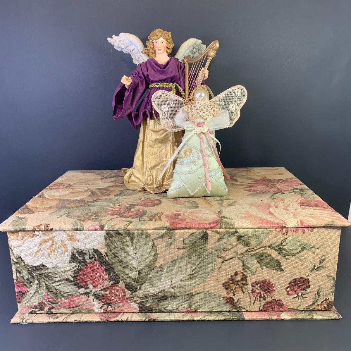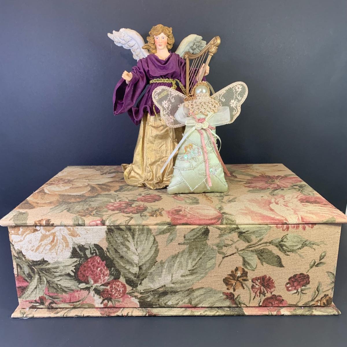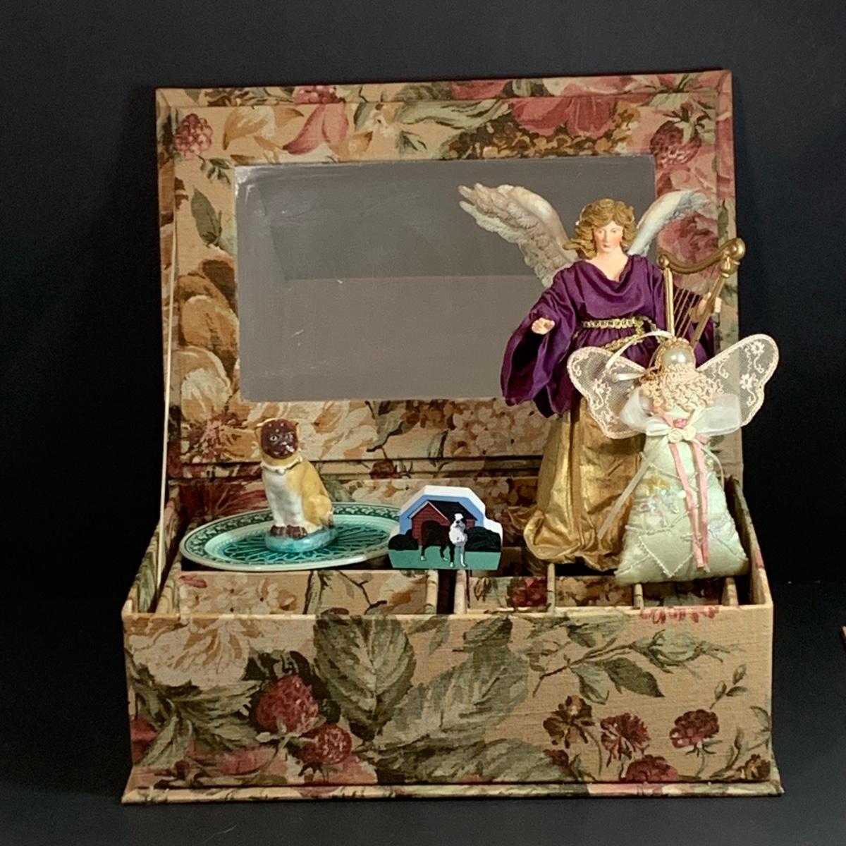 LOT 18R: Floral Cloth Jewelry Box w/Mirror & Contents, Angels