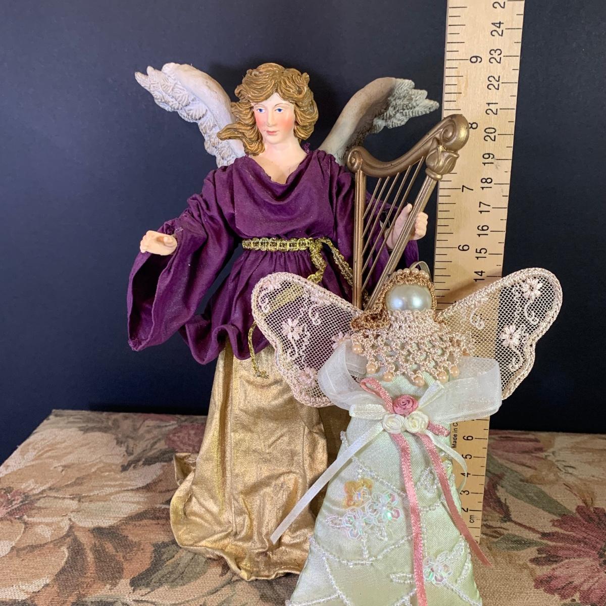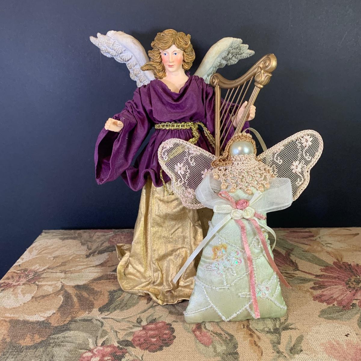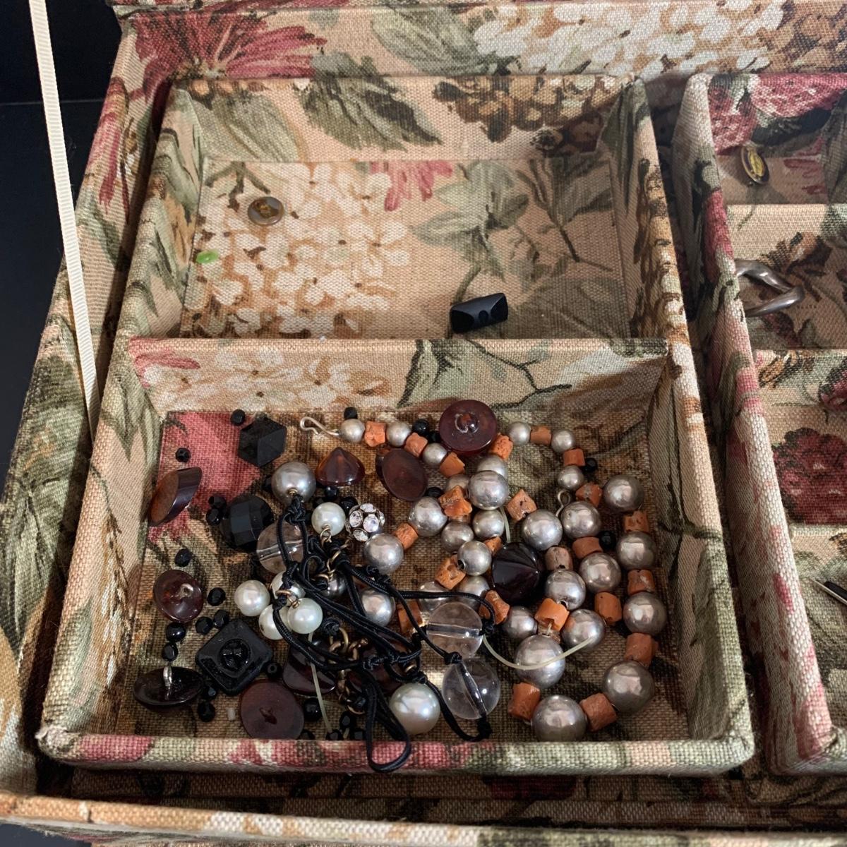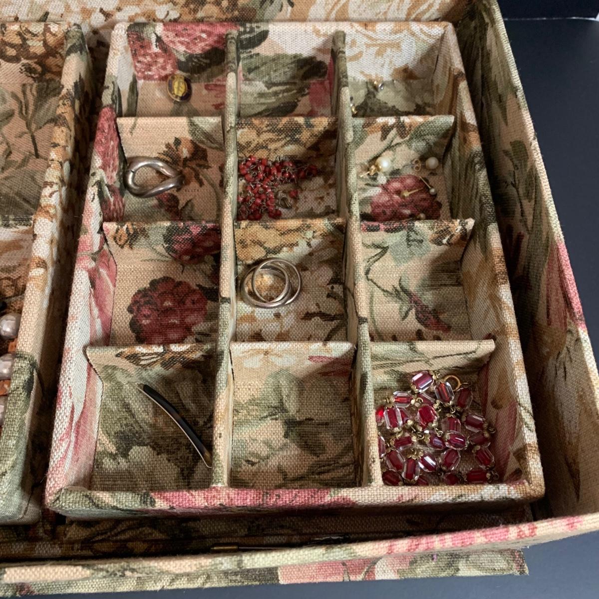 LOT 18R: Floral Cloth Jewelry Box w/Mirror & Contents, Angels