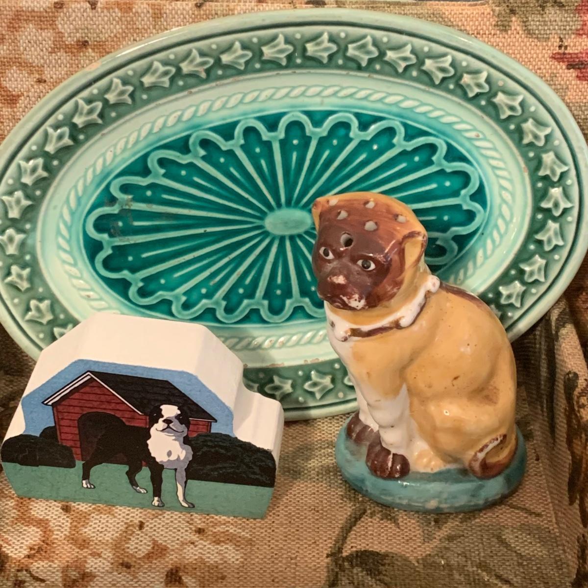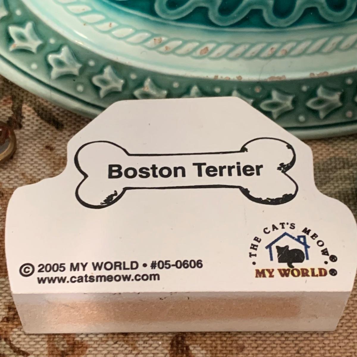 Contents of box: craft jewelry, The Cat's Meow Boston Terrier, trinket dish.