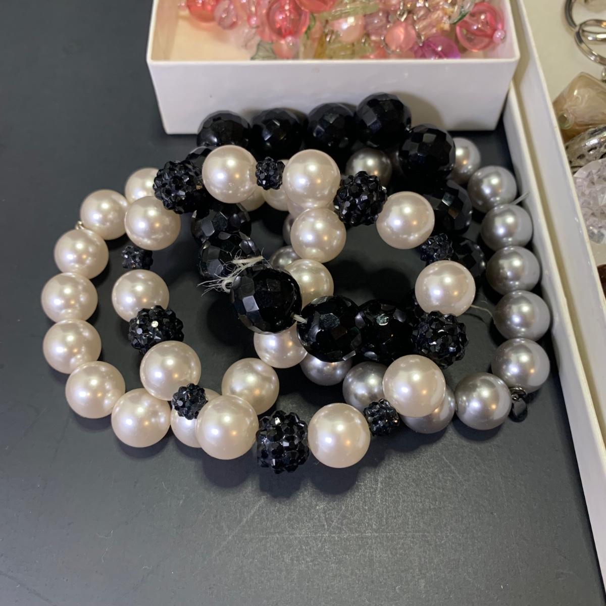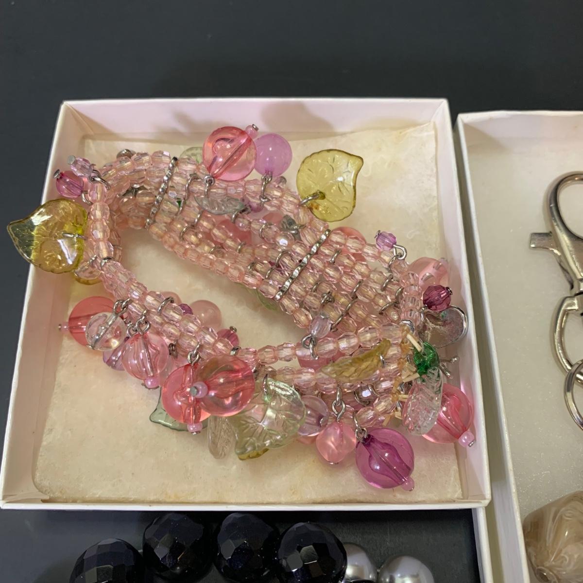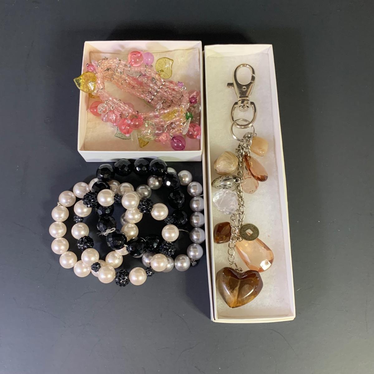 LOT 22R: Heart & Jewels Key Chain, Black & White Stretch Bracelets including a RMN Faux Pearl, Pink & Silver Tone Stretch Bracelet