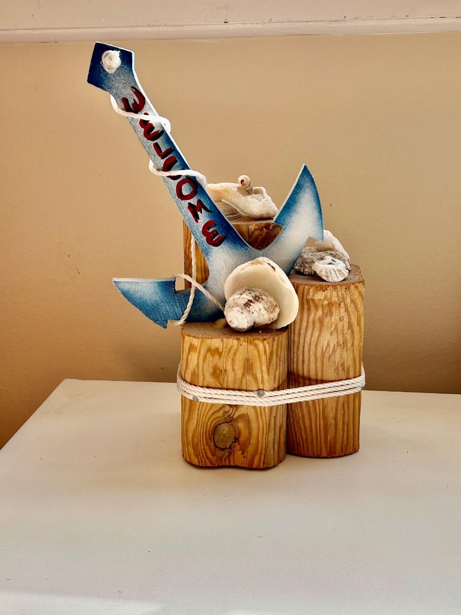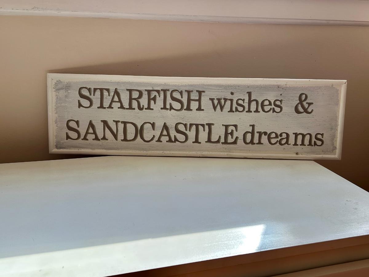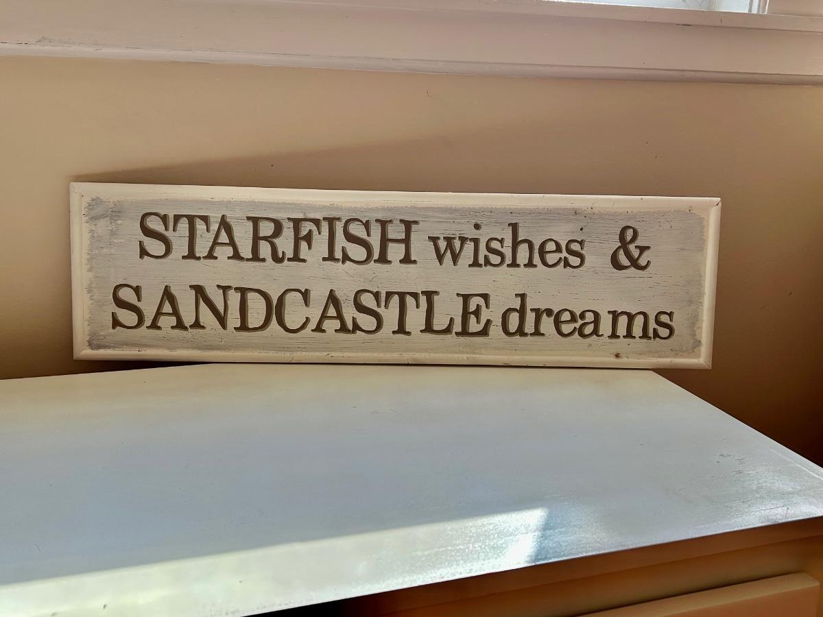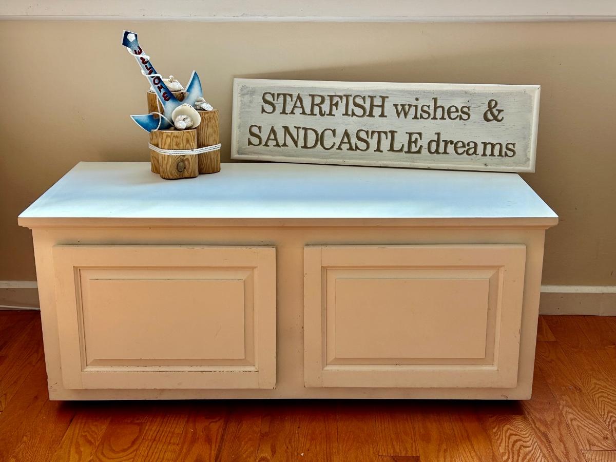 White table/media stand on wheels. 43"x20"x19". Collection also includes beach sign and decor.