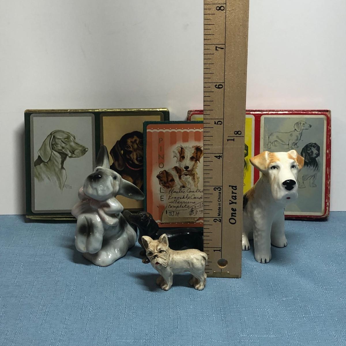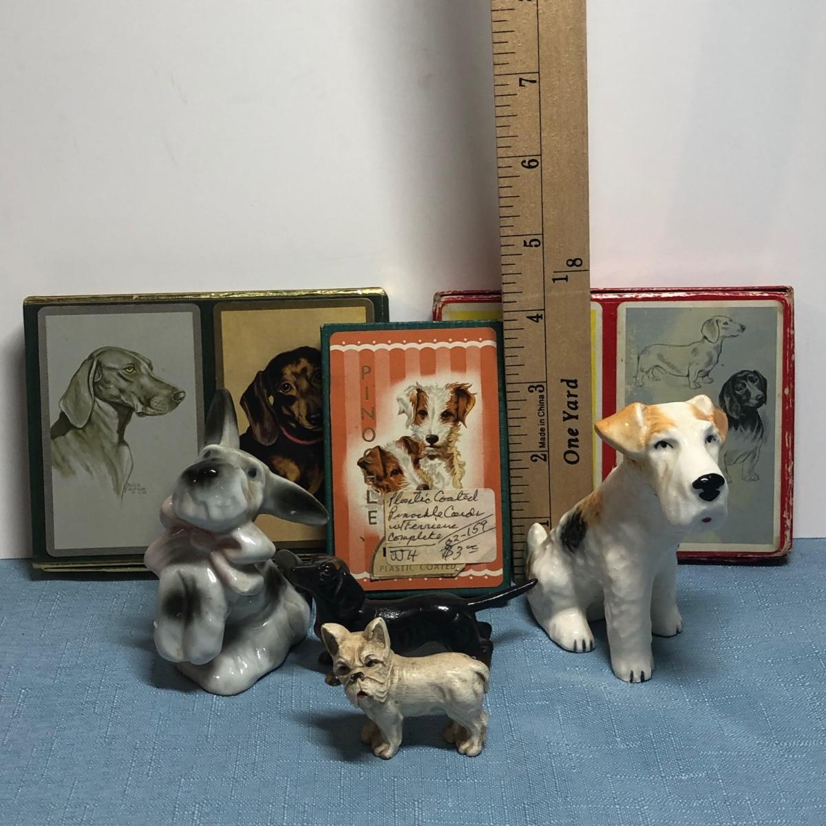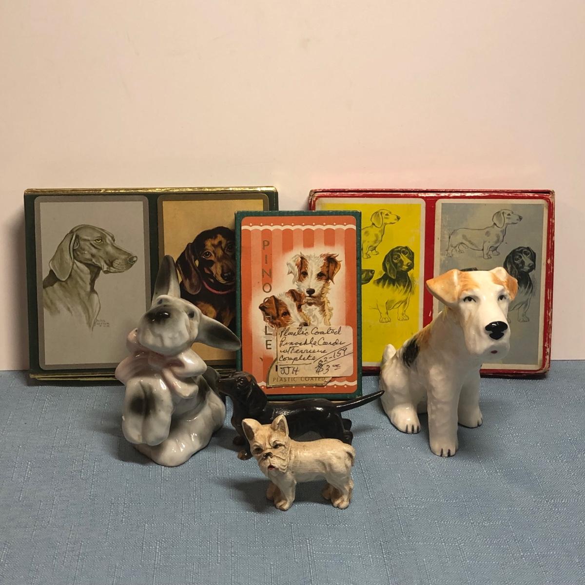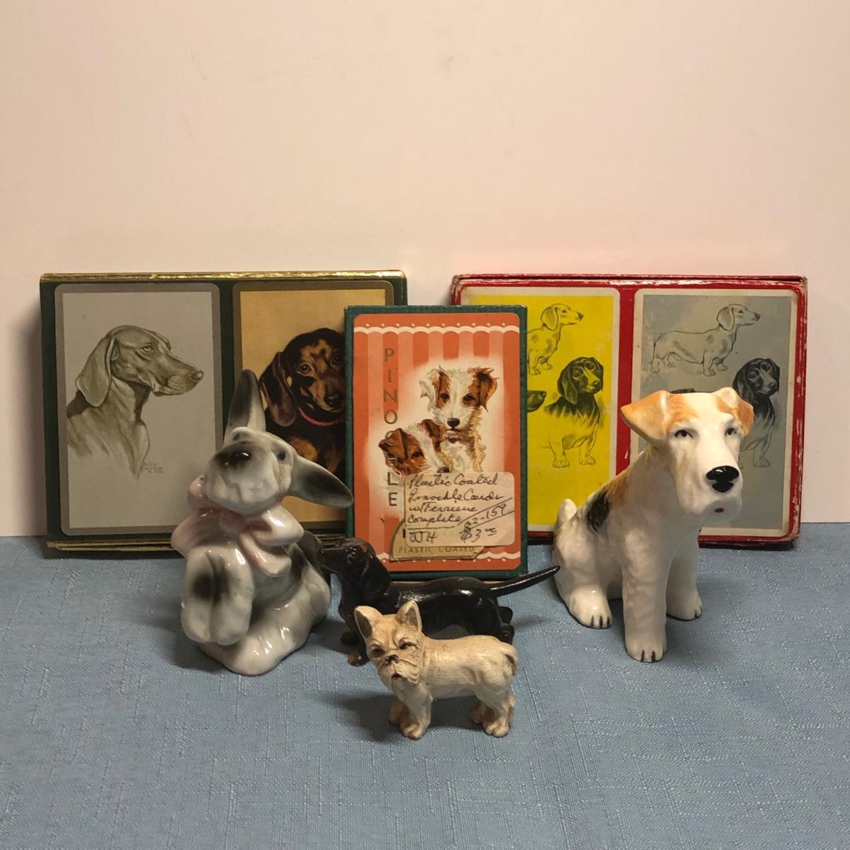 LOT 87M: Vintage Congress Pinochle Dog Cards, Hamilton Dachshund Playing Cards, Plastic Coated Pinochle Terrier Cards w/ Ceramic Dog Figurines