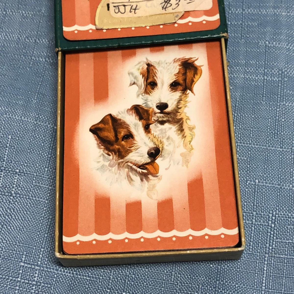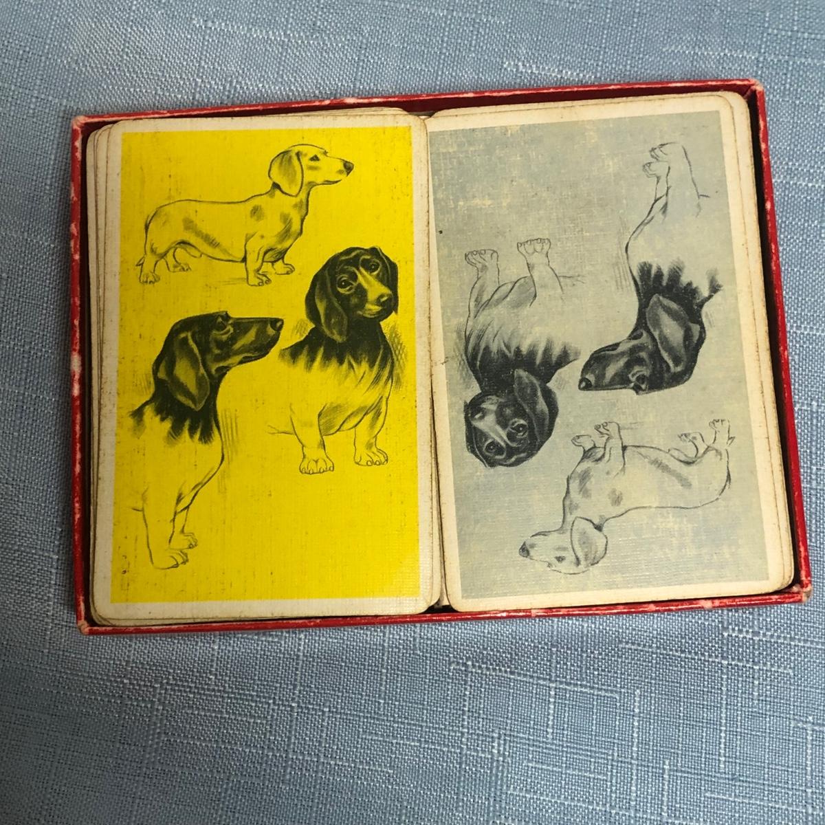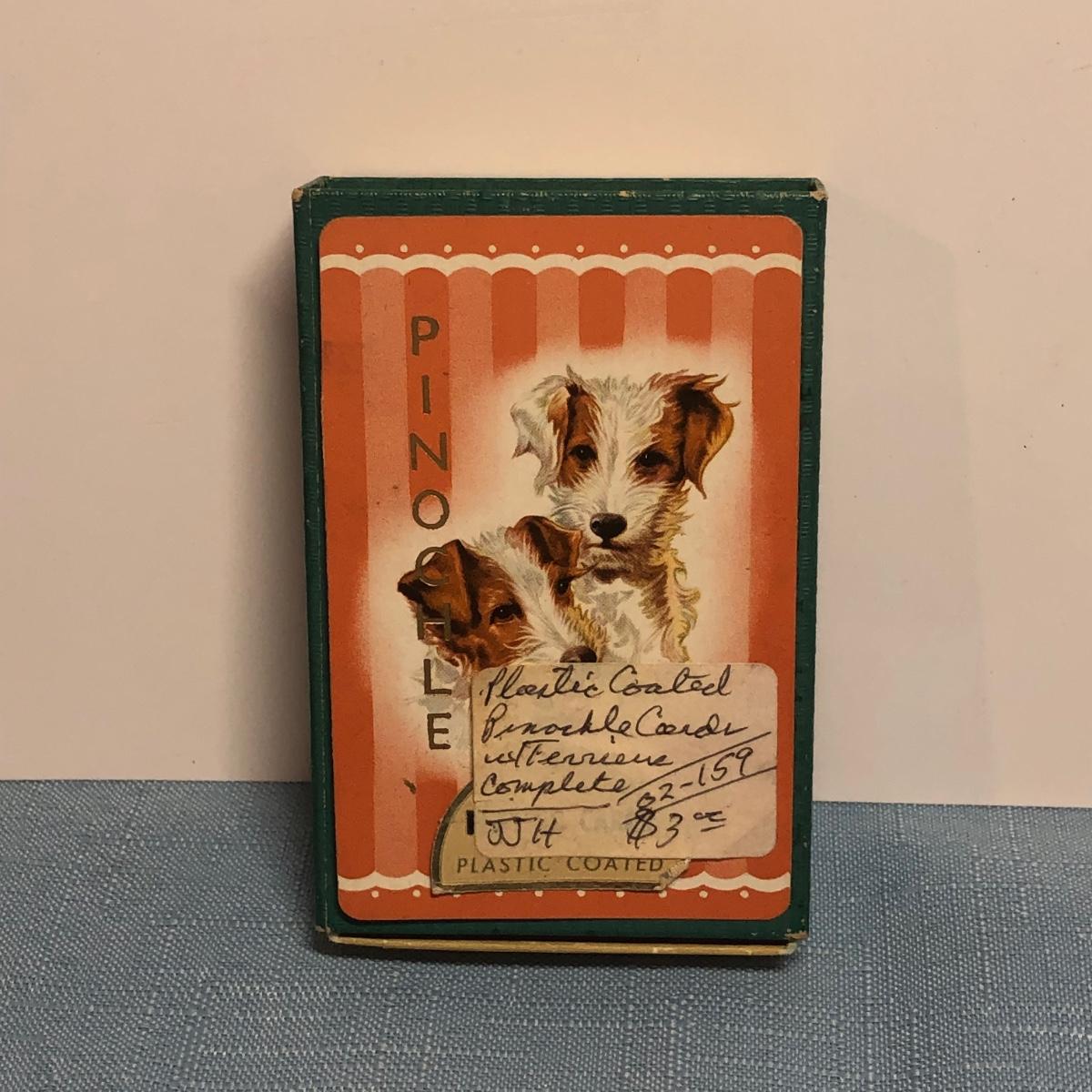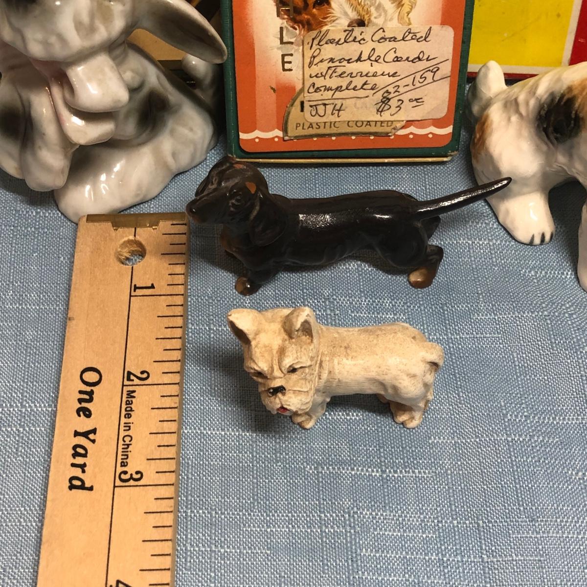 LOT 87M: Vintage Congress Pinochle Dog Cards, Hamilton Dachshund Playing Cards, Plastic Coated Pinochle Terrier Cards w/ Ceramic Dog Figurines