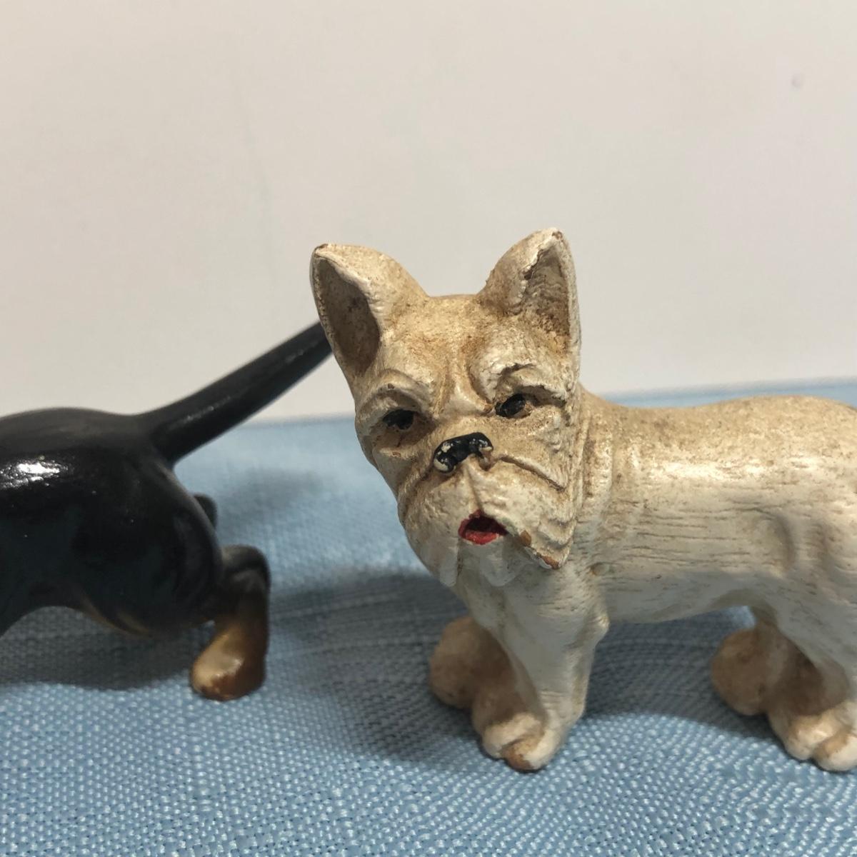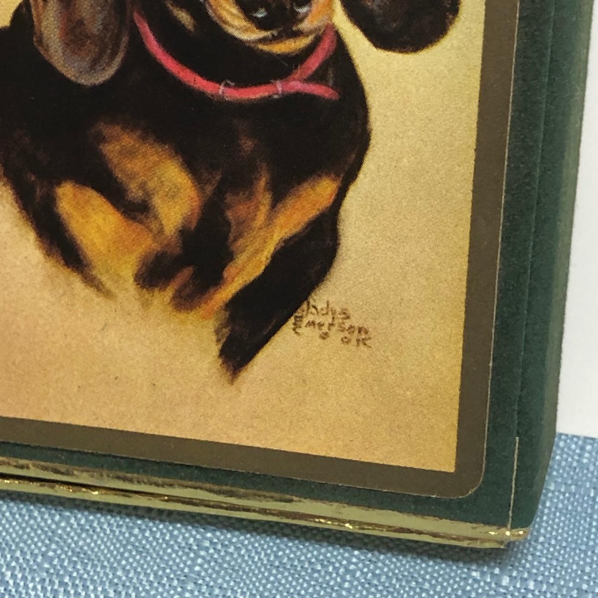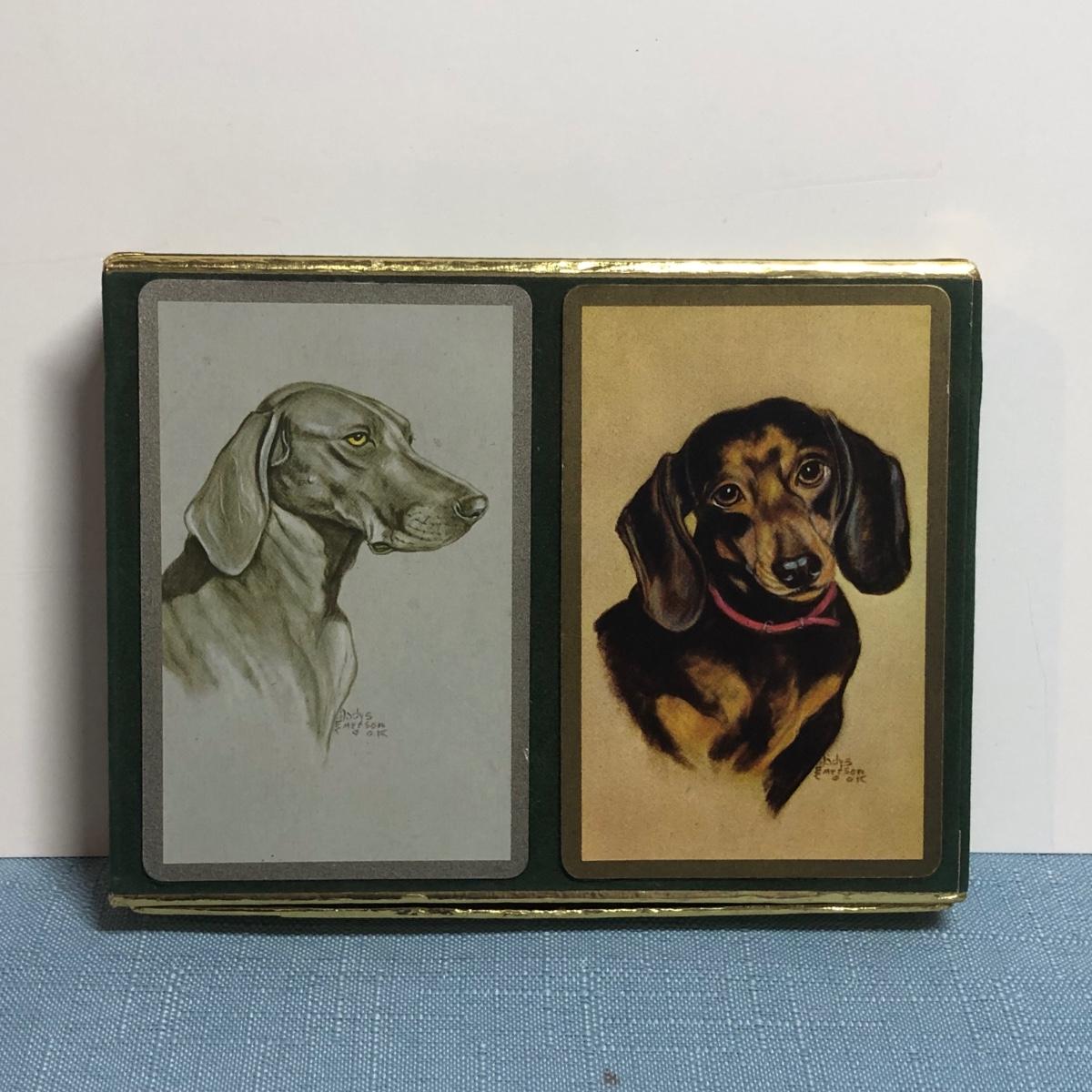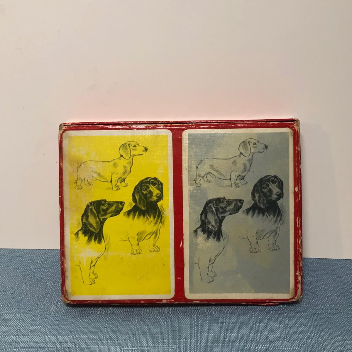 LOT 87M: Vintage Congress Pinochle Dog Cards, Hamilton Dachshund Playing Cards, Plastic Coated Pinochle Terrier Cards w/ Ceramic Dog Figurines