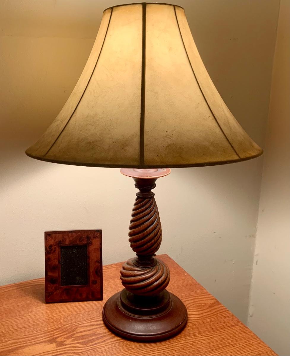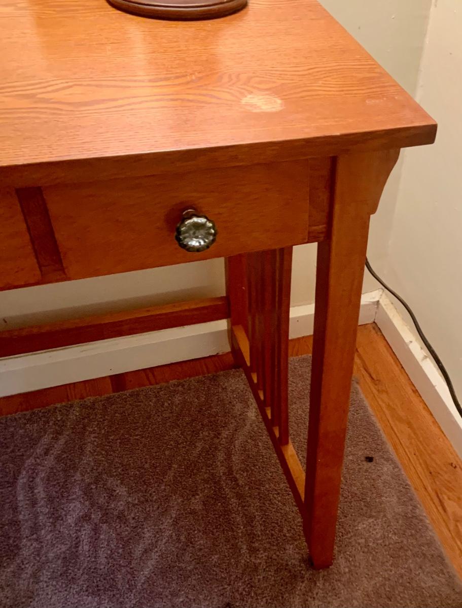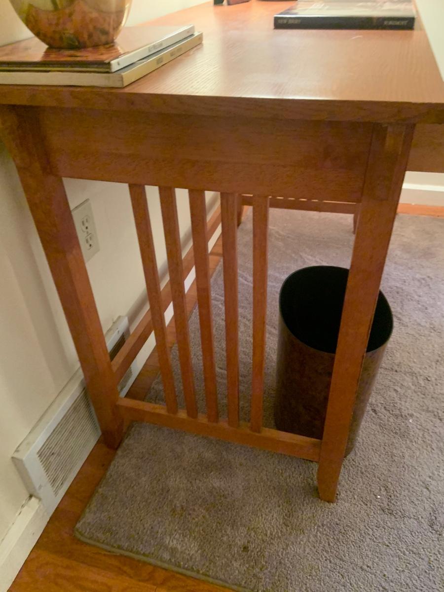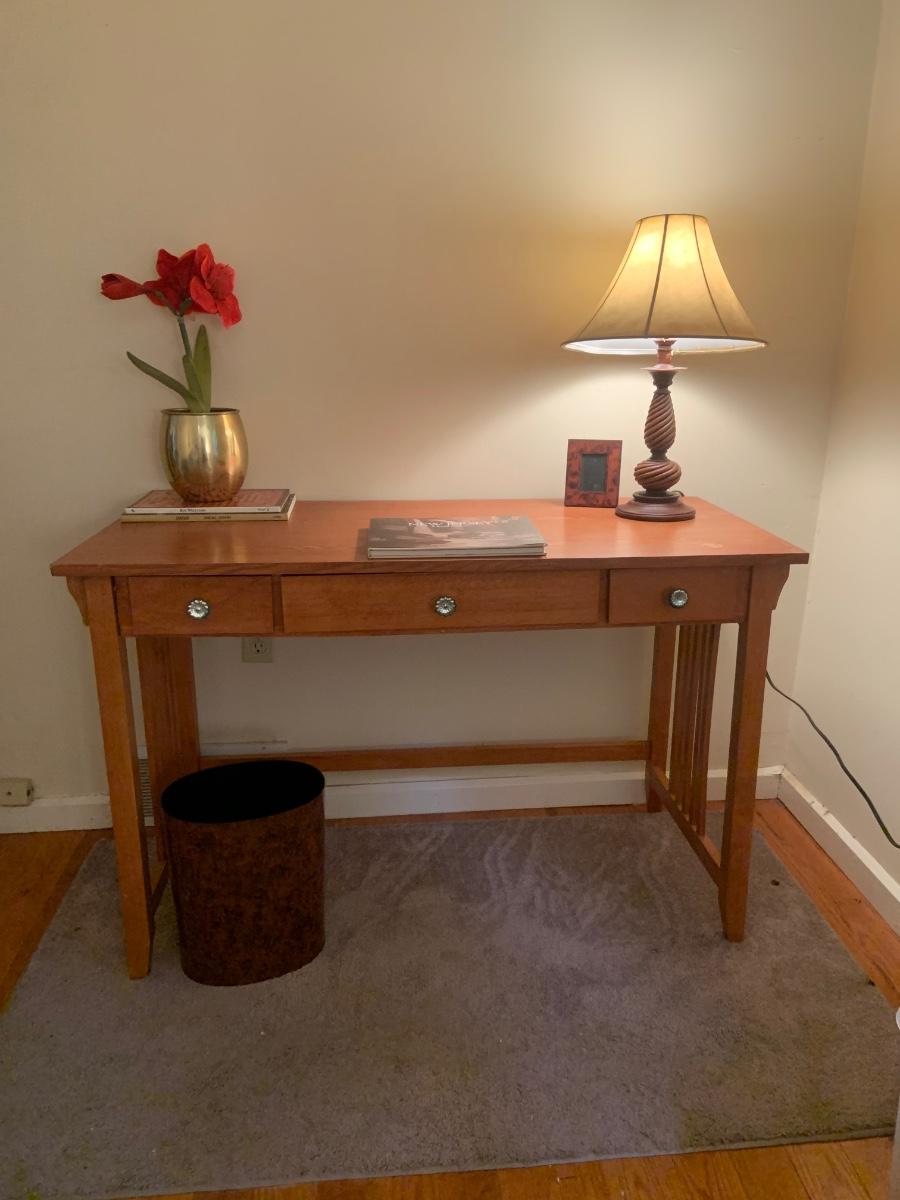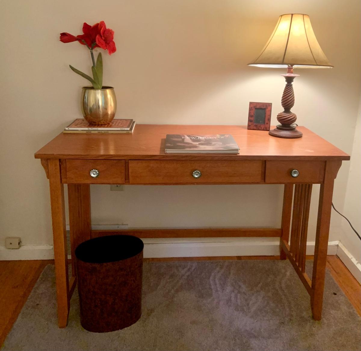 LOT:130G: Mission Desk with Lamp, Books, Waste Basket. Silk Plant and More