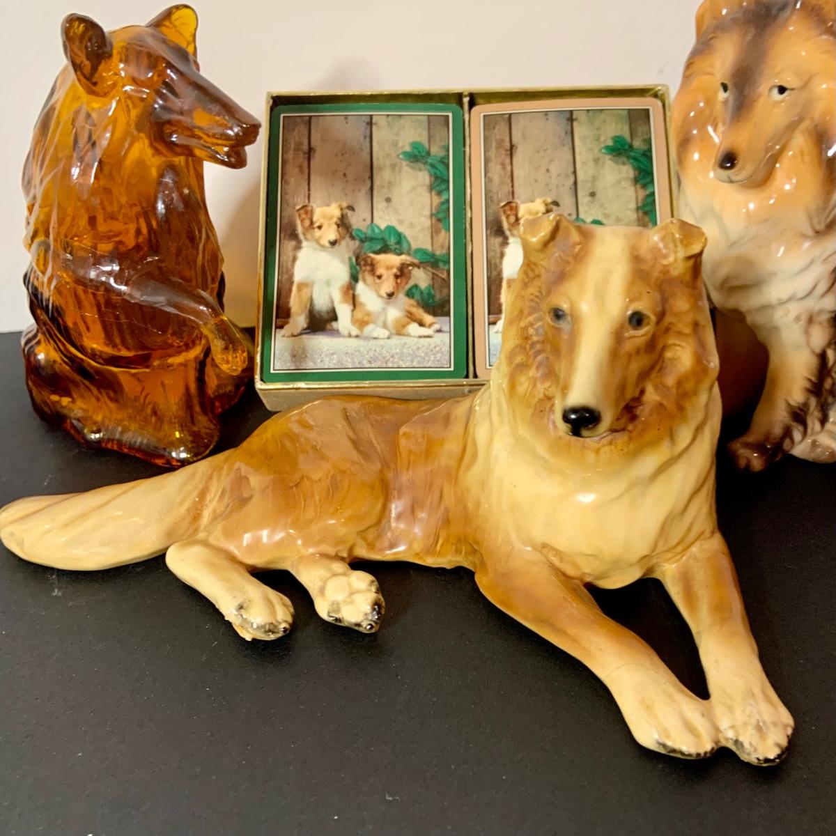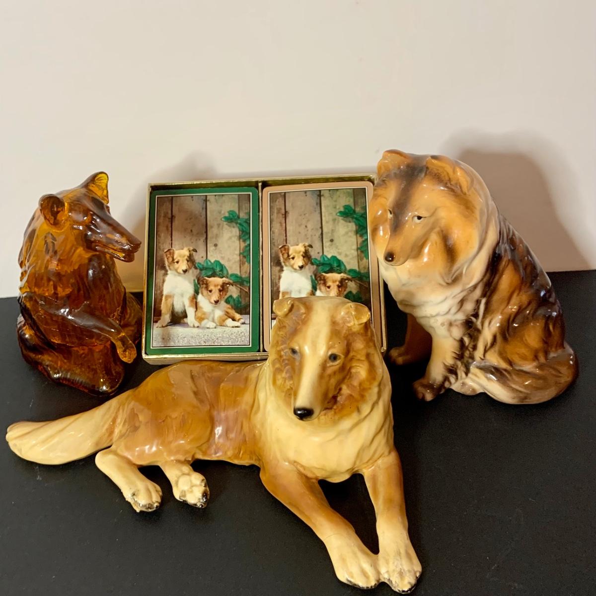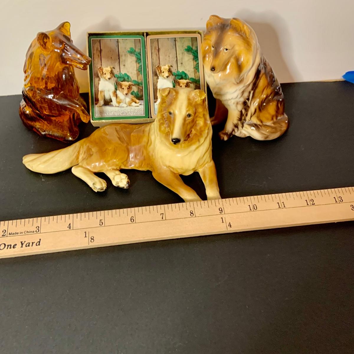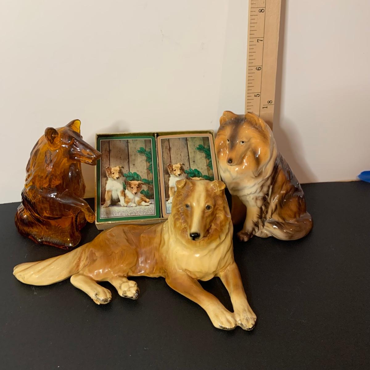 LOT:135G: Collie Collection Featuring Mortens Studio Resting Collie; with Guild Playing Card, Avon Bottle and Sitting Ceramic Collie