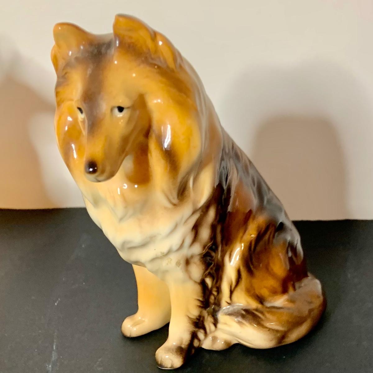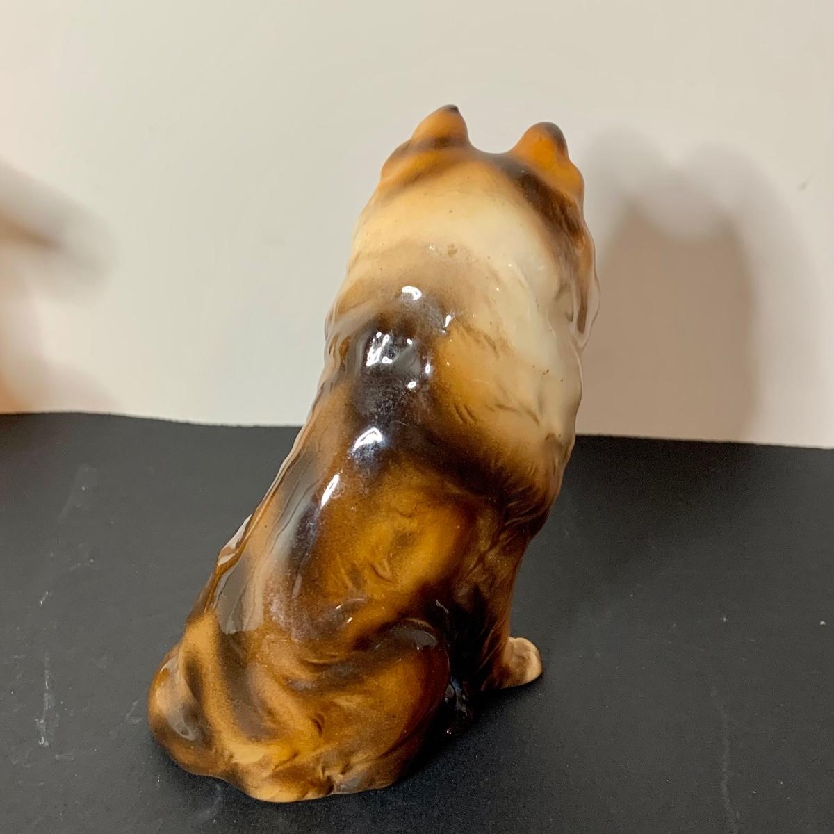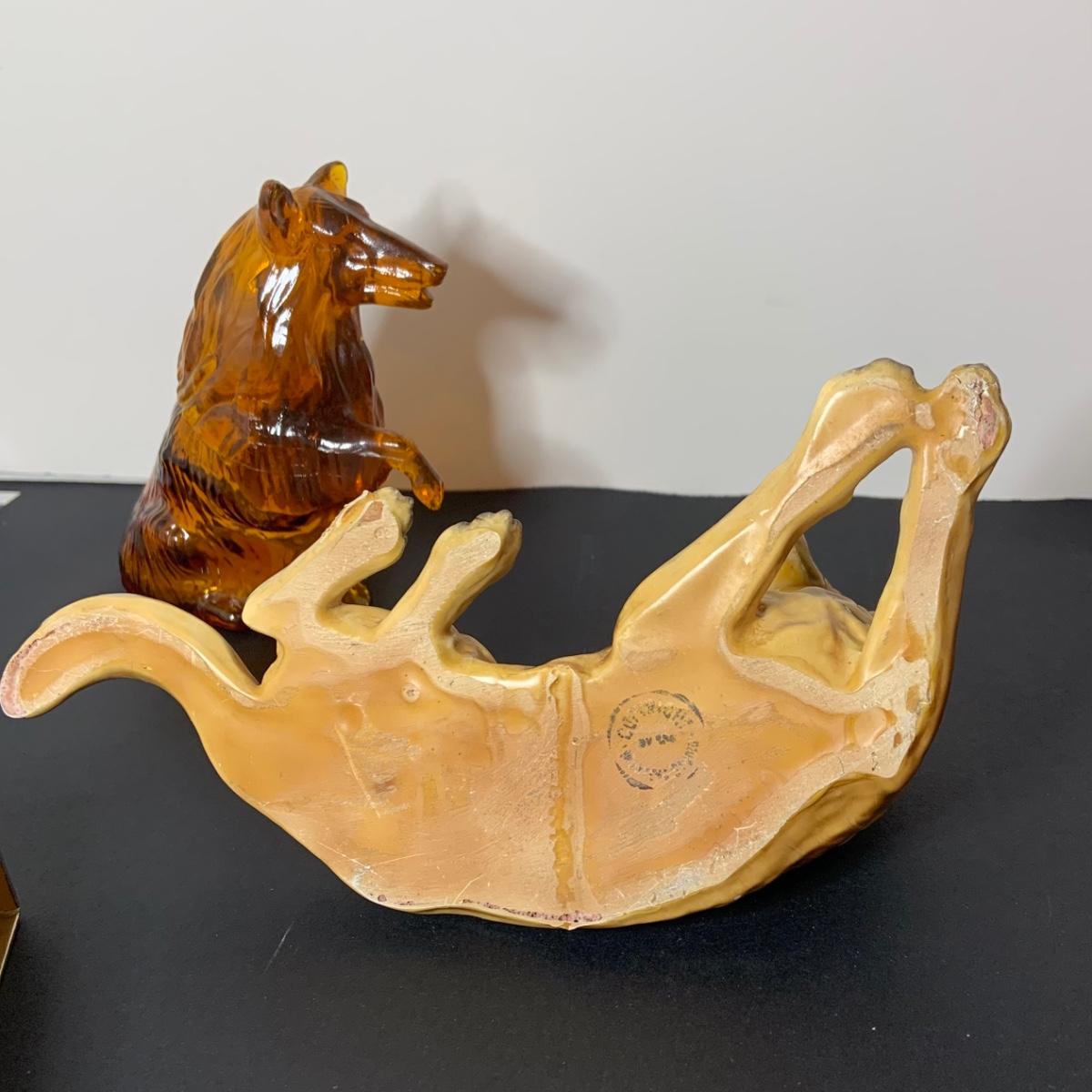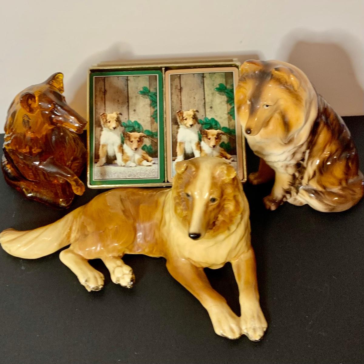 LOT:135G: Collie Collection Featuring Mortens Studio Resting Collie; with Guild Playing Card, Avon Bottle and Sitting Ceramic Collie