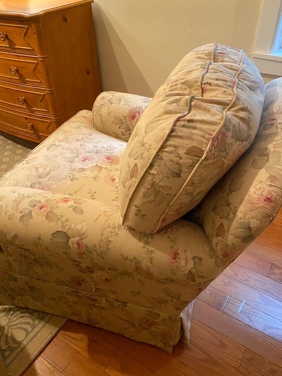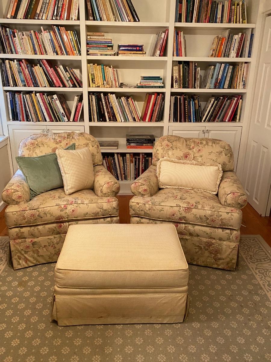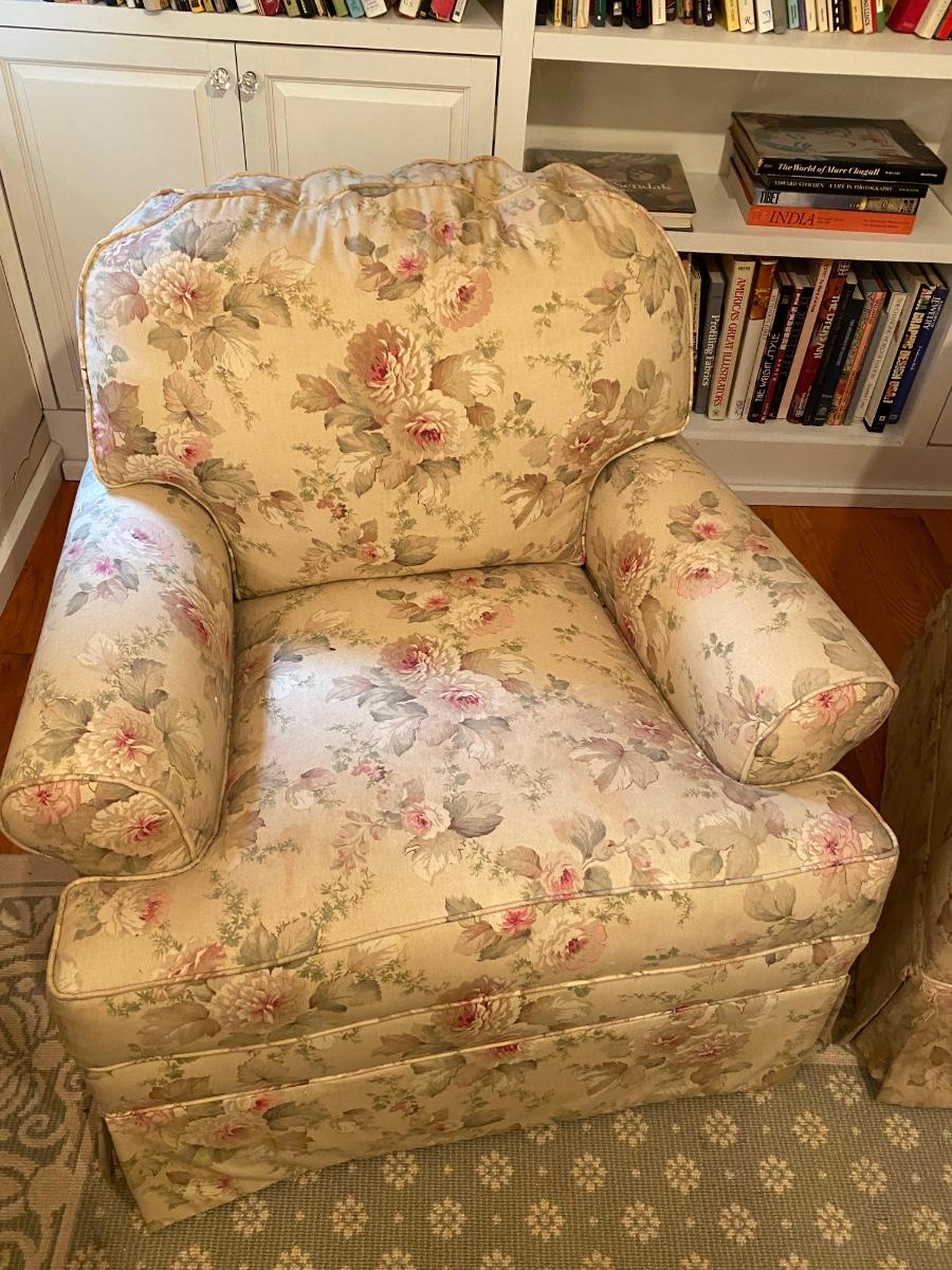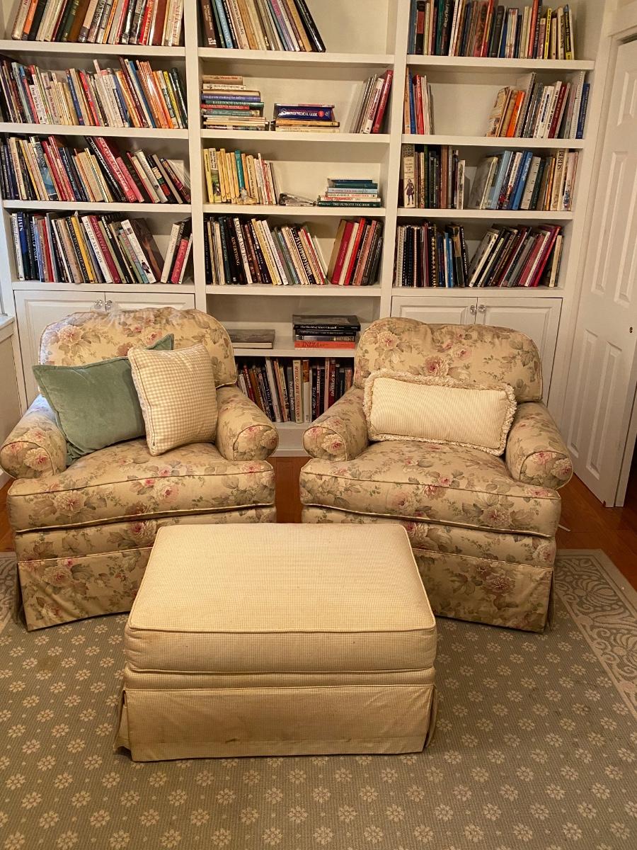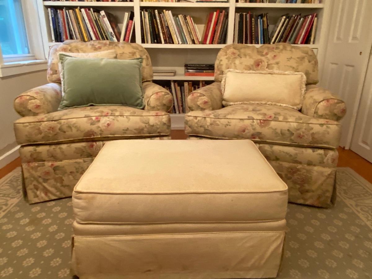 Two side chairs with floral design and ottoman. Furniture is in used condition. Lot includes throw pillows. Chairs measure 32"x33"x32.5". Ottoman measures 20"x15".