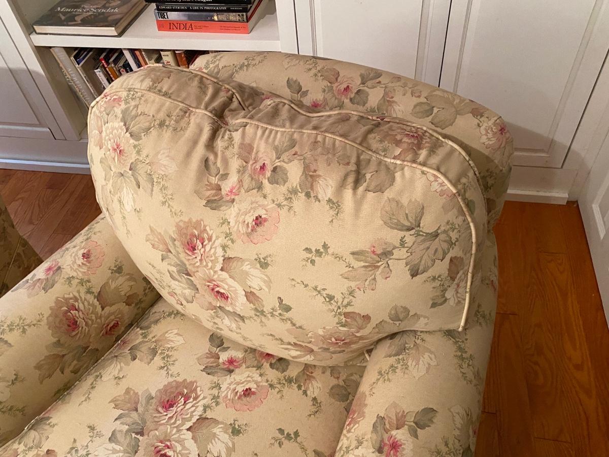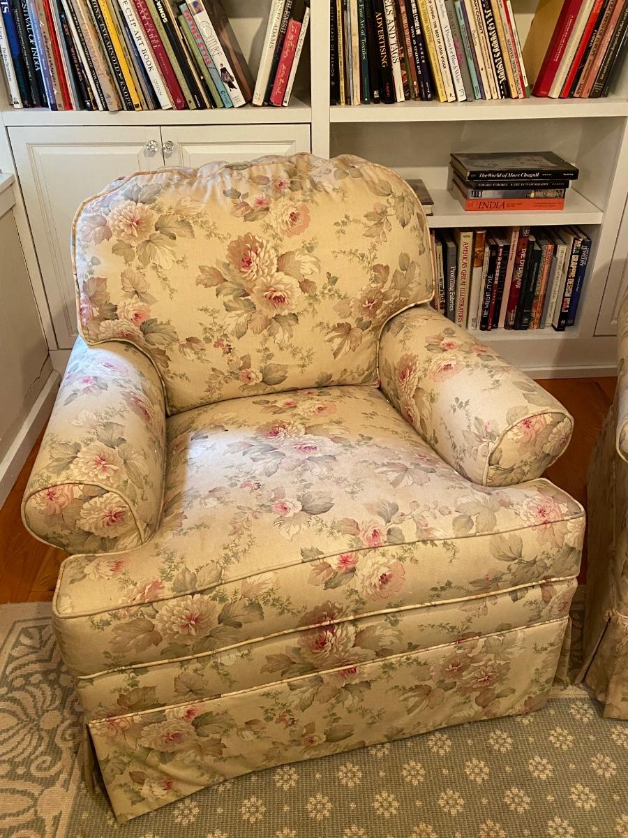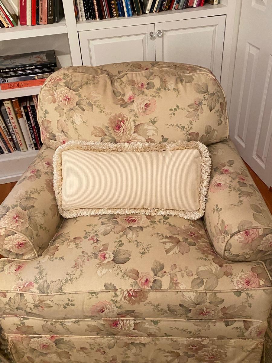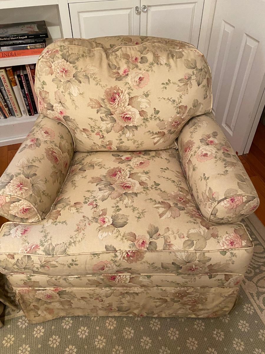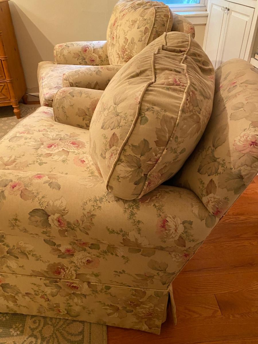 Two side chairs with floral design and ottoman. Furniture is in used condition. Lot includes throw pillows. Chairs measure 32"x33"x32.5". Ottoman measures 20"x15".