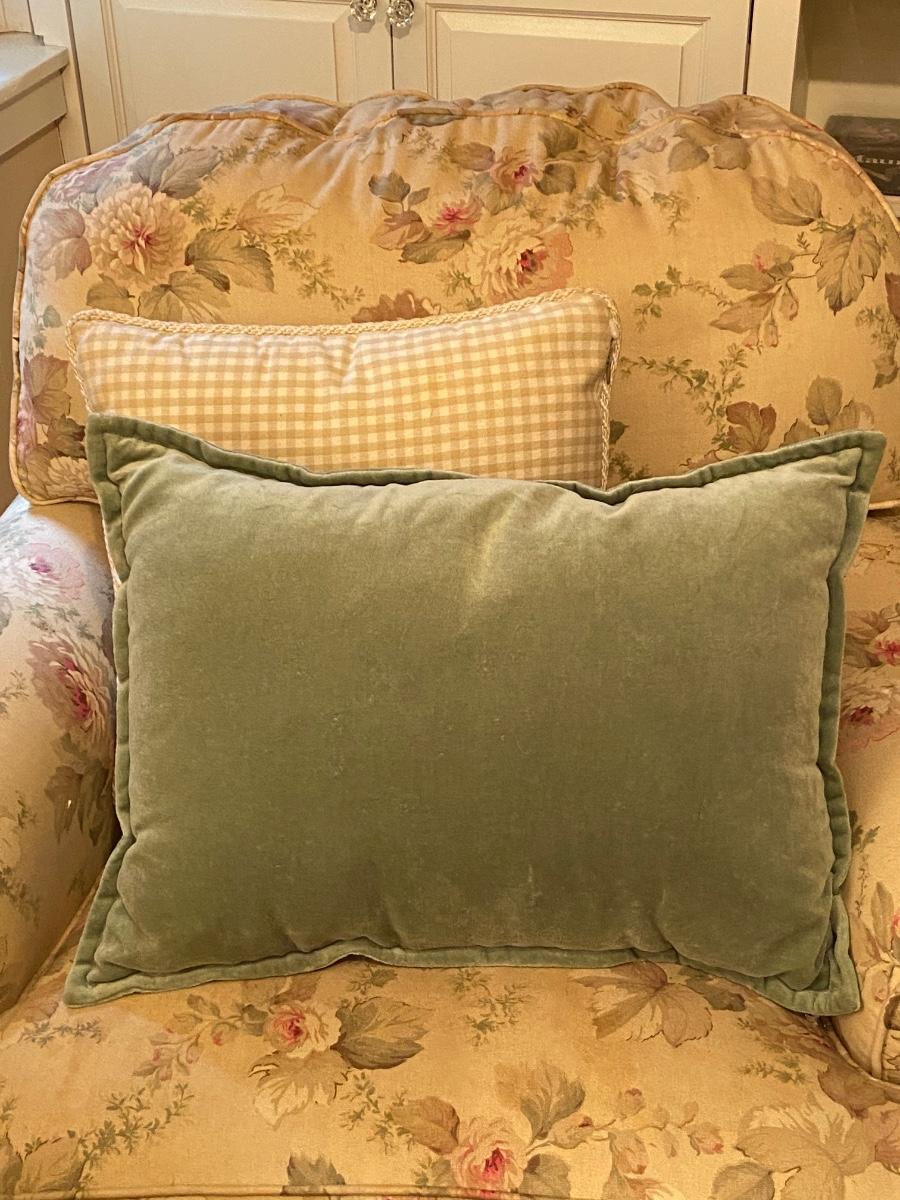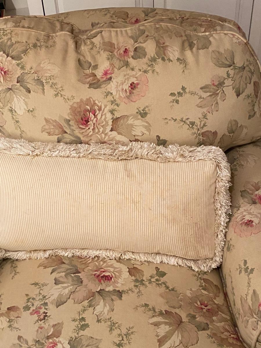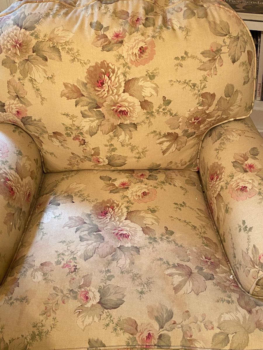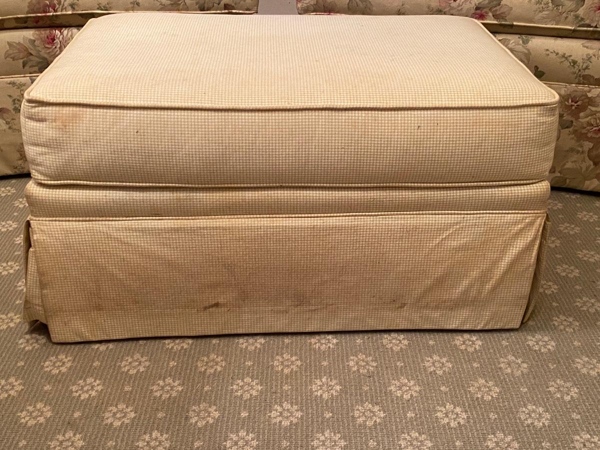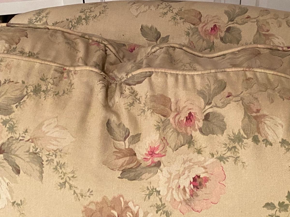 Two side chairs with floral design and ottoman. Furniture is in used condition. Lot includes throw pillows. Chairs measure 32"x33"x32.5". Ottoman measures 20"x15".