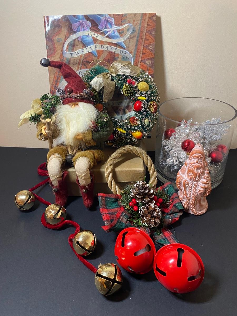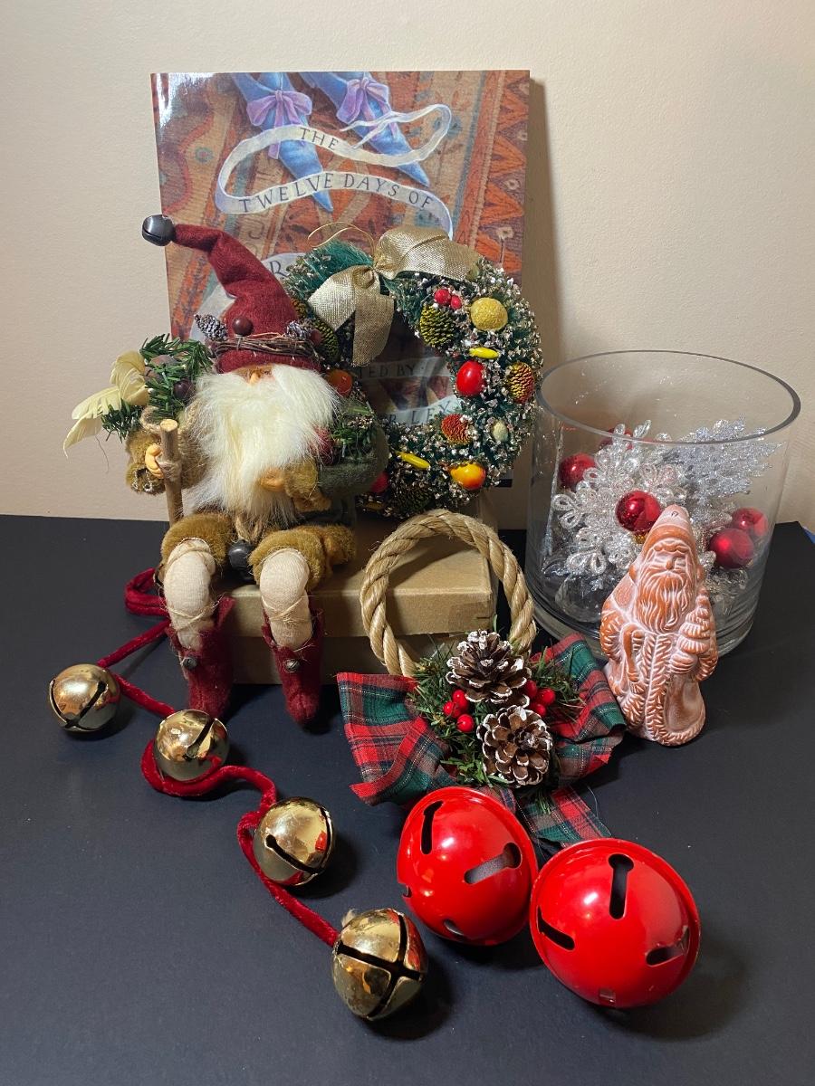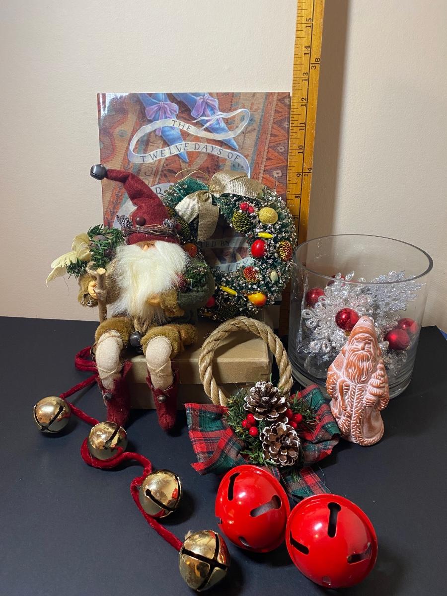 Vintage Santa, Christmas bells, snowflakes, book and more.