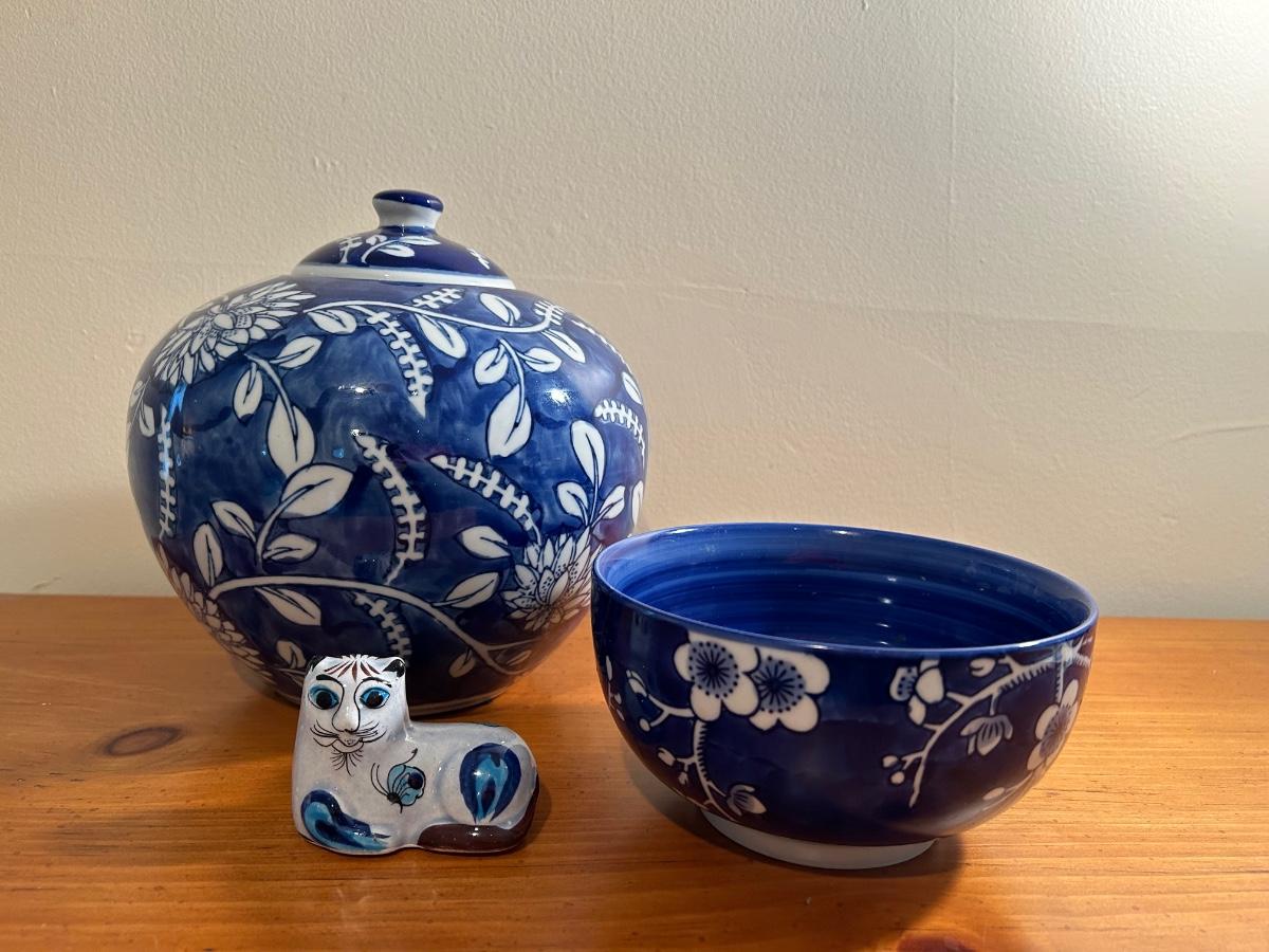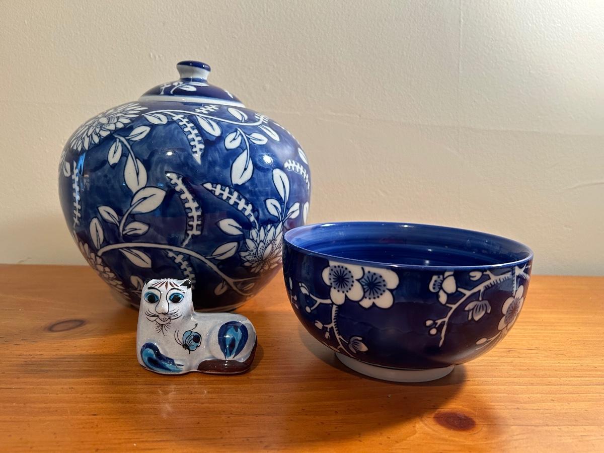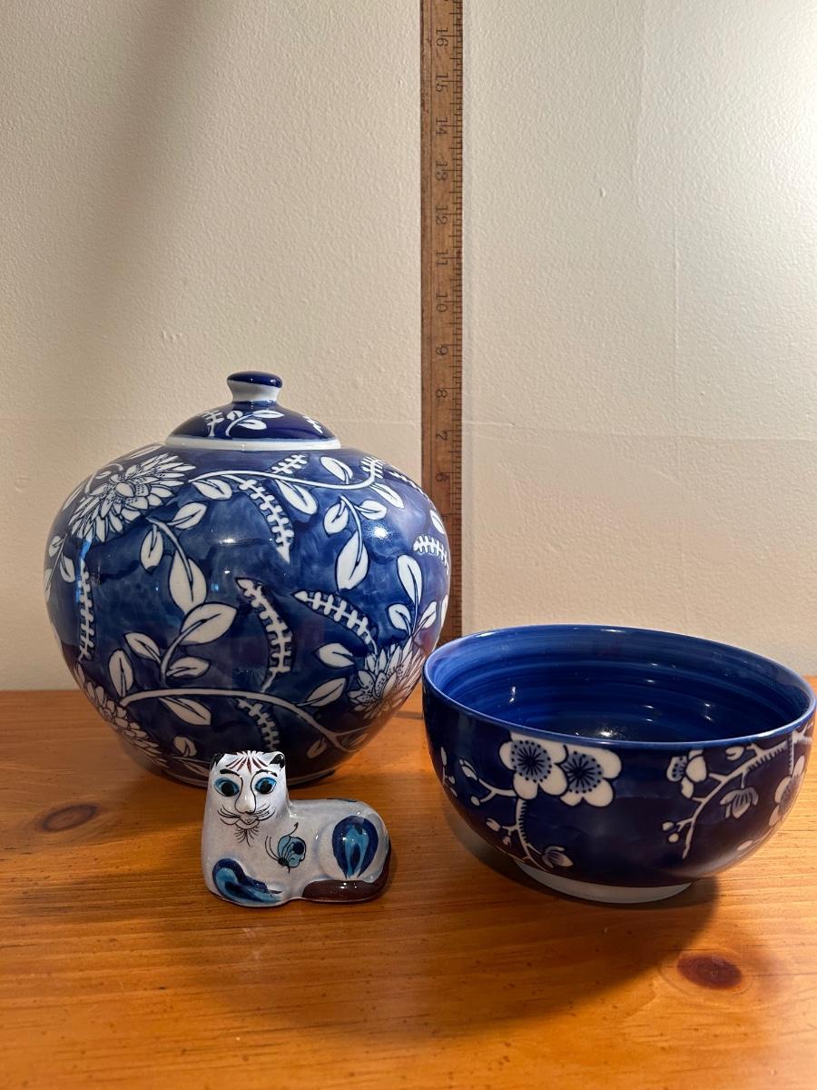 LOT 224C: Blue & White Porcelain - Chinoiserie Jar, Bowl & Cat Figure