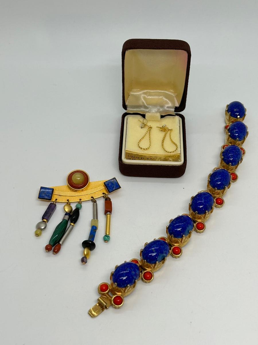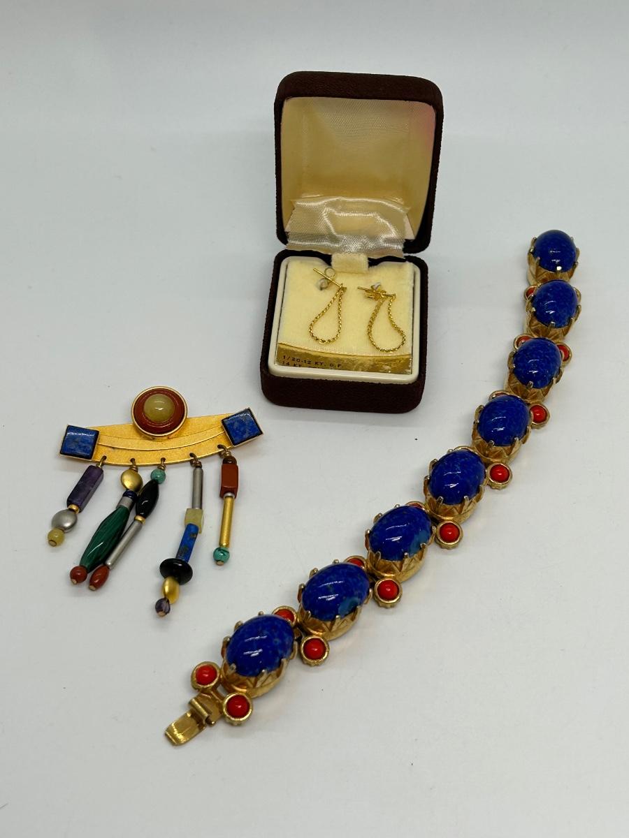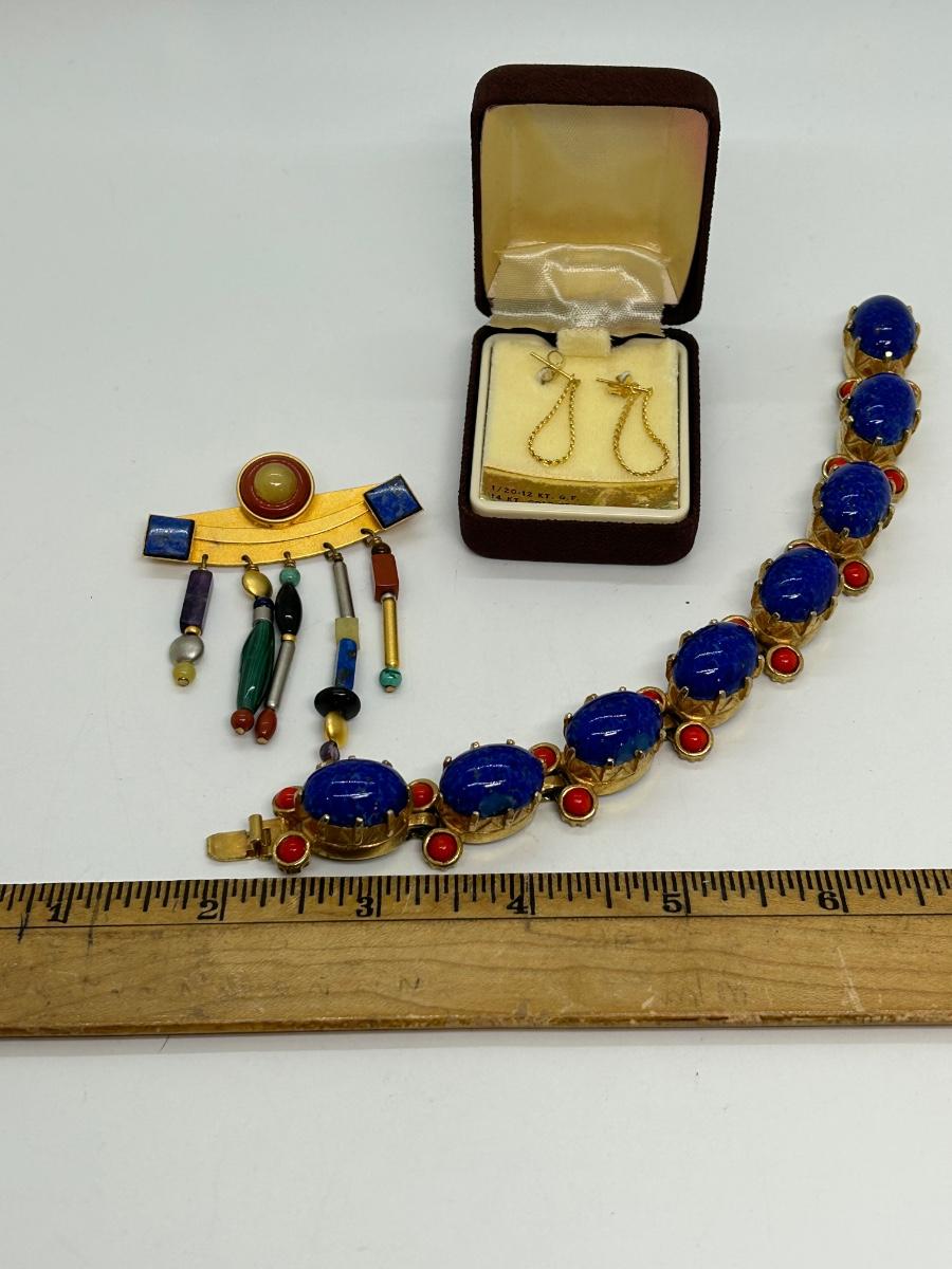 LOT 239C: Simulated Gemstone Bracelet, 1/20th KT Gold Fill Earrings w/ 14KT Gold Posts & Brooch