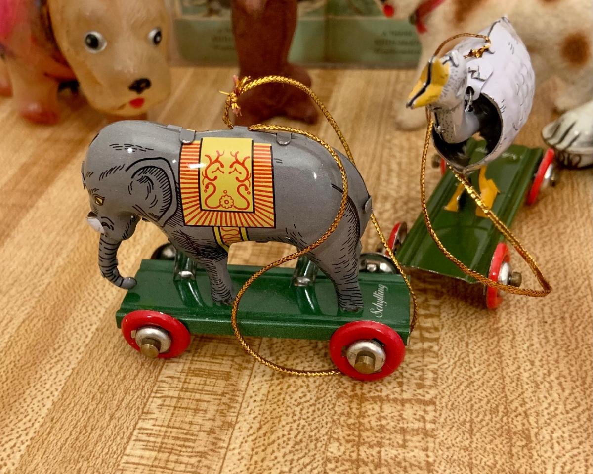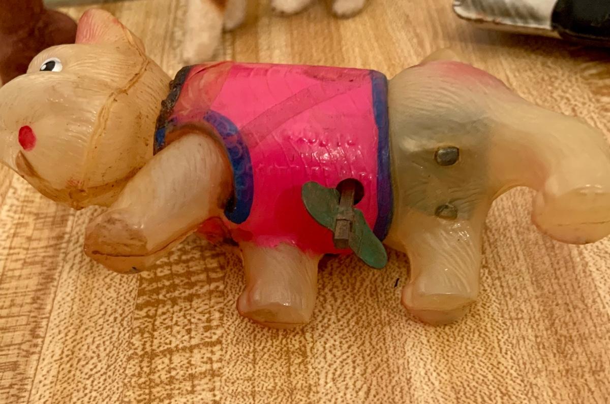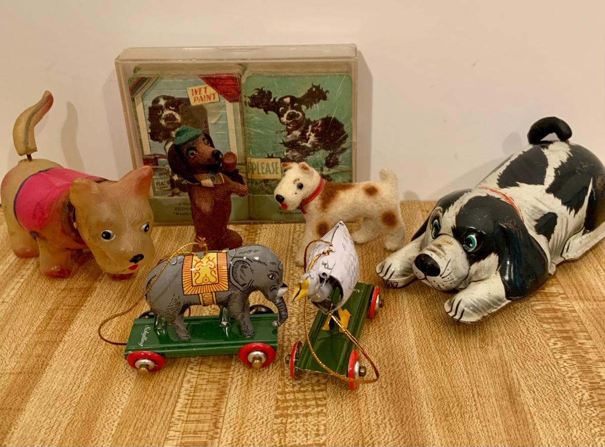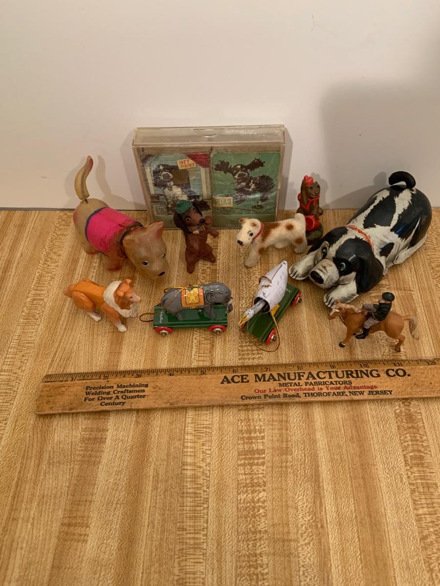 LOT:246: Vintage Toy Collection Featuring Celluloid Wind-up Scottie; Tin Wind-up Dog and Schylling Pull Elephant & Duck and Much More