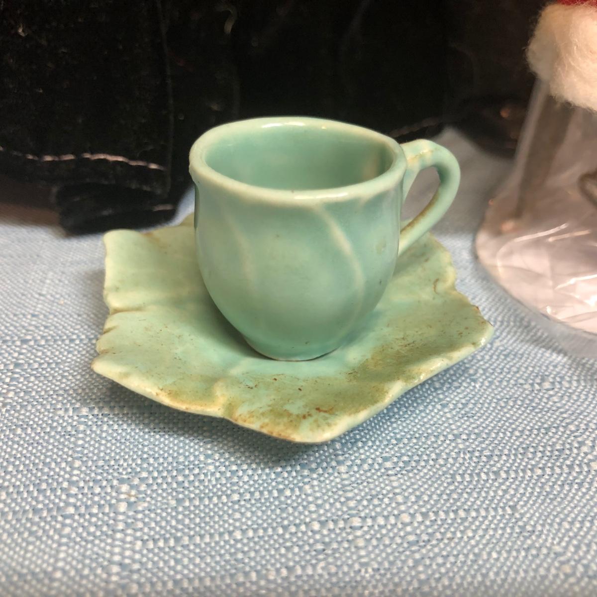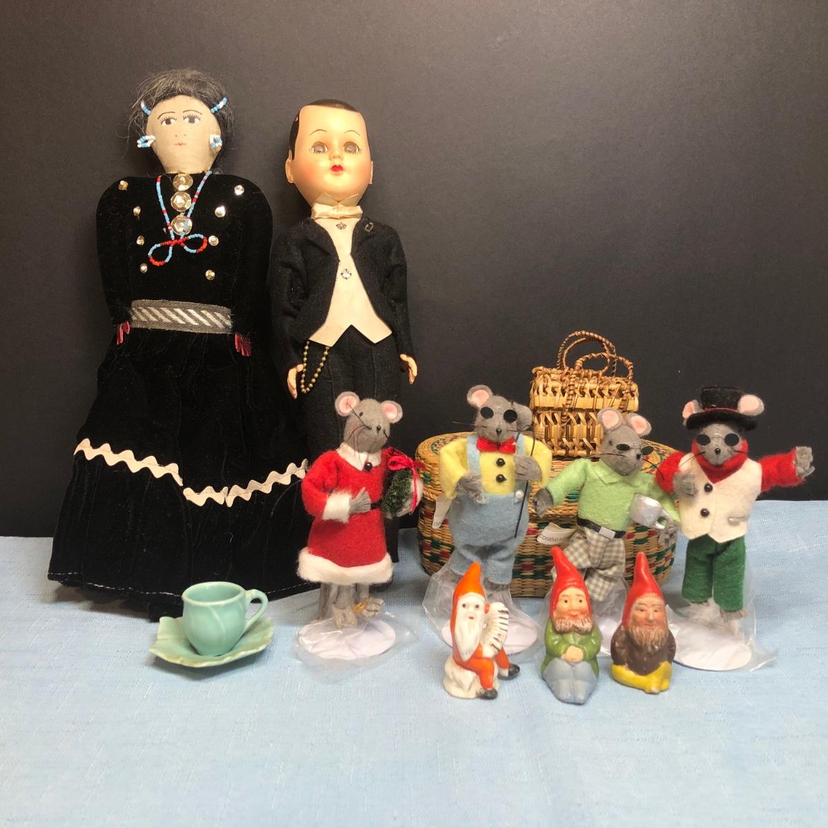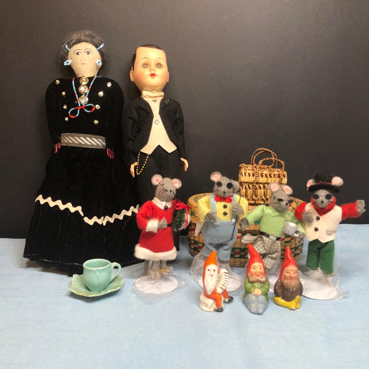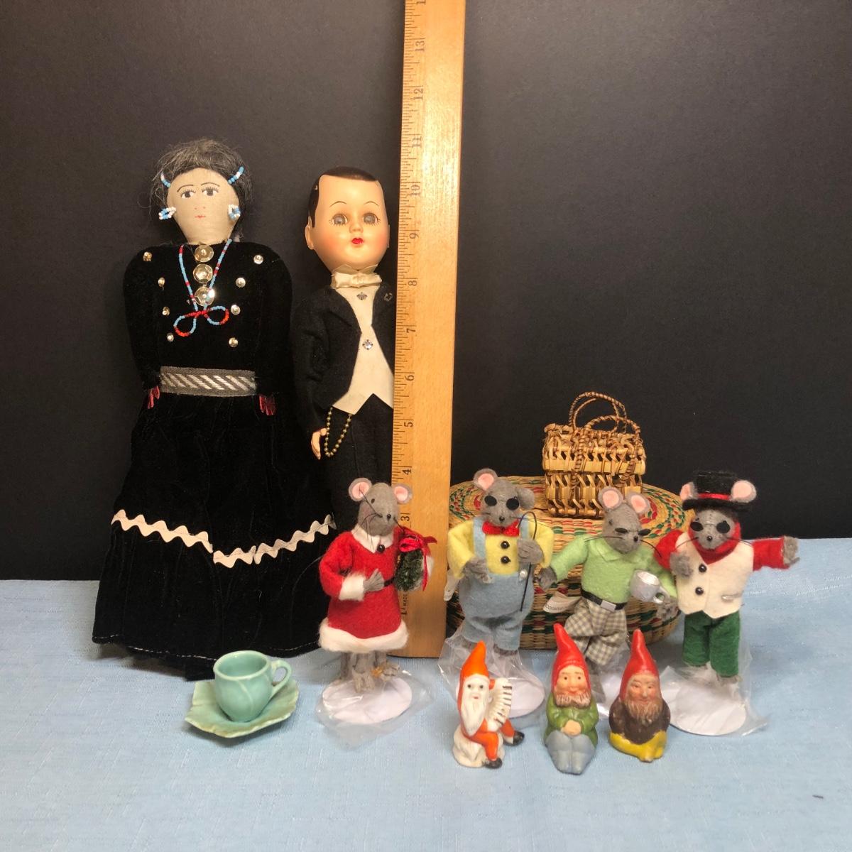 LOT 275M: Miniature Green Leaf Majolica Pottery Demitassee Tea Cup & Saucer, Heart Felts 3 Blind Mice, Gnomes, Vintage Native American Cloth Doll, 1930s Plastic BrideGroom Doll in Tuxedo & More