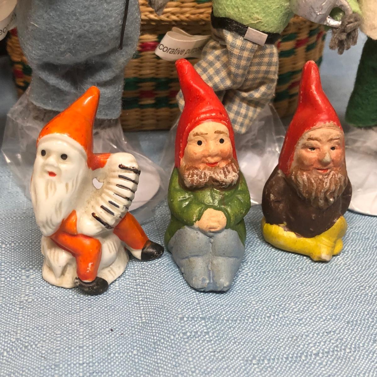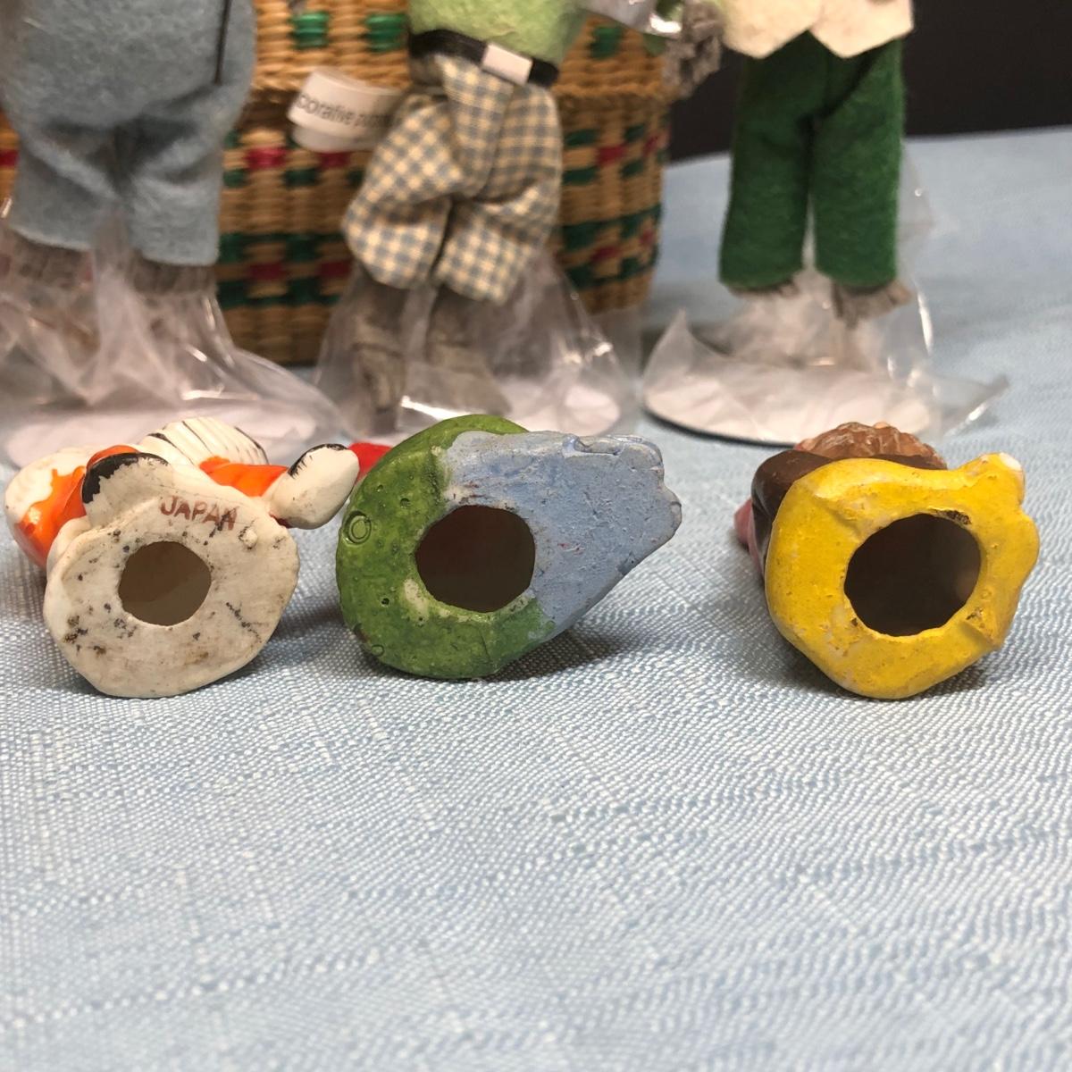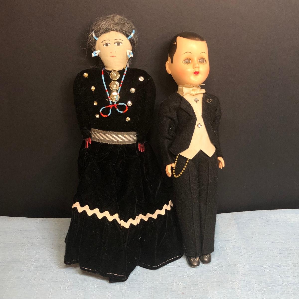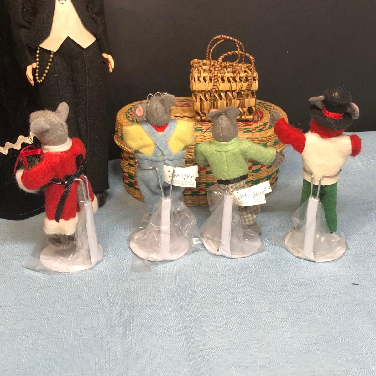 LOT 275M: Miniature Green Leaf Majolica Pottery Demitassee Tea Cup & Saucer, Heart Felts 3 Blind Mice, Gnomes, Vintage Native American Cloth Doll, 1930s Plastic BrideGroom Doll in Tuxedo & More