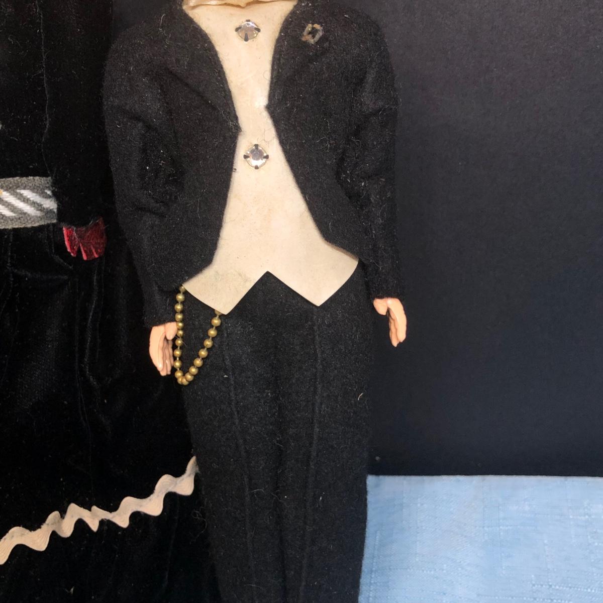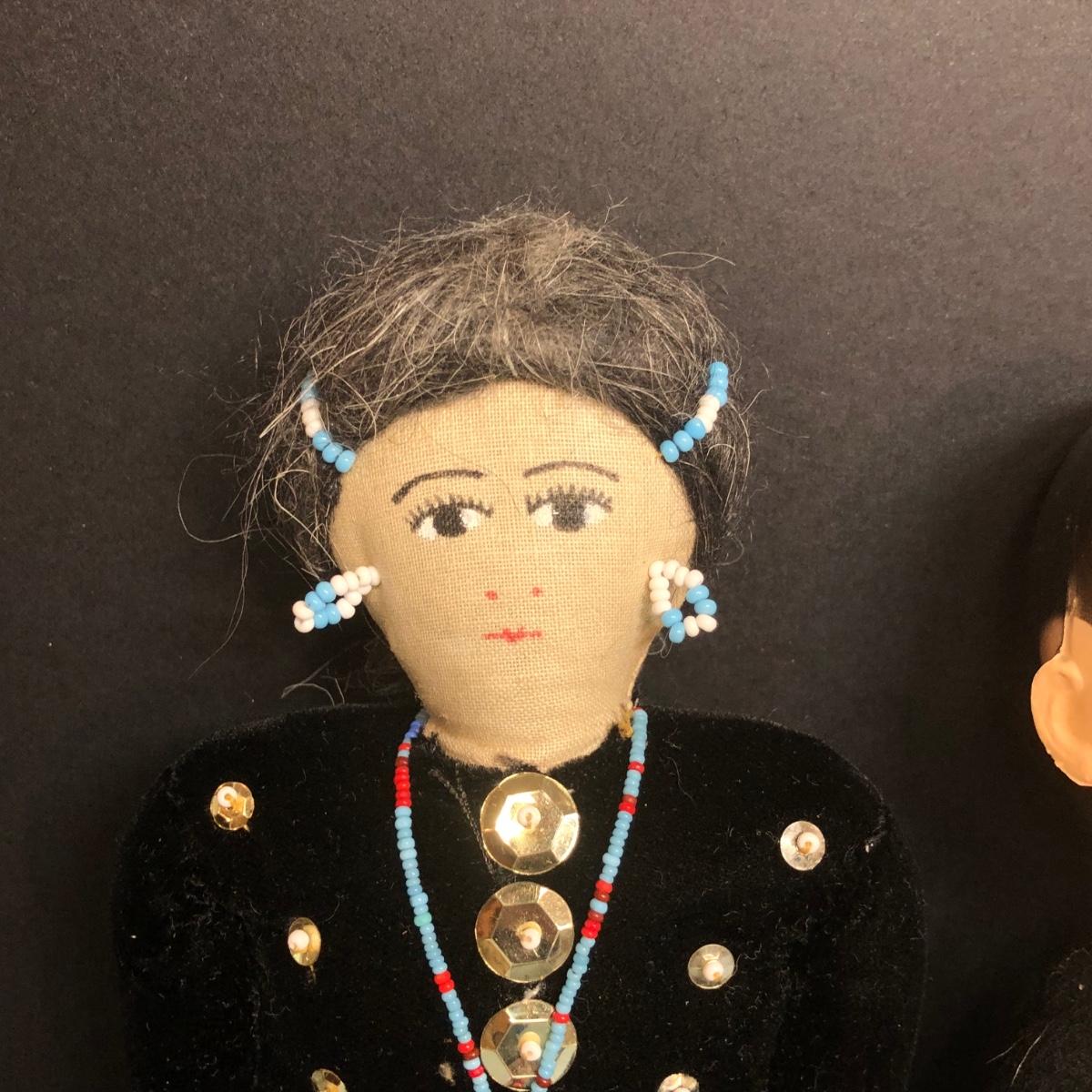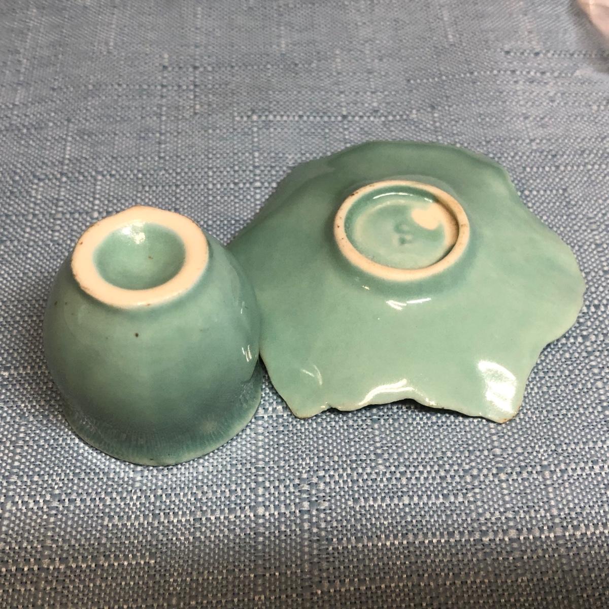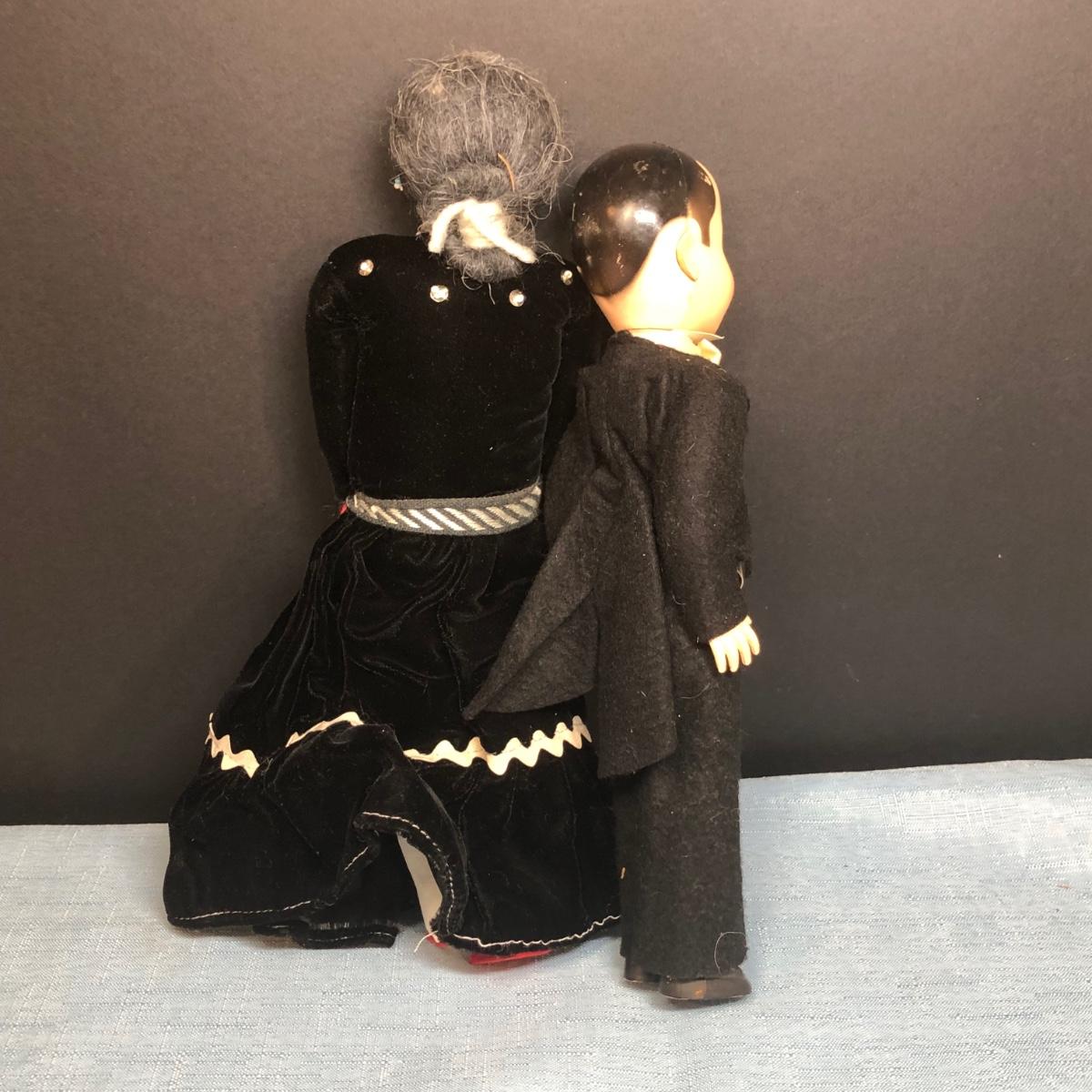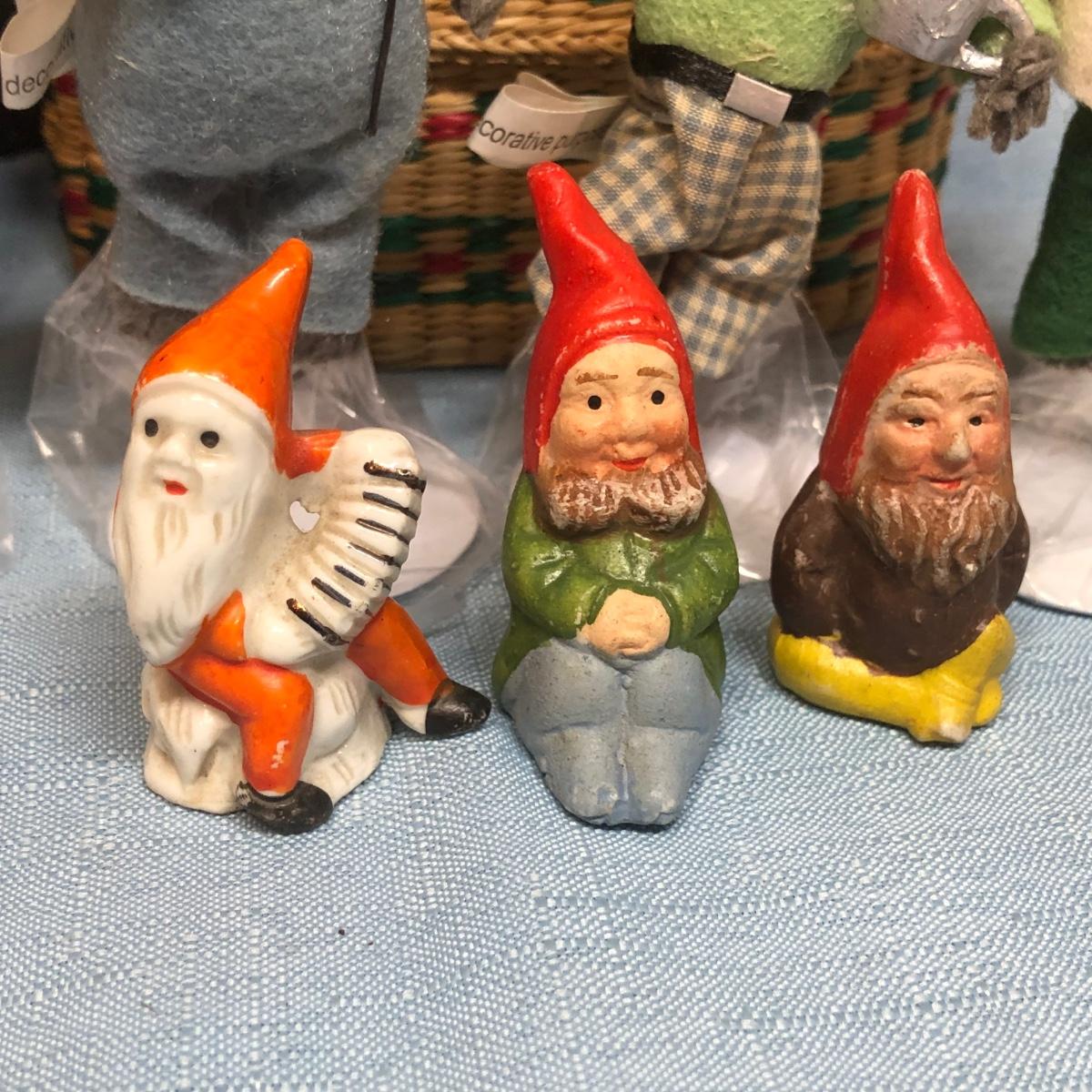 LOT 275M: Miniature Green Leaf Majolica Pottery Demitassee Tea Cup & Saucer, Heart Felts 3 Blind Mice, Gnomes, Vintage Native American Cloth Doll, 1930s Plastic BrideGroom Doll in Tuxedo & More
