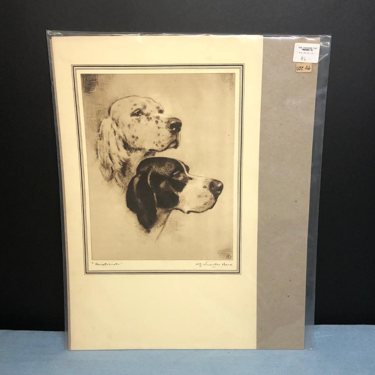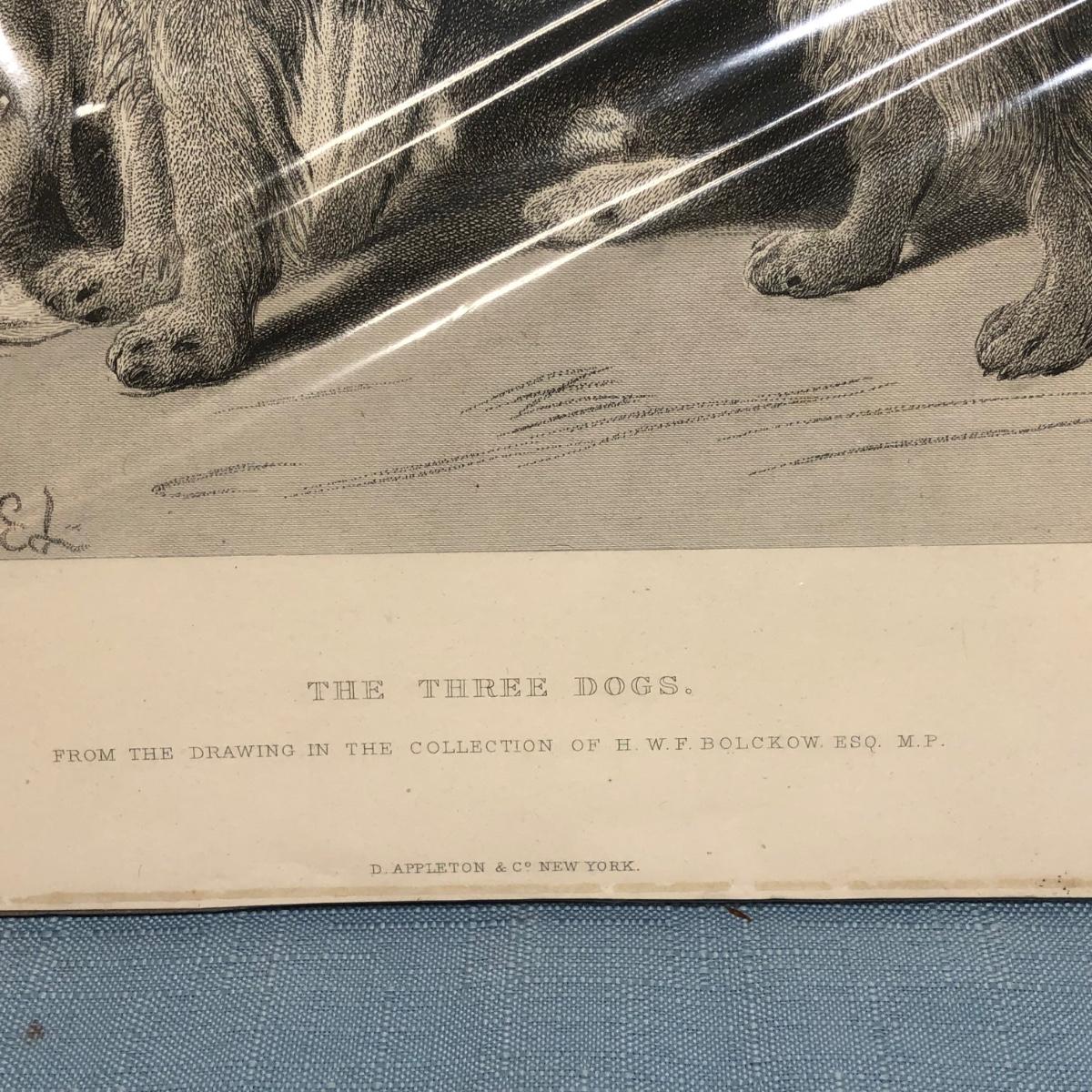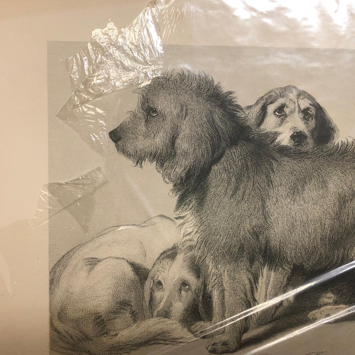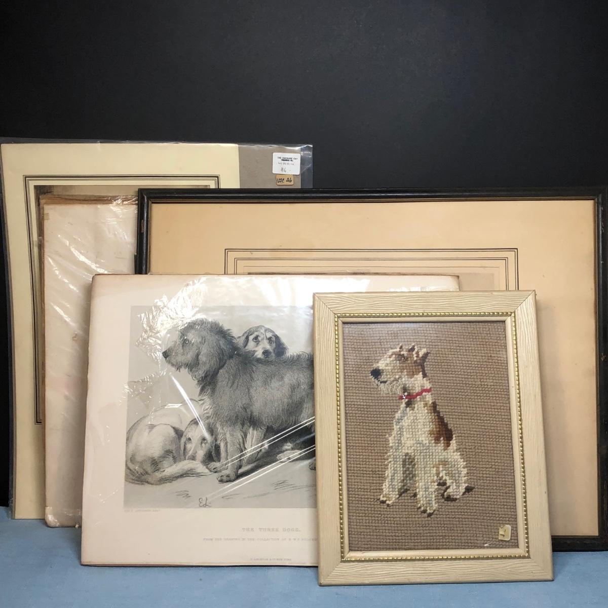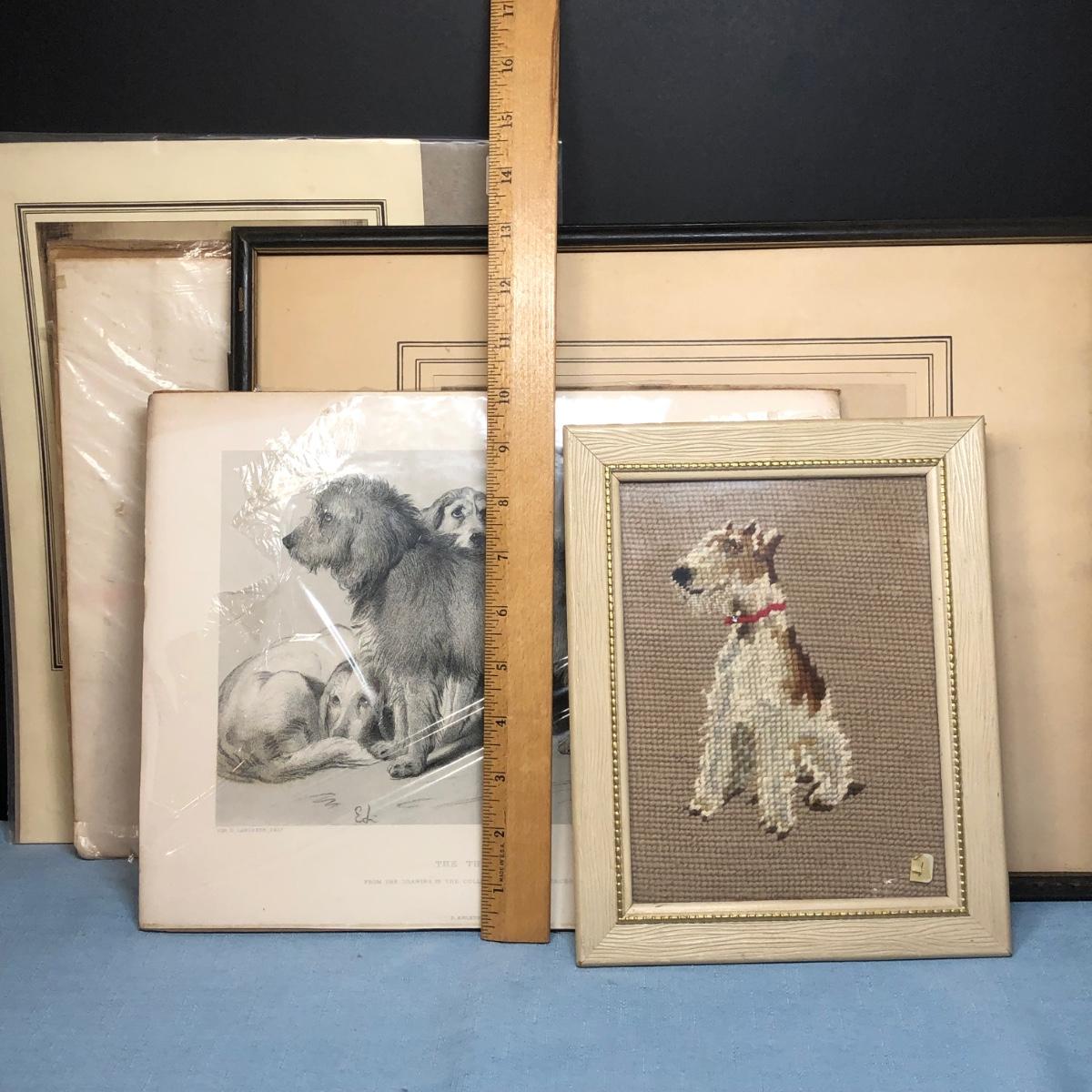 LOT 276M: Fox Terrier Cross Stitch, "The Three Dogs" signed Sir E. Landseer, Signed P{air of Hounds Print, E. Landseer "The Friend in Suspense" Print & Signed Aristocrats Print by J.K. Hare