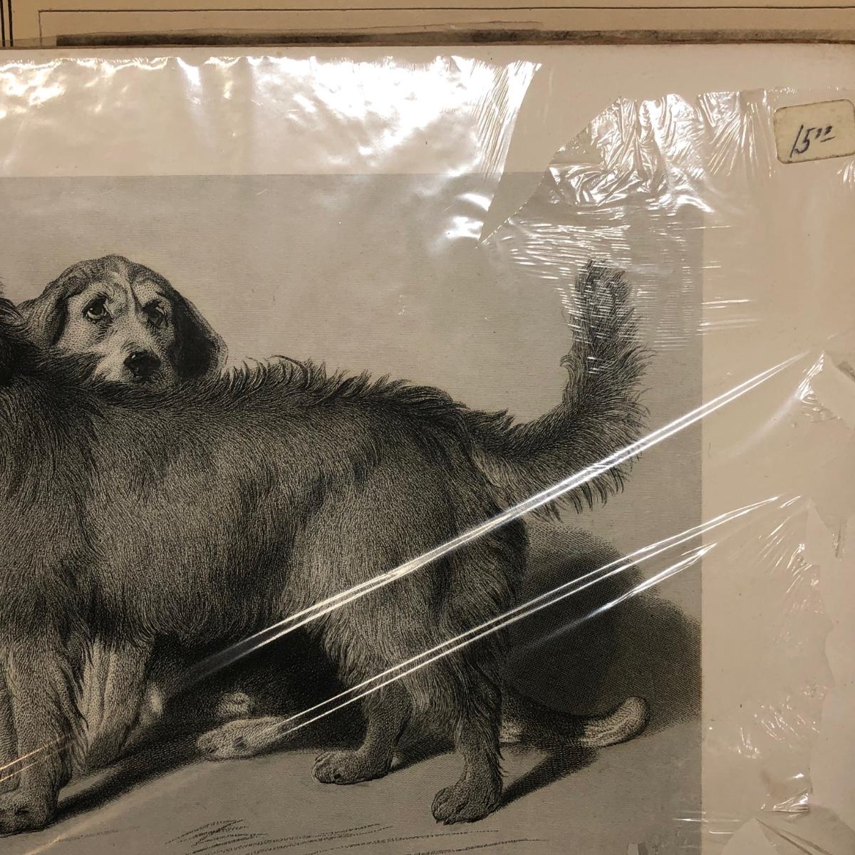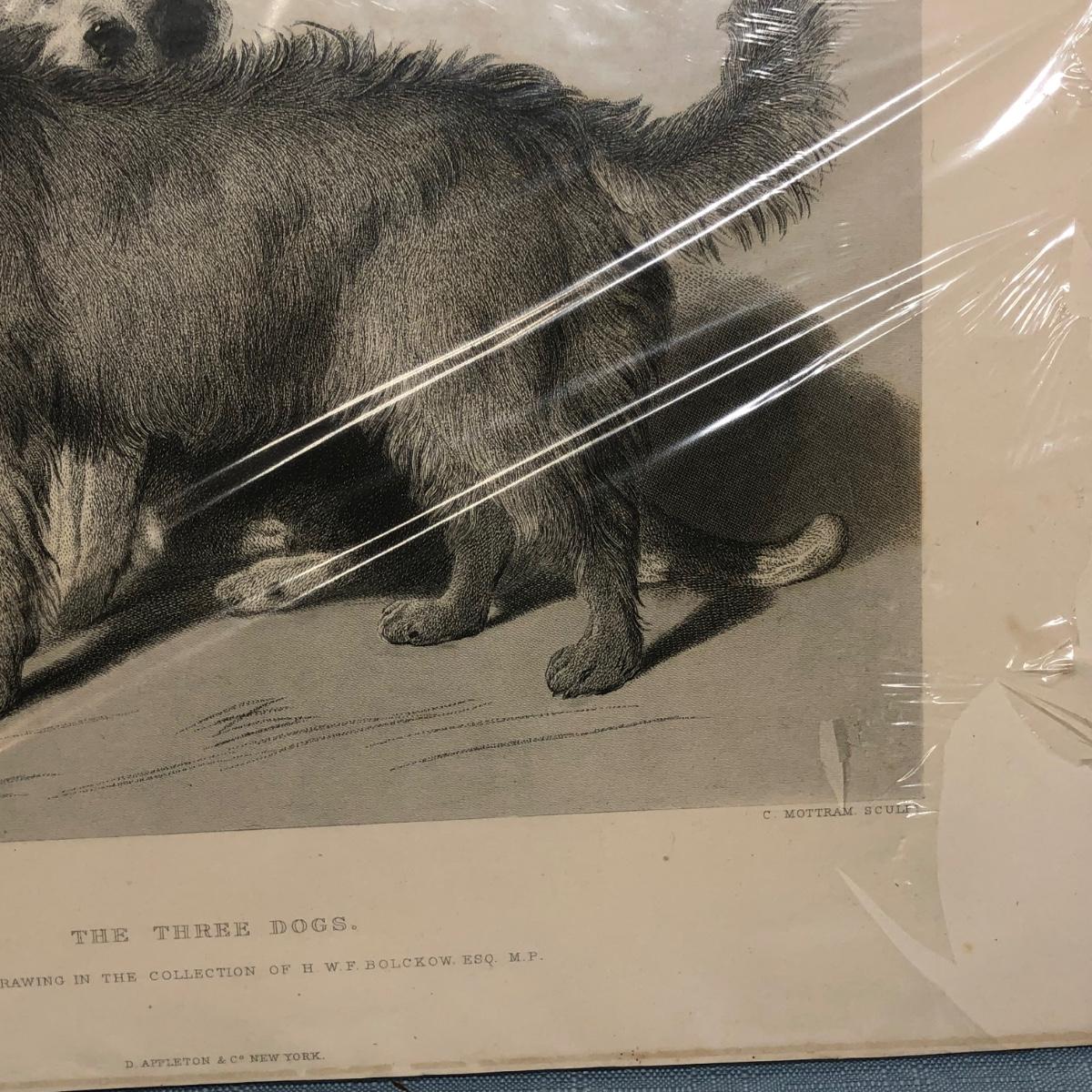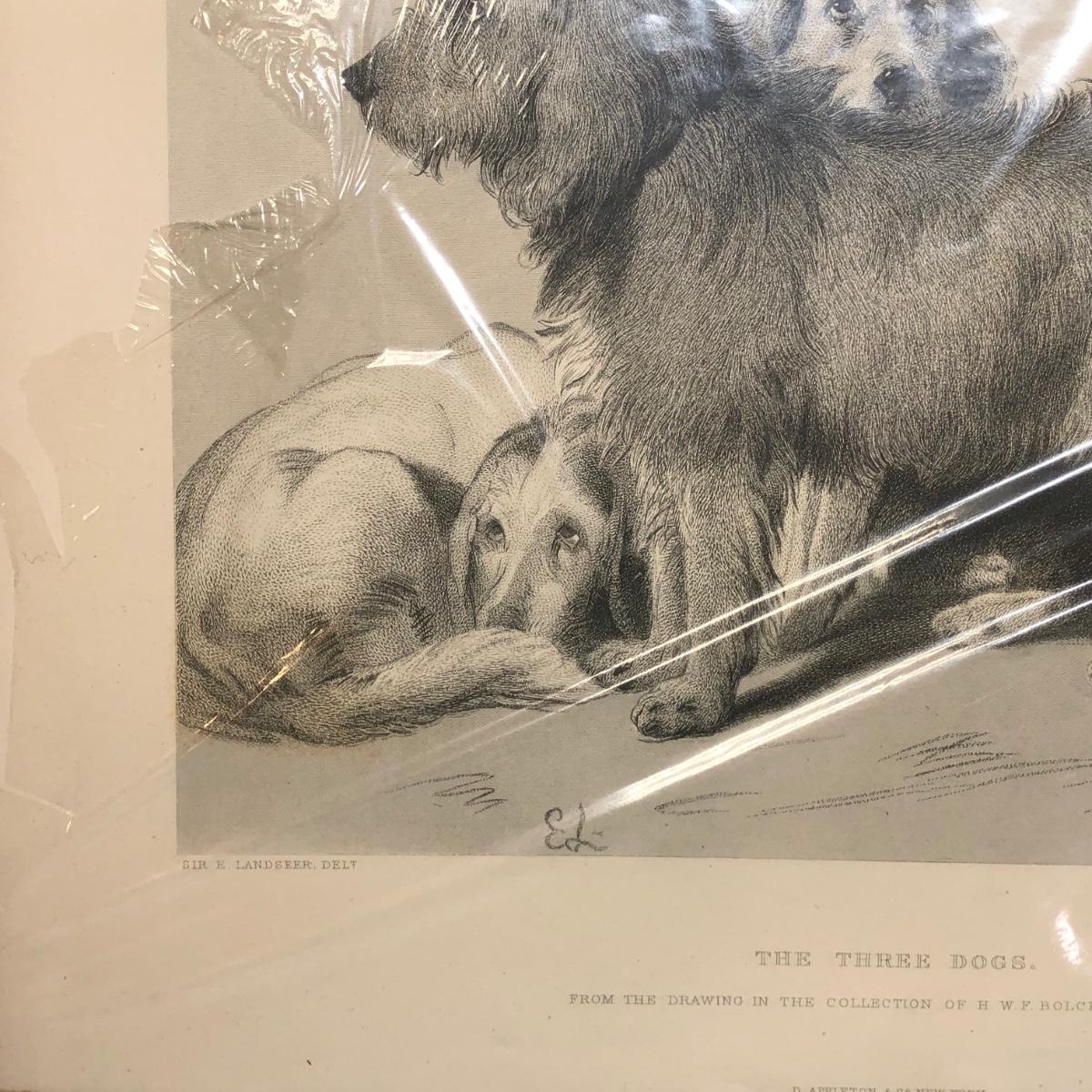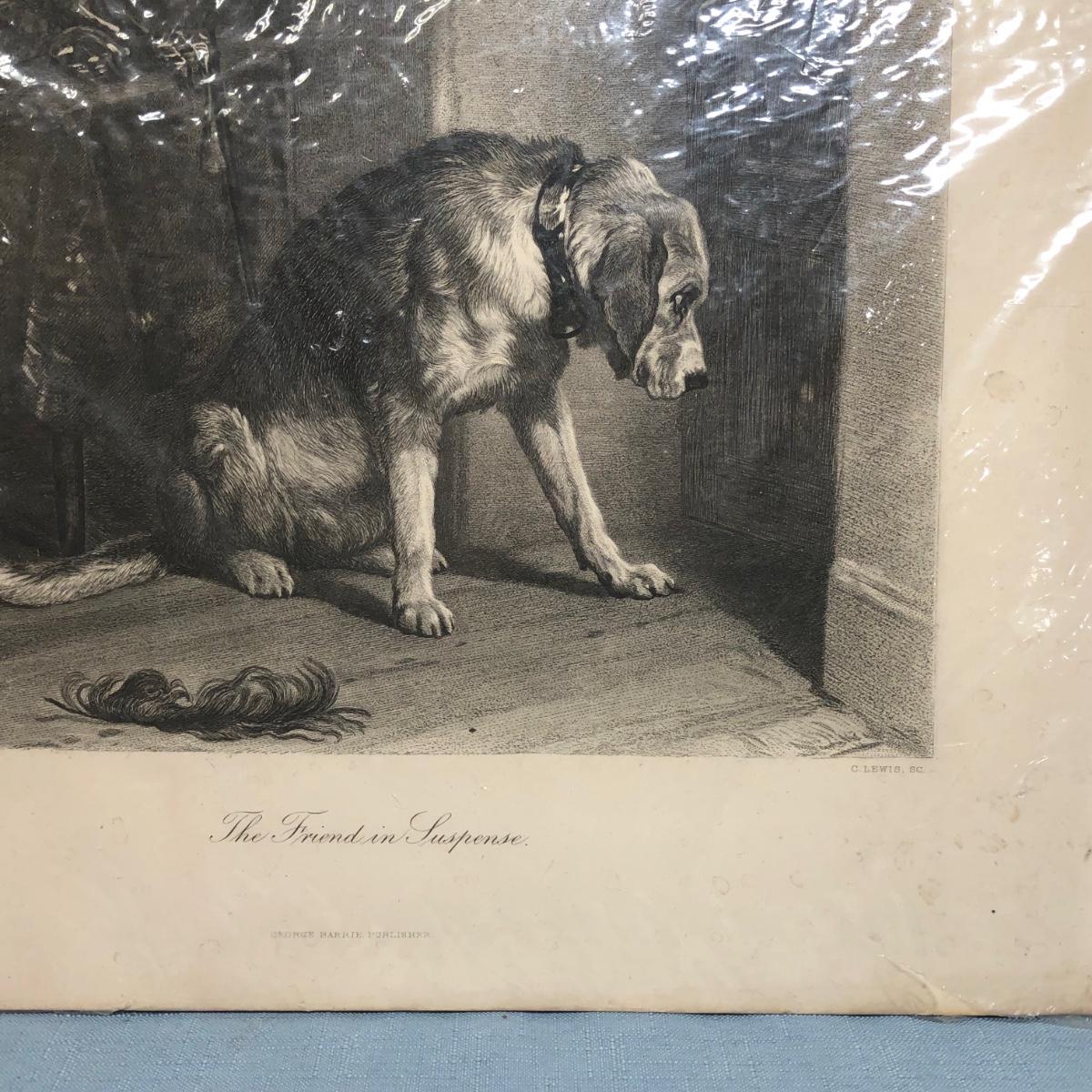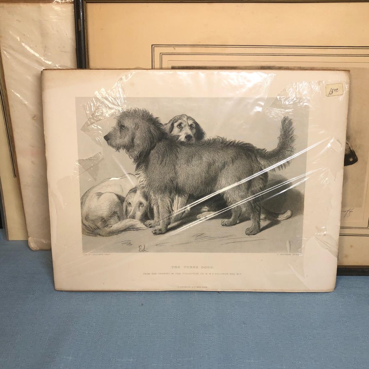 LOT 276M: Fox Terrier Cross Stitch, "The Three Dogs" signed Sir E. Landseer, Signed P{air of Hounds Print, E. Landseer "The Friend in Suspense" Print & Signed Aristocrats Print by J.K. Hare