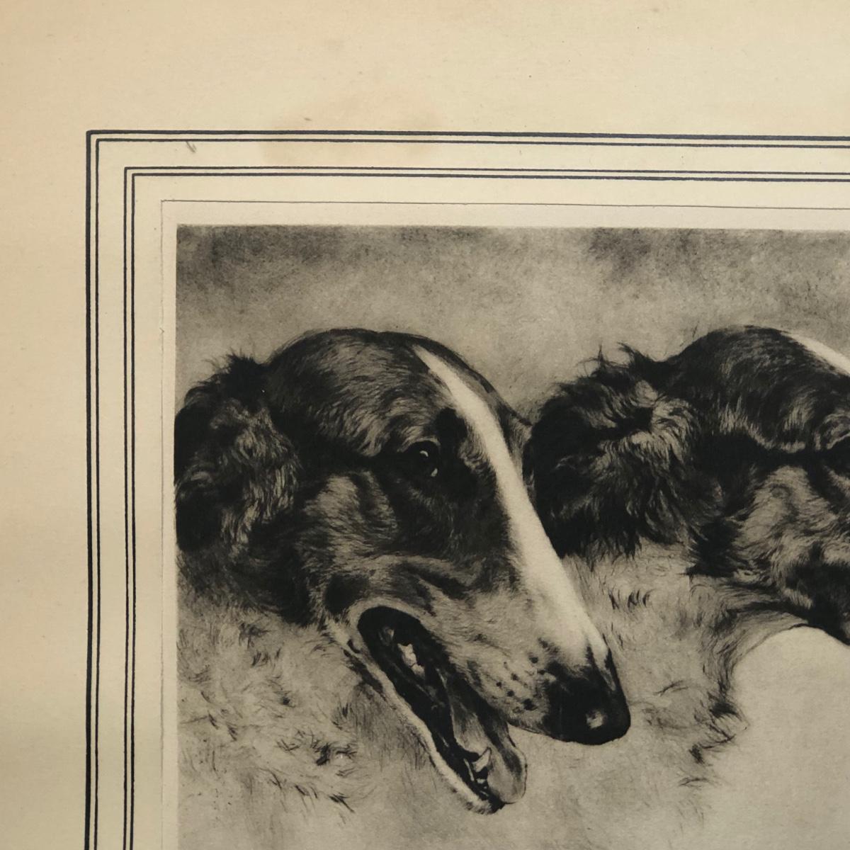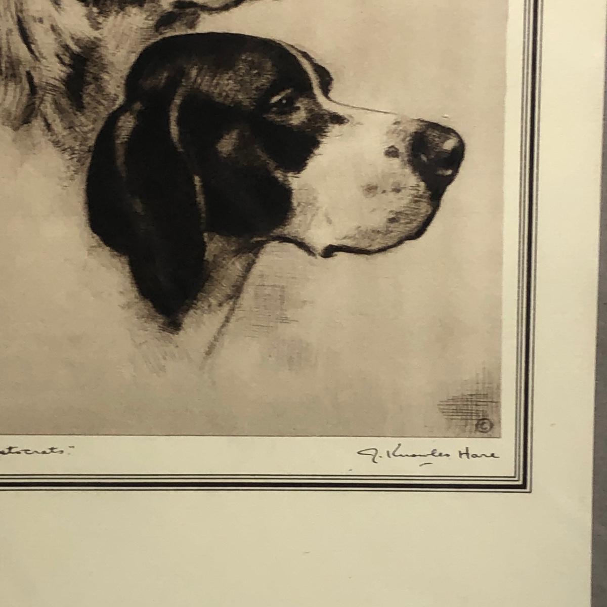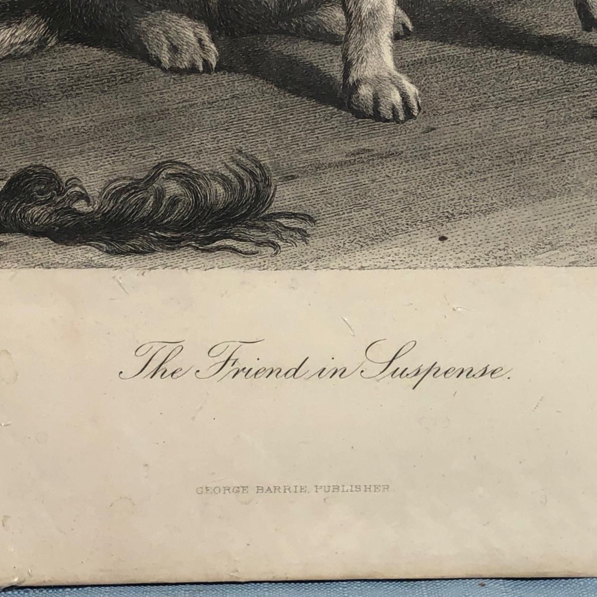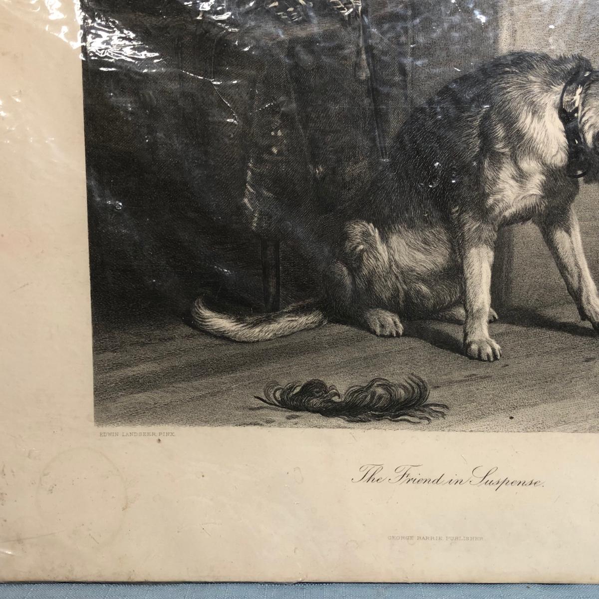LOT 276M: Fox Terrier Cross Stitch, "The Three Dogs" signed Sir E. Landseer, Signed P{air of Hounds Print, E. Landseer "The Friend in Suspense" Print & Signed Aristocrats Print by J.K. Hare
