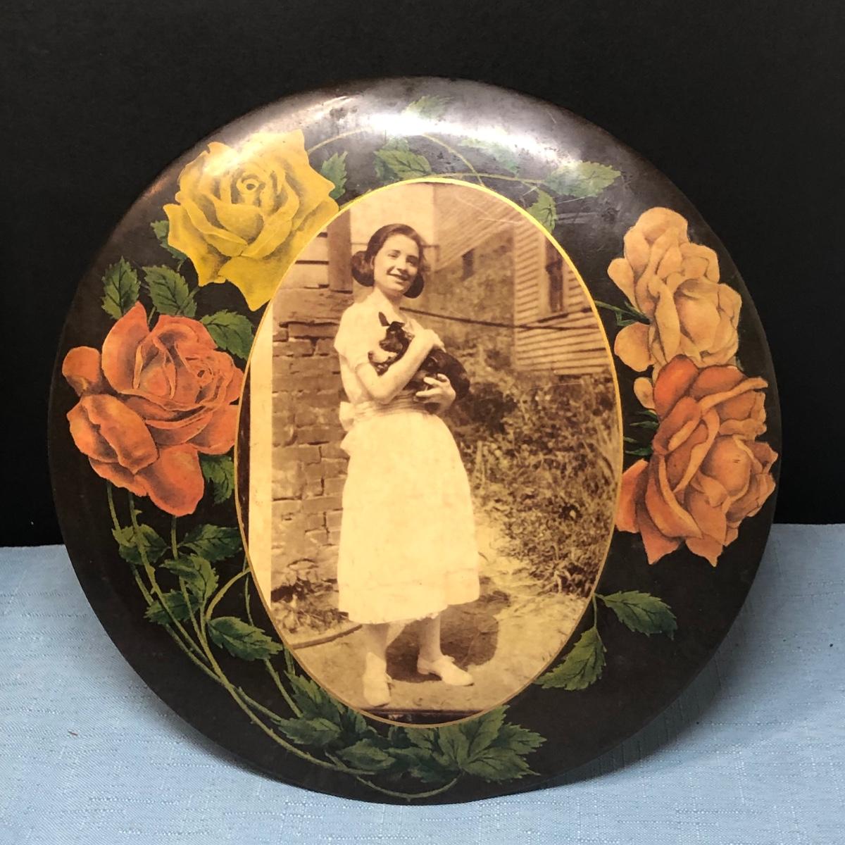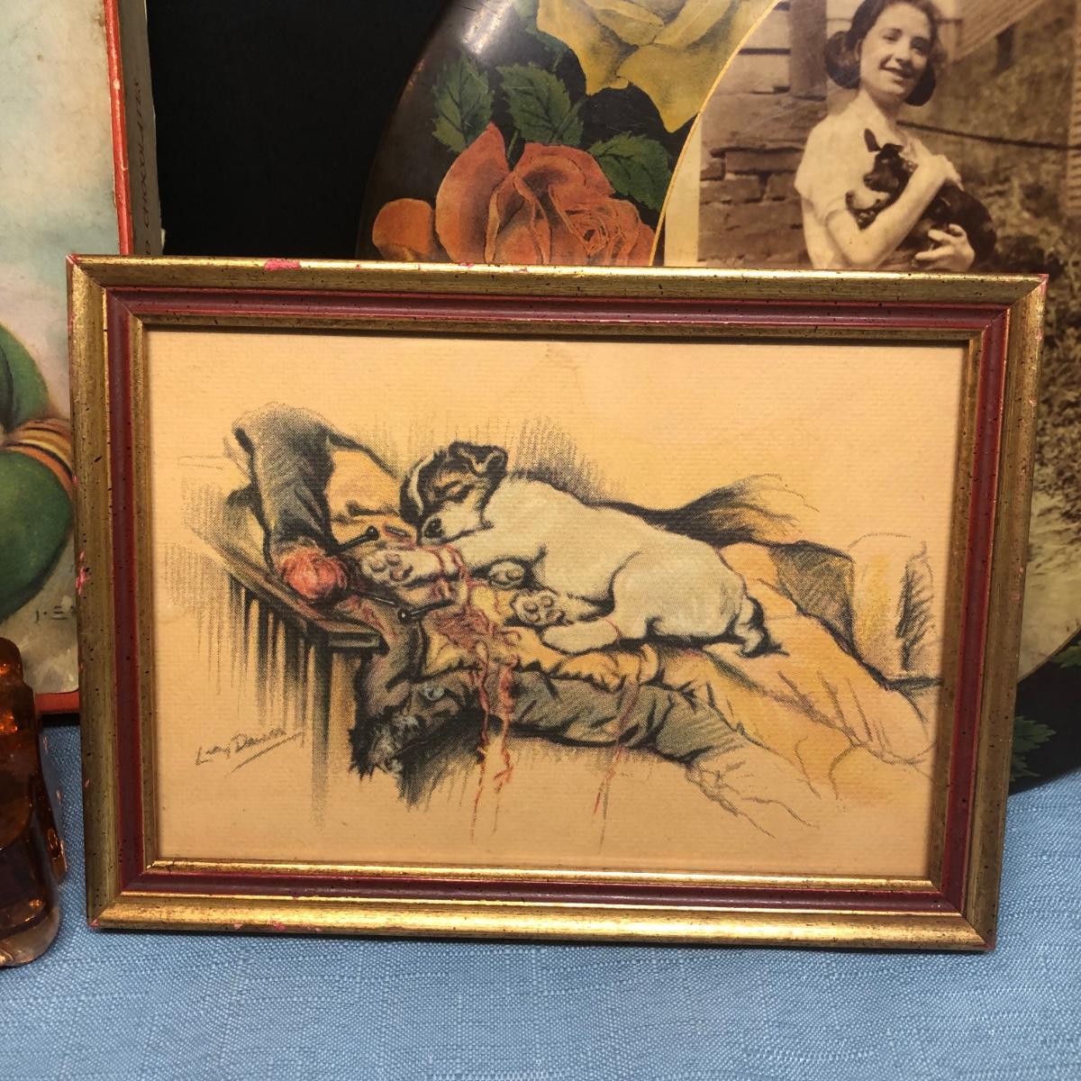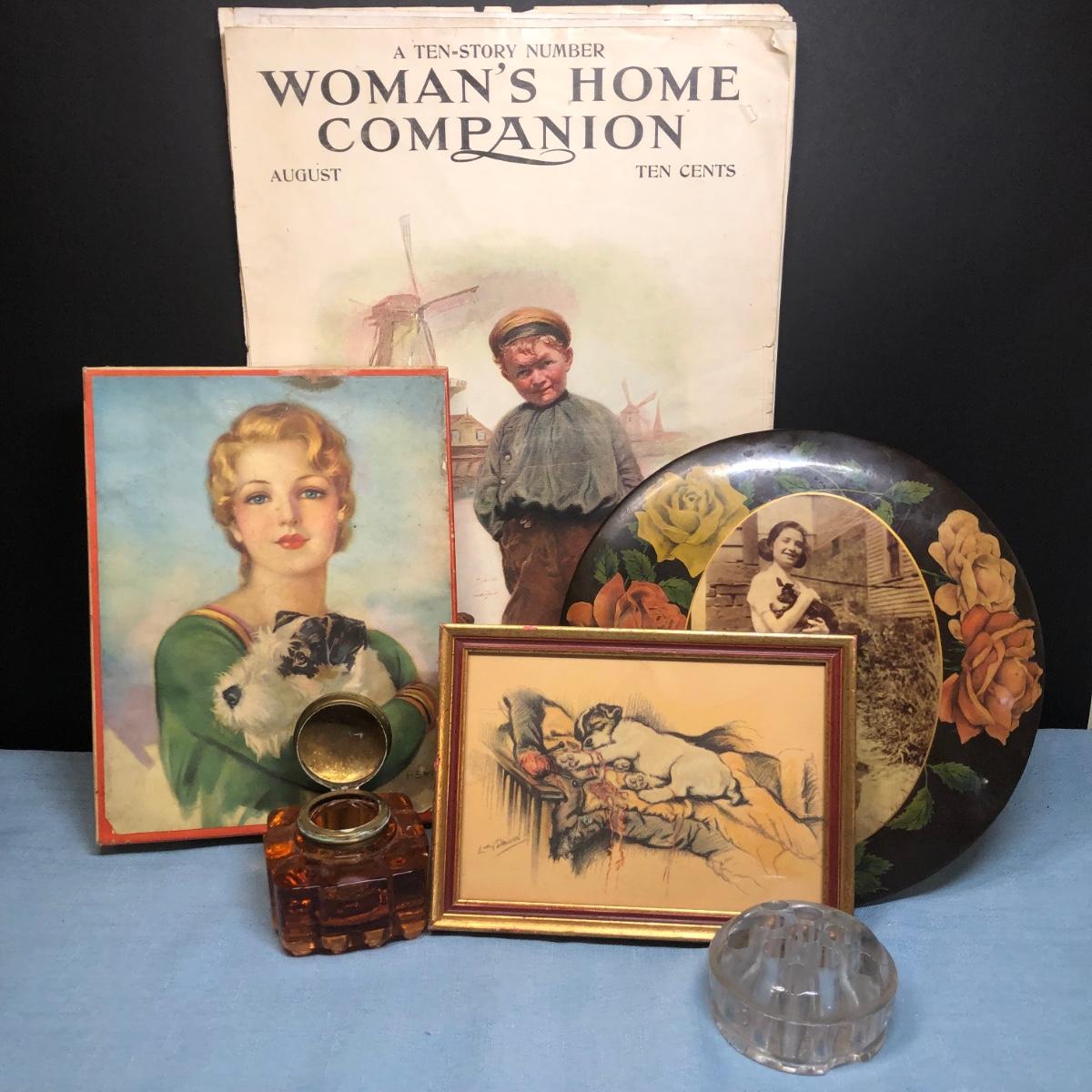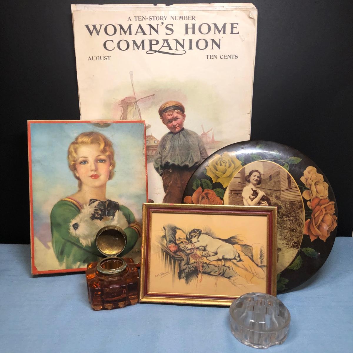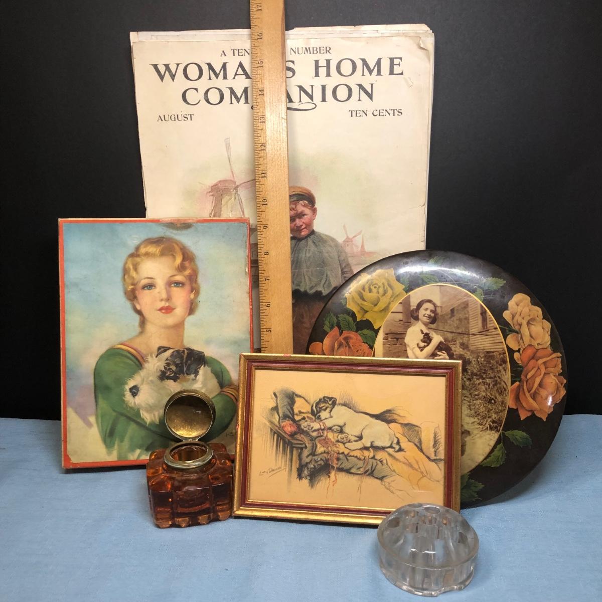 LOT 277M: Vintage Unbound "Woman's Home Companion", Signed Sleeping Pubby Lucy Dawson Postcard Picture, Amber Colored Glass Inkwell, Glass Flower Frog, Antique Photo on Tin Frame & More