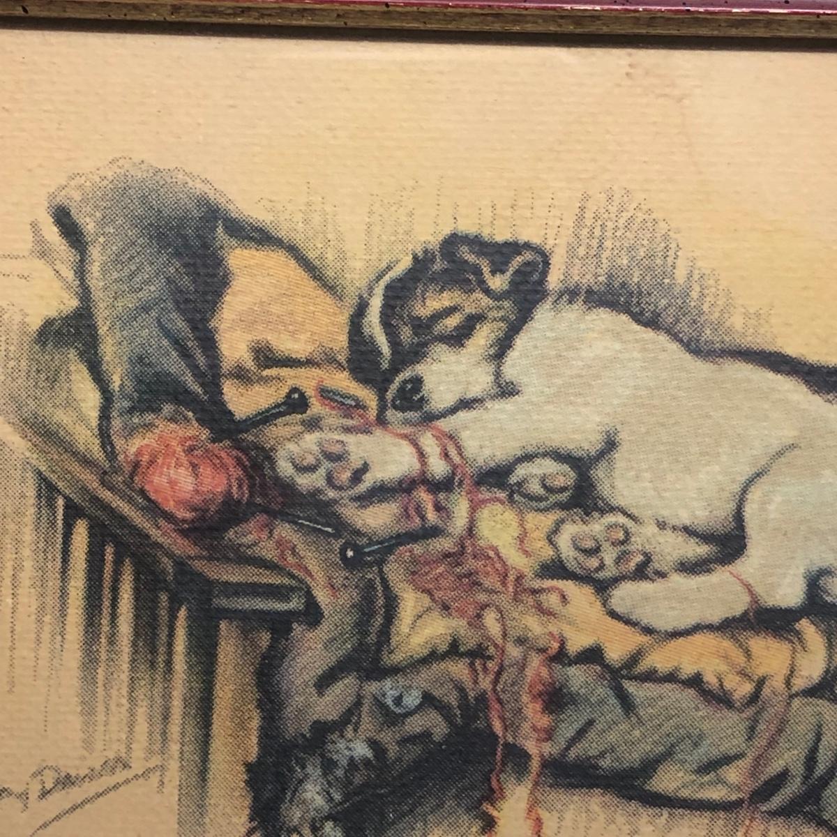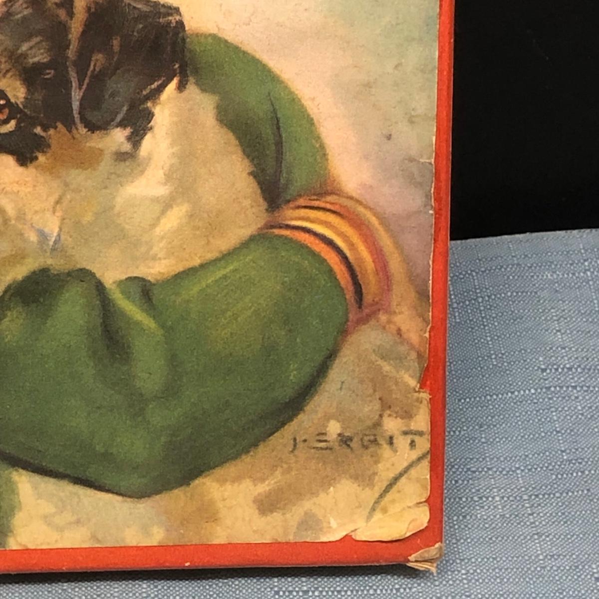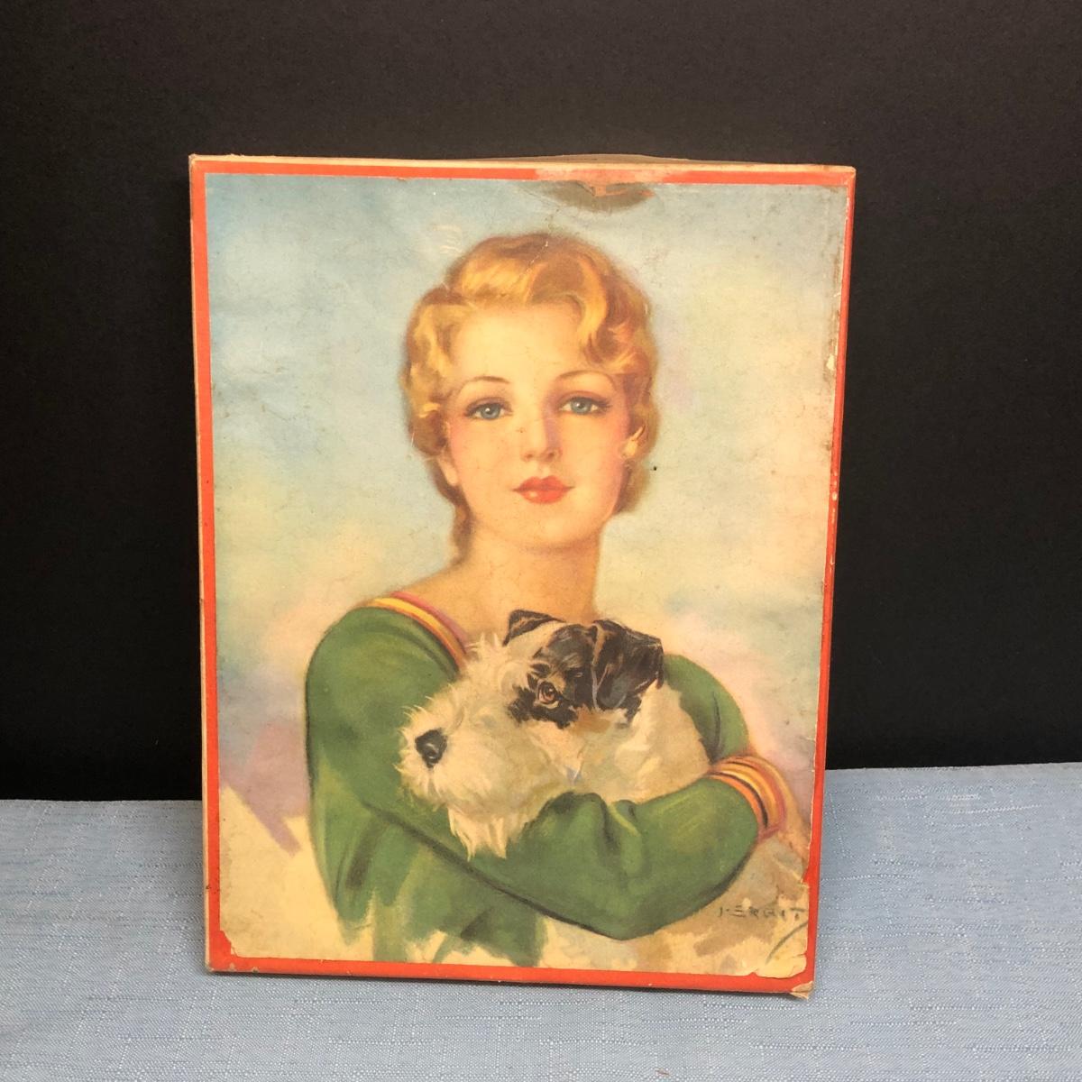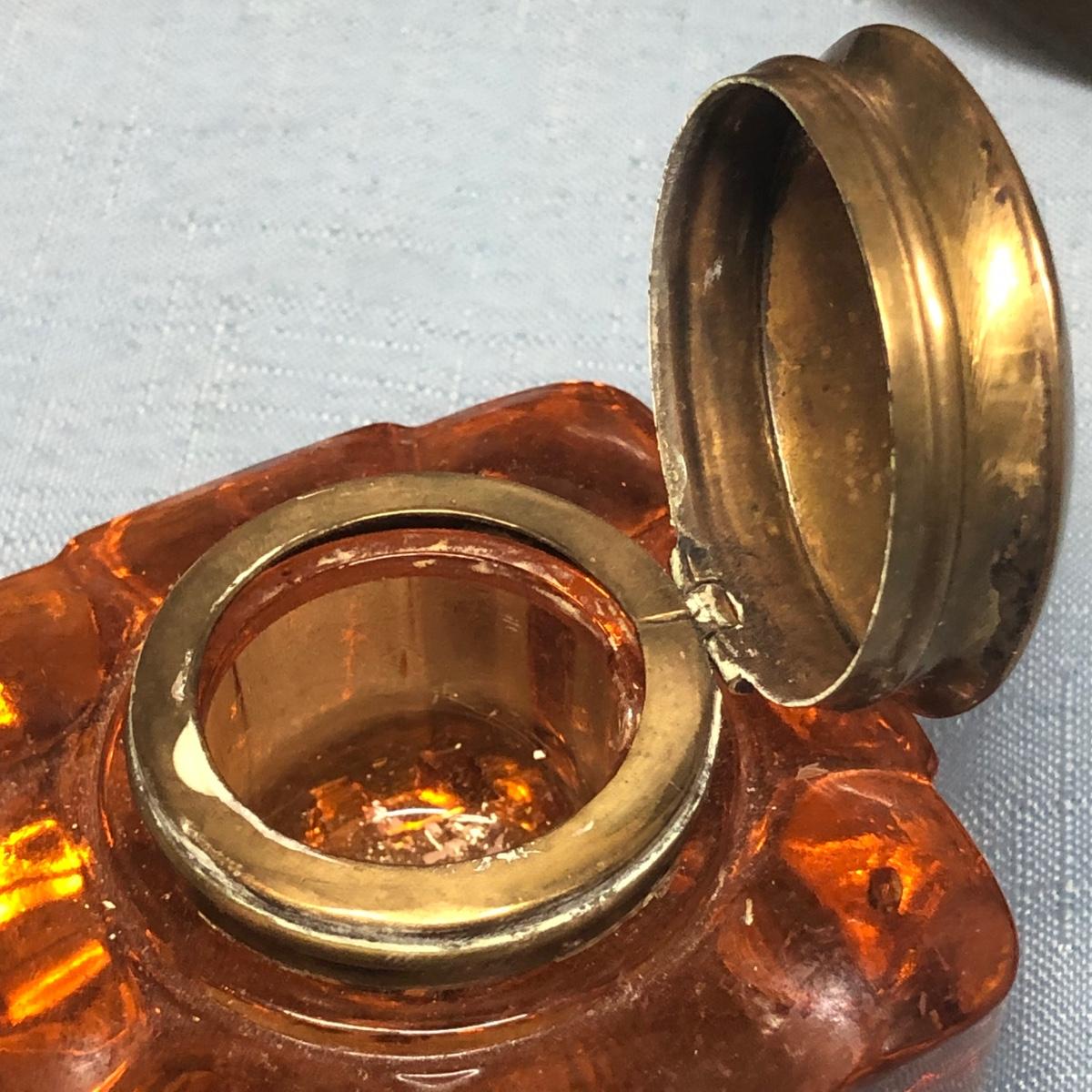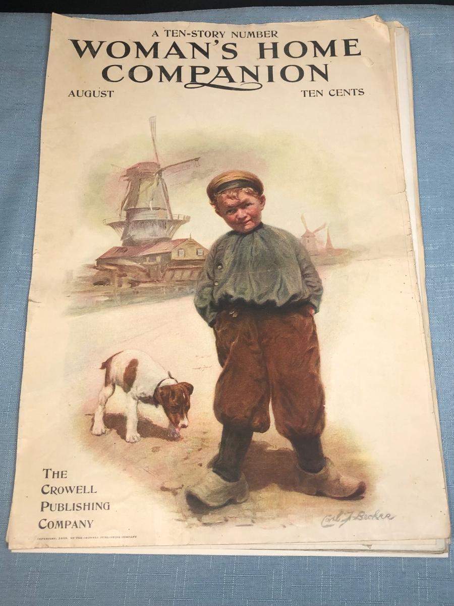 LOT 277M: Vintage Unbound "Woman's Home Companion", Signed Sleeping Pubby Lucy Dawson Postcard Picture, Amber Colored Glass Inkwell, Glass Flower Frog, Antique Photo on Tin Frame & More