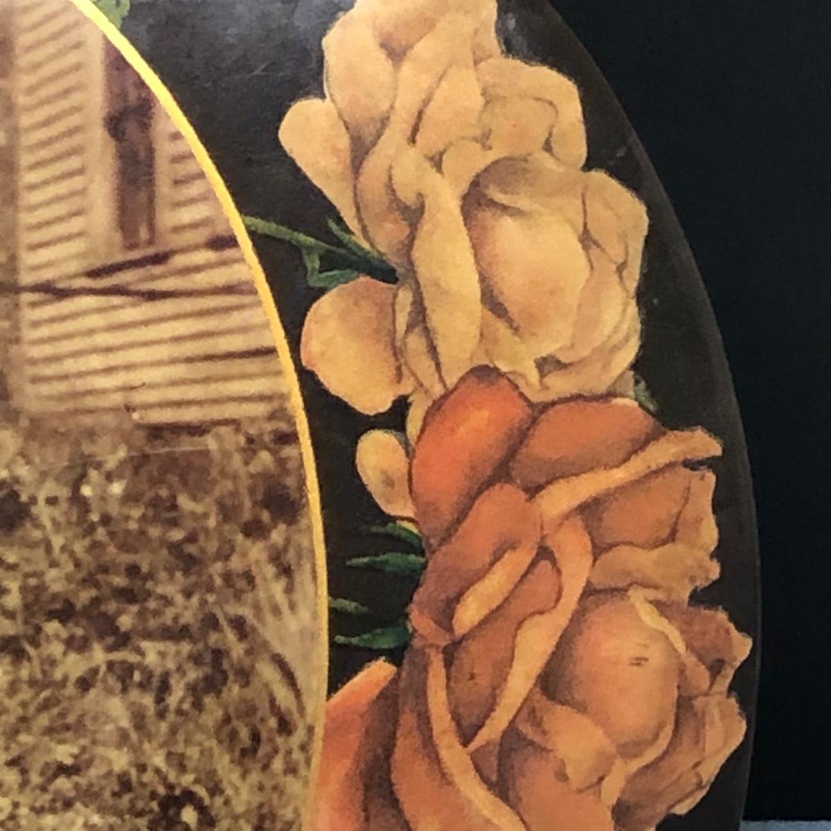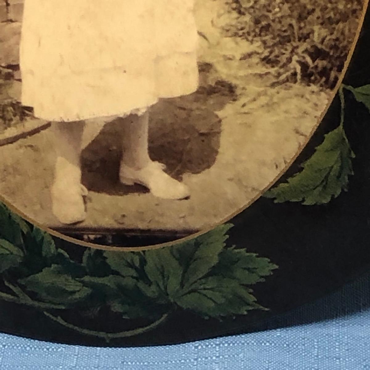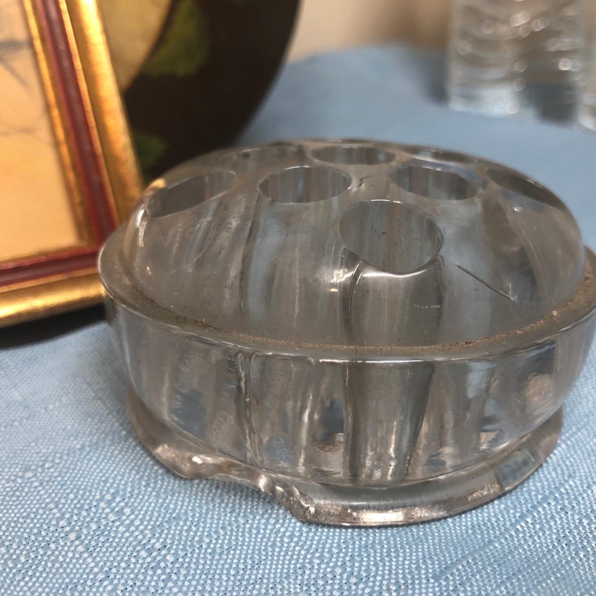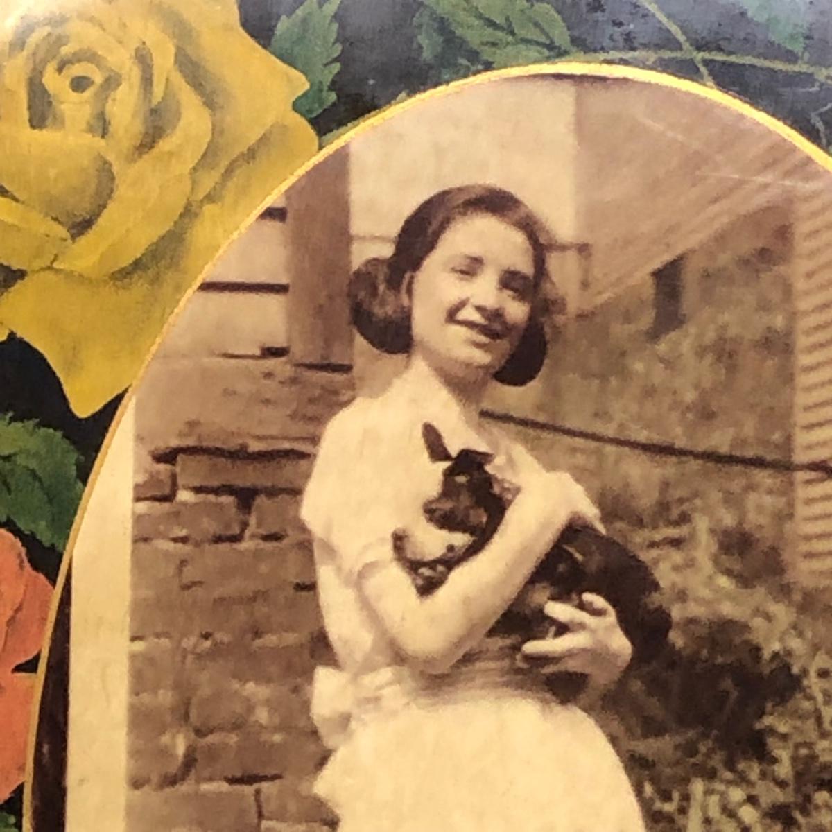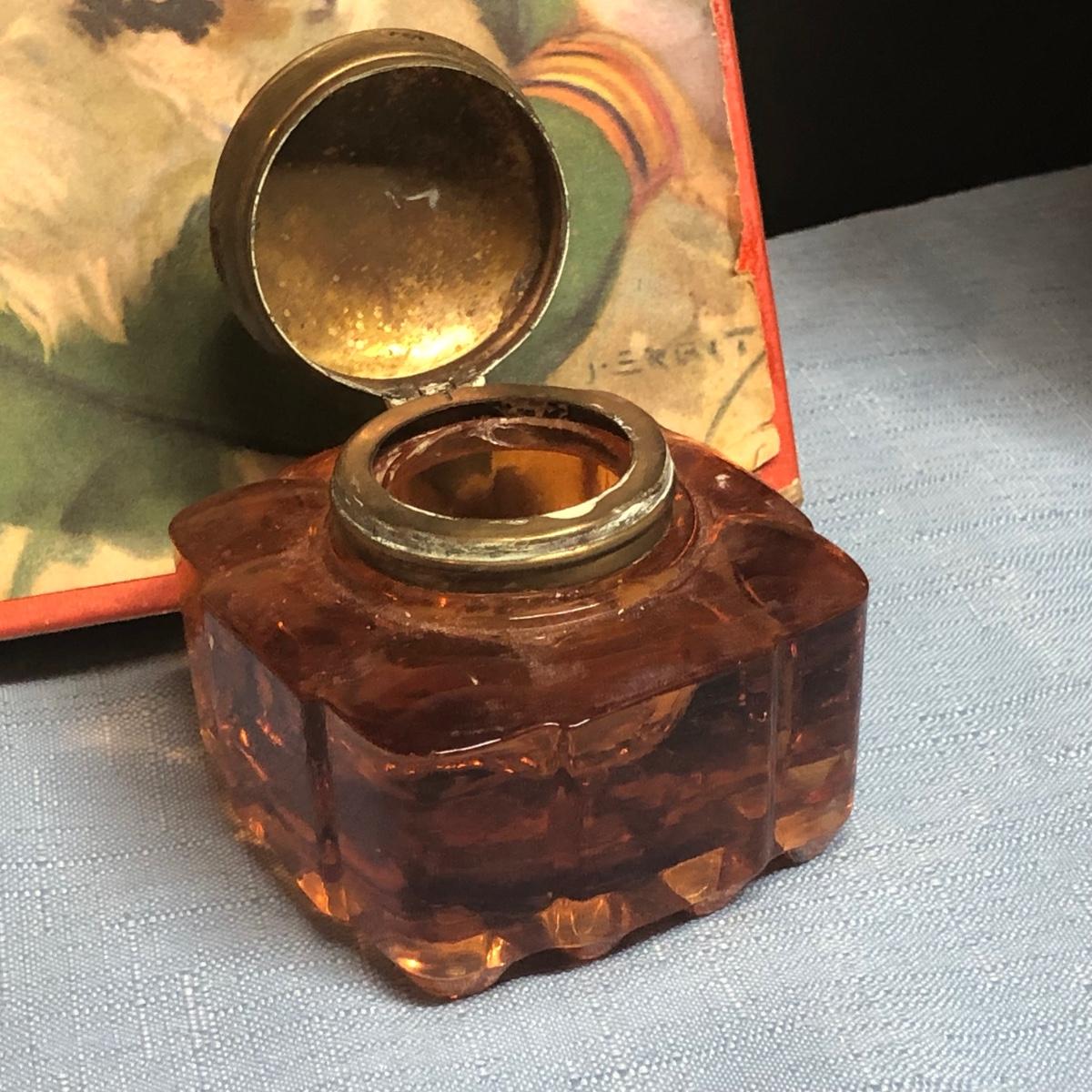 LOT 277M: Vintage Unbound "Woman's Home Companion", Signed Sleeping Pubby Lucy Dawson Postcard Picture, Amber Colored Glass Inkwell, Glass Flower Frog, Antique Photo on Tin Frame & More