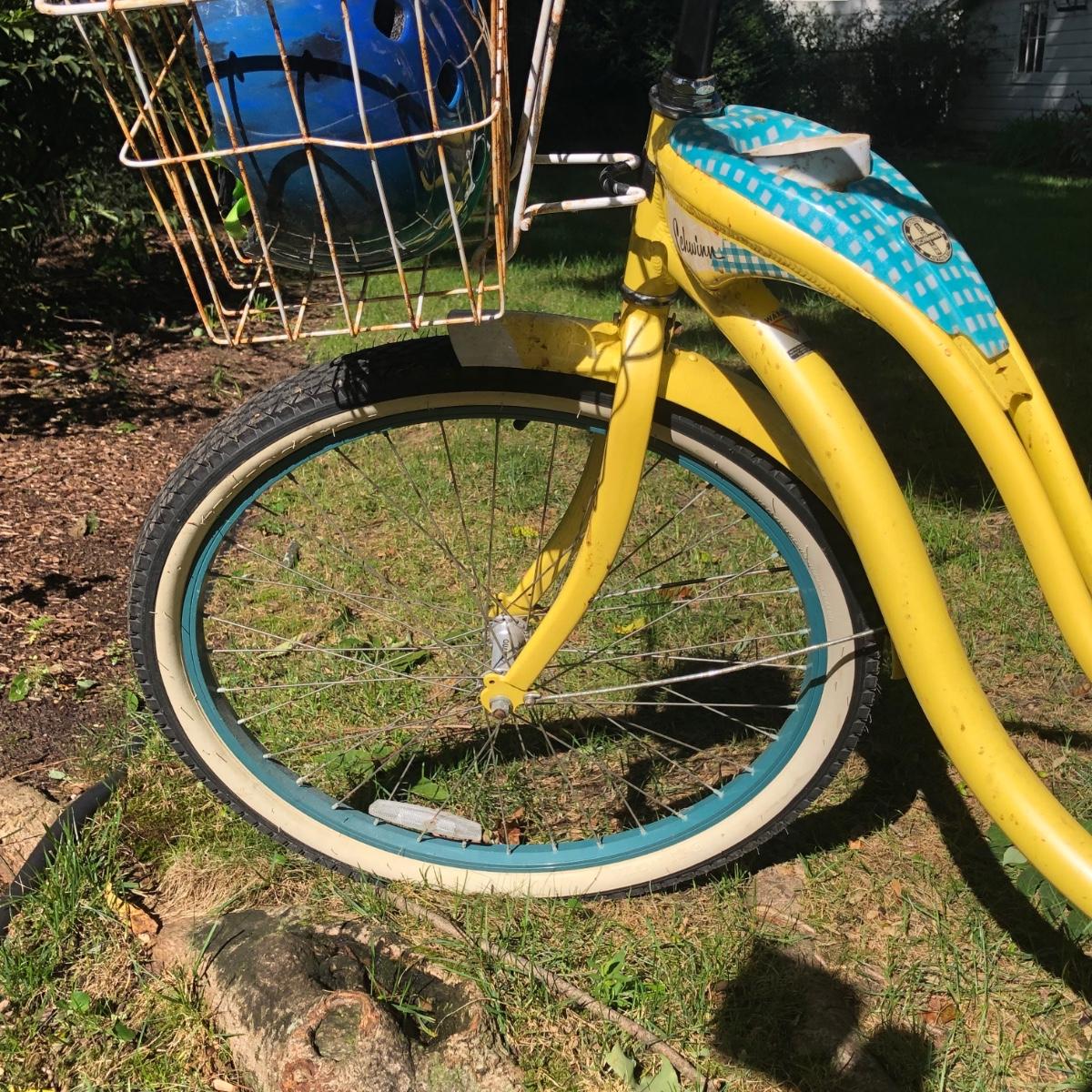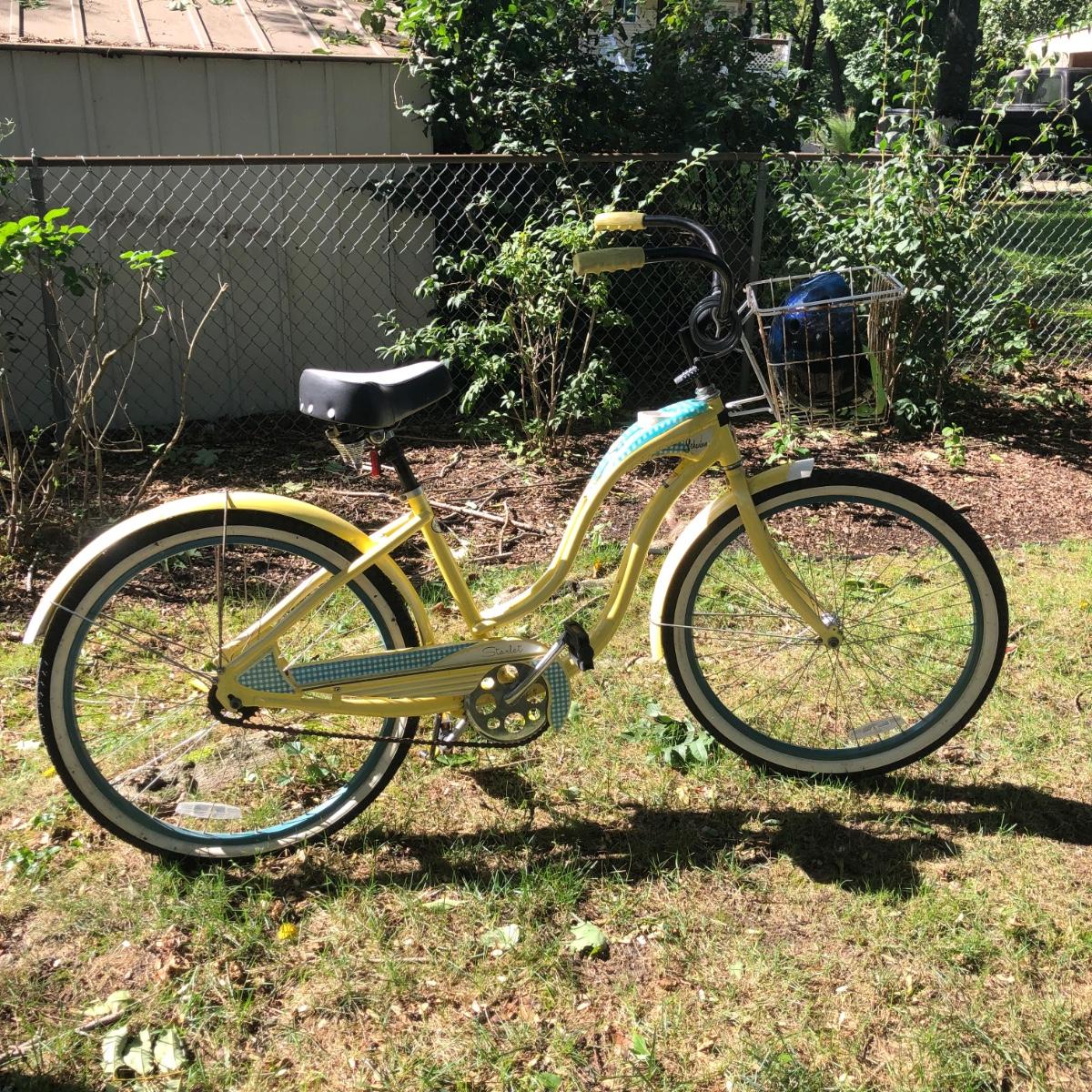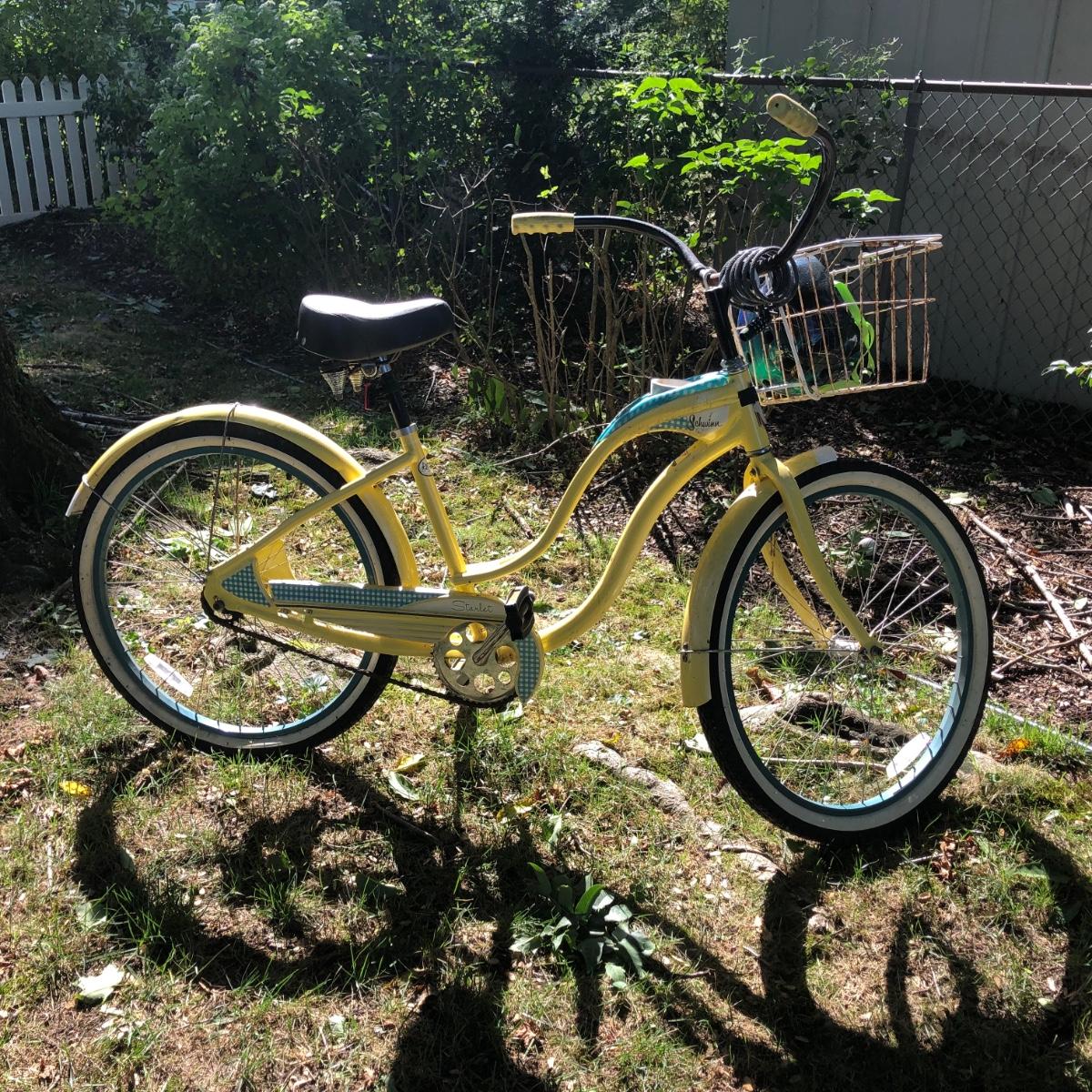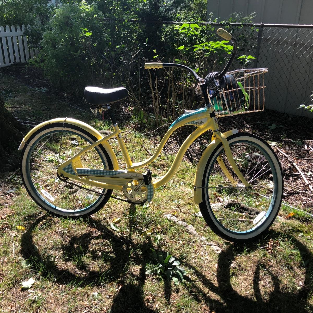 LOT 293M: Schwinn Starlet Yellow & Blue Bike w/ Schwinn Helmet & Bike Lock