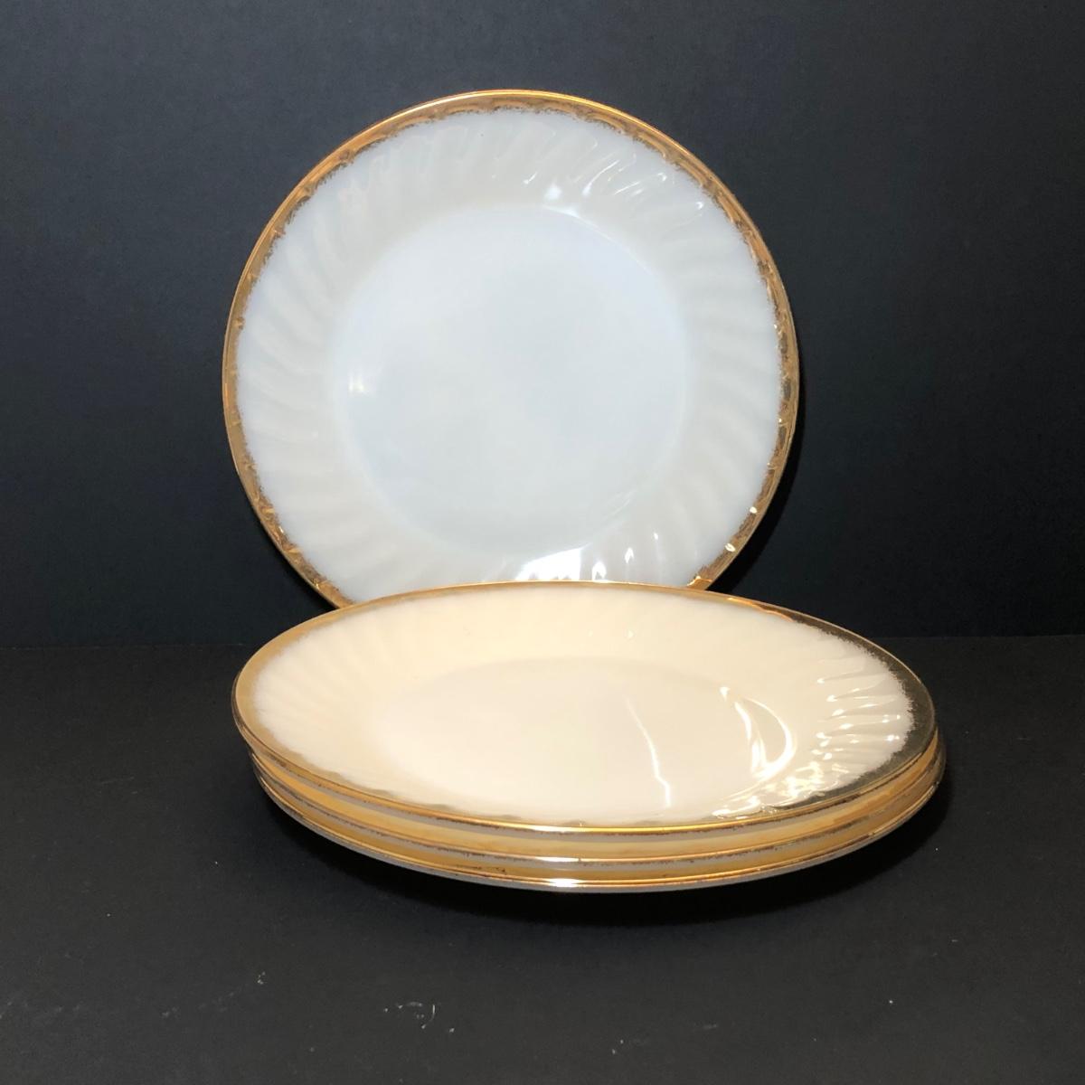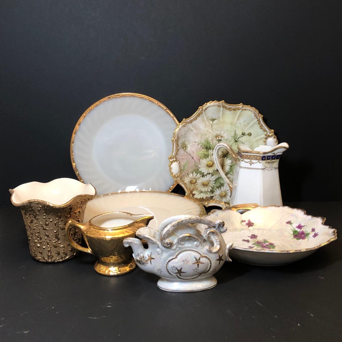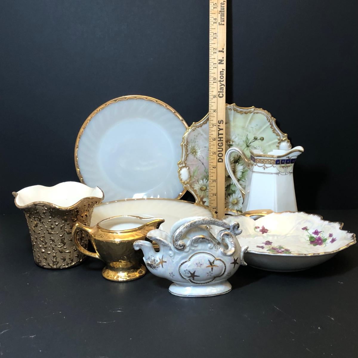 LOT 24L: Fireking Ovenware Plates (4), Limoges France Hand Painted Plate, "Sweet Violet" Dish, 22kt Gold Decorated Dahaba China Pitcher & More