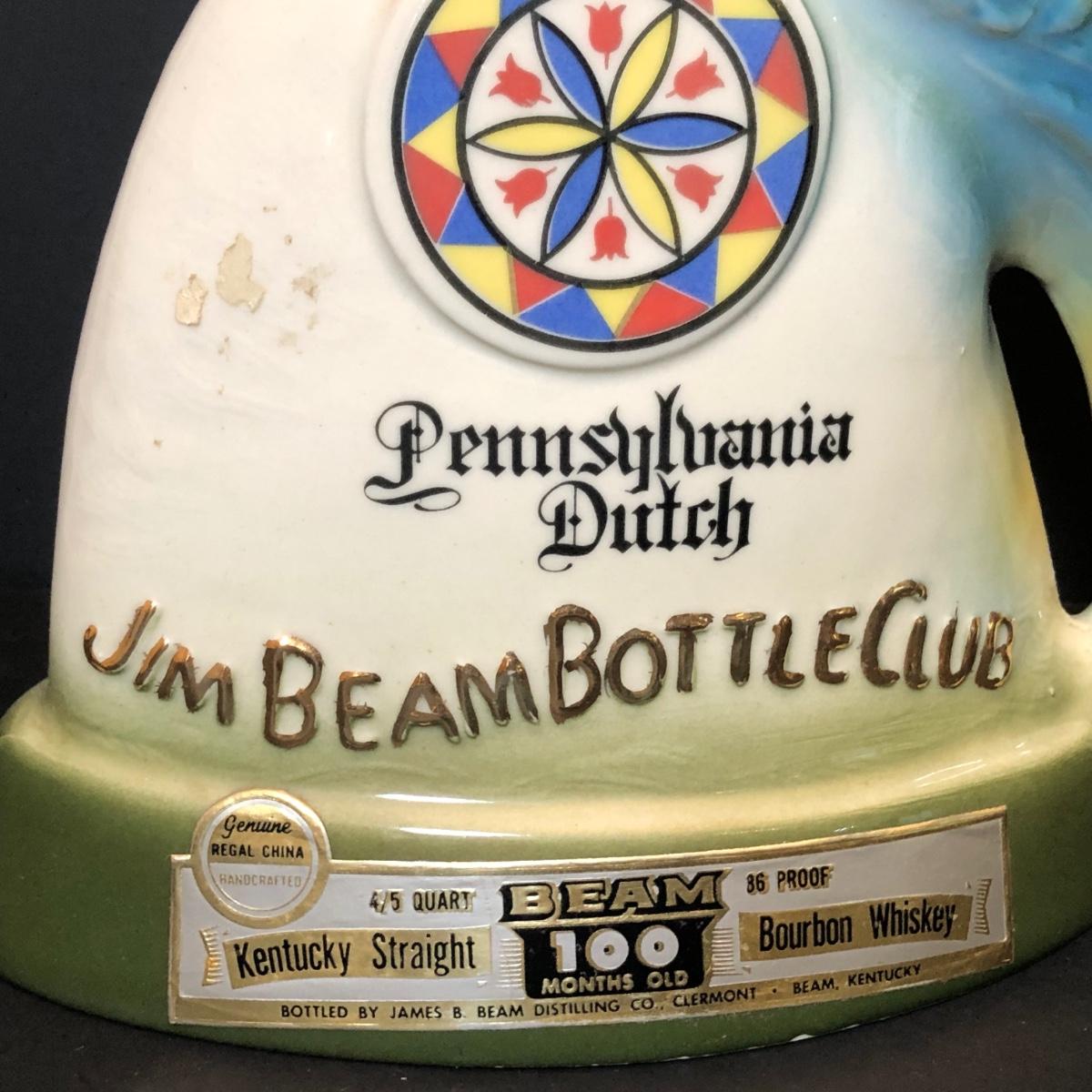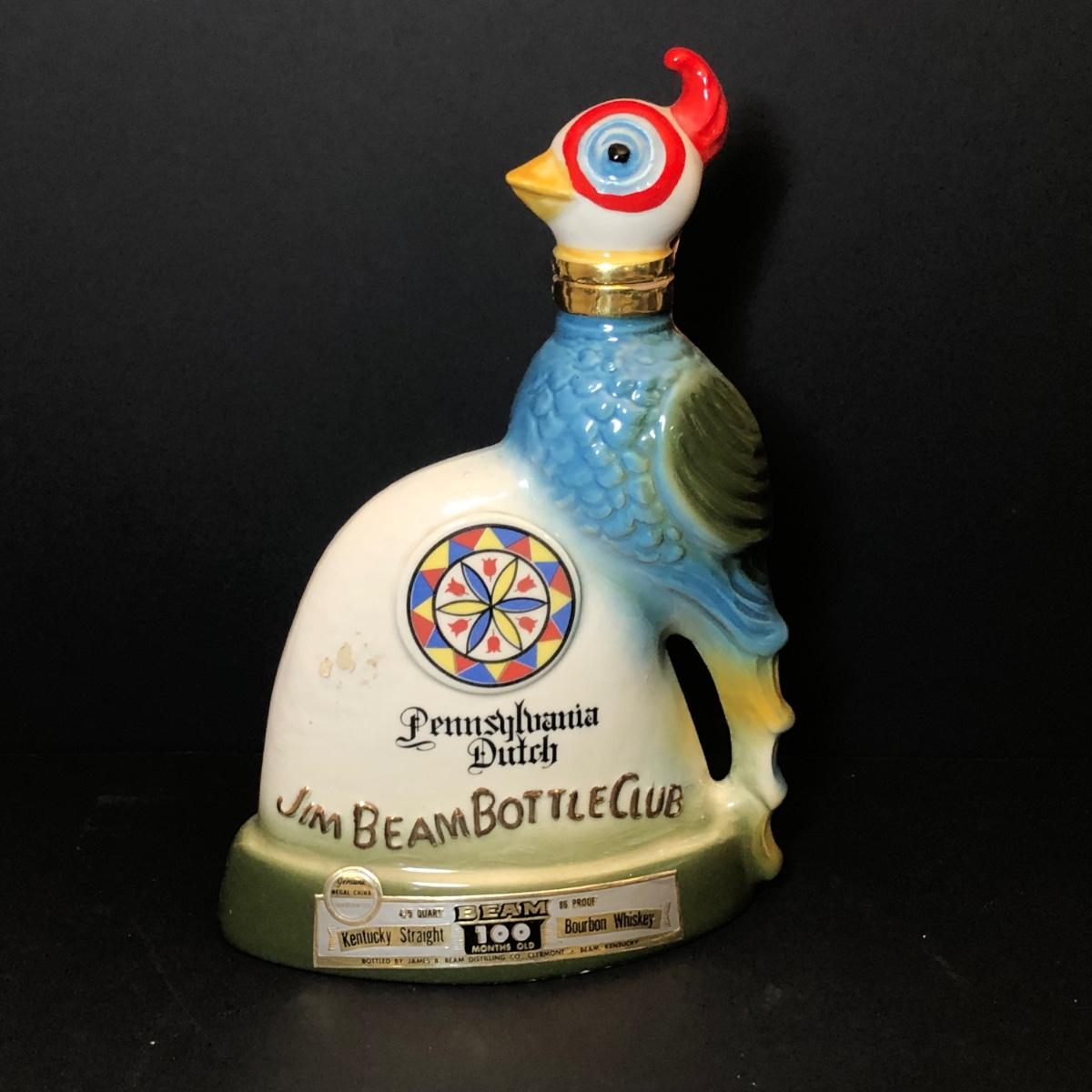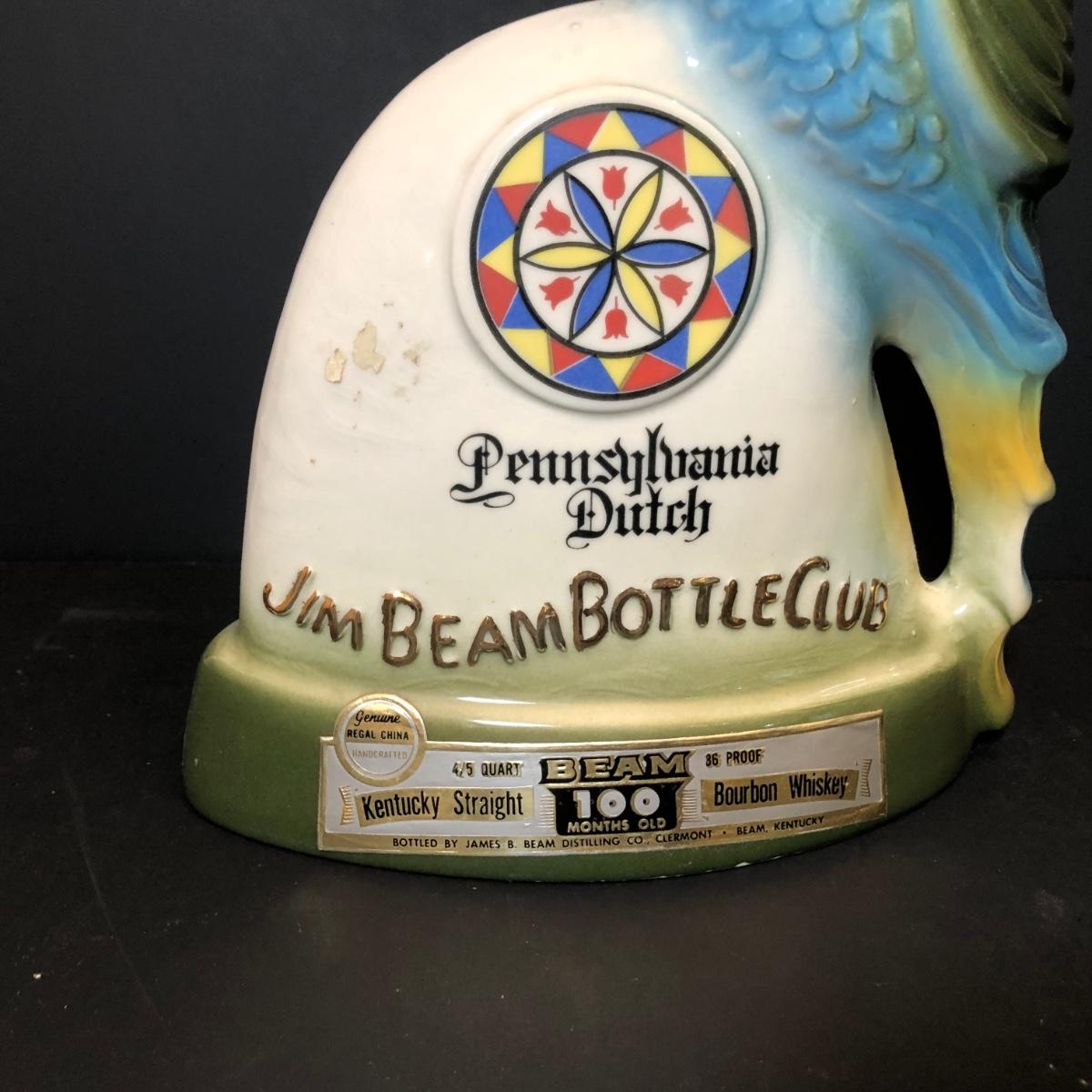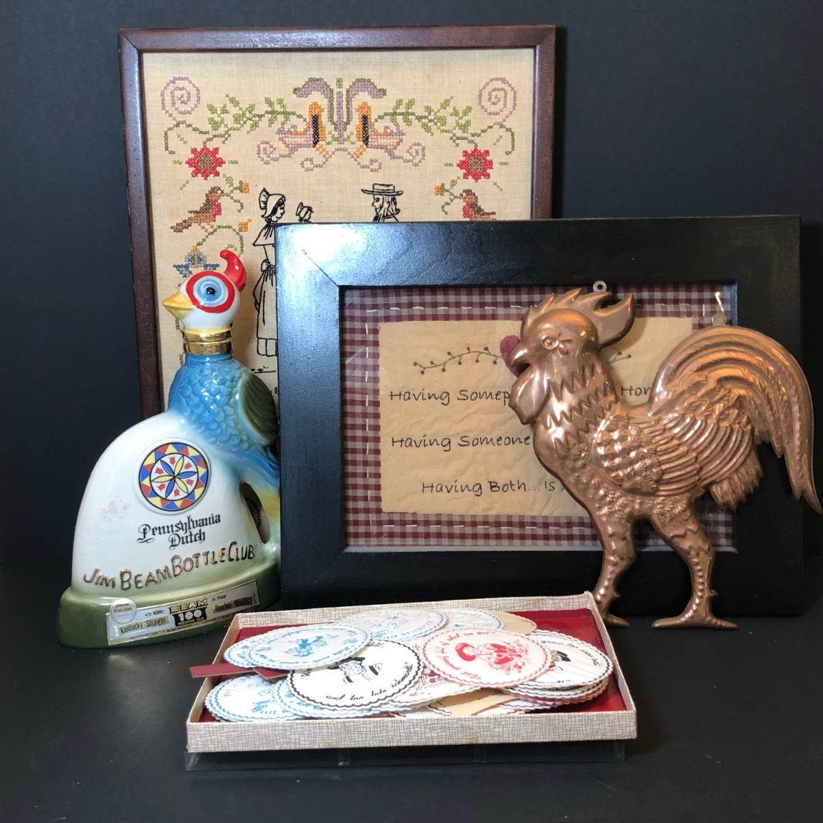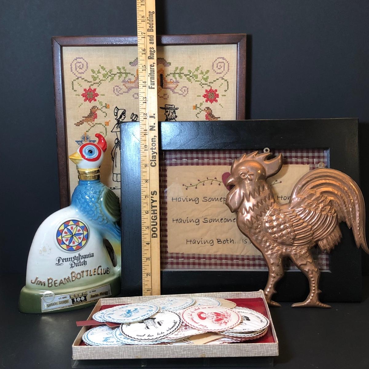 LOT 28D: Vintage 1974 Jim Beam Pennsylvania Dutch Bottle Club Decanter, Cross Stitch Home Decor, Oak Wood Acre Primitives Framed Piece, Royal Catch-All Coasters & Rooster Decor