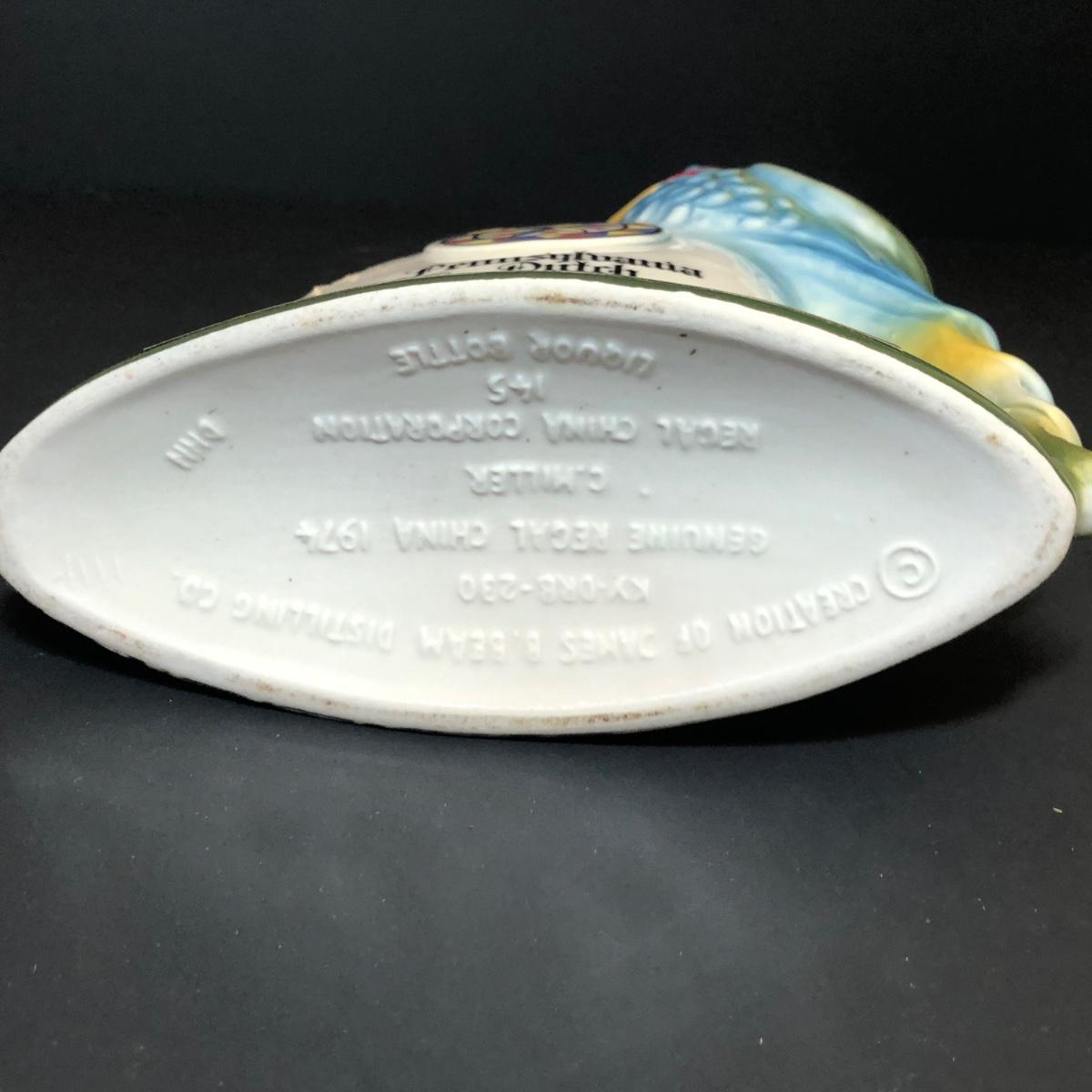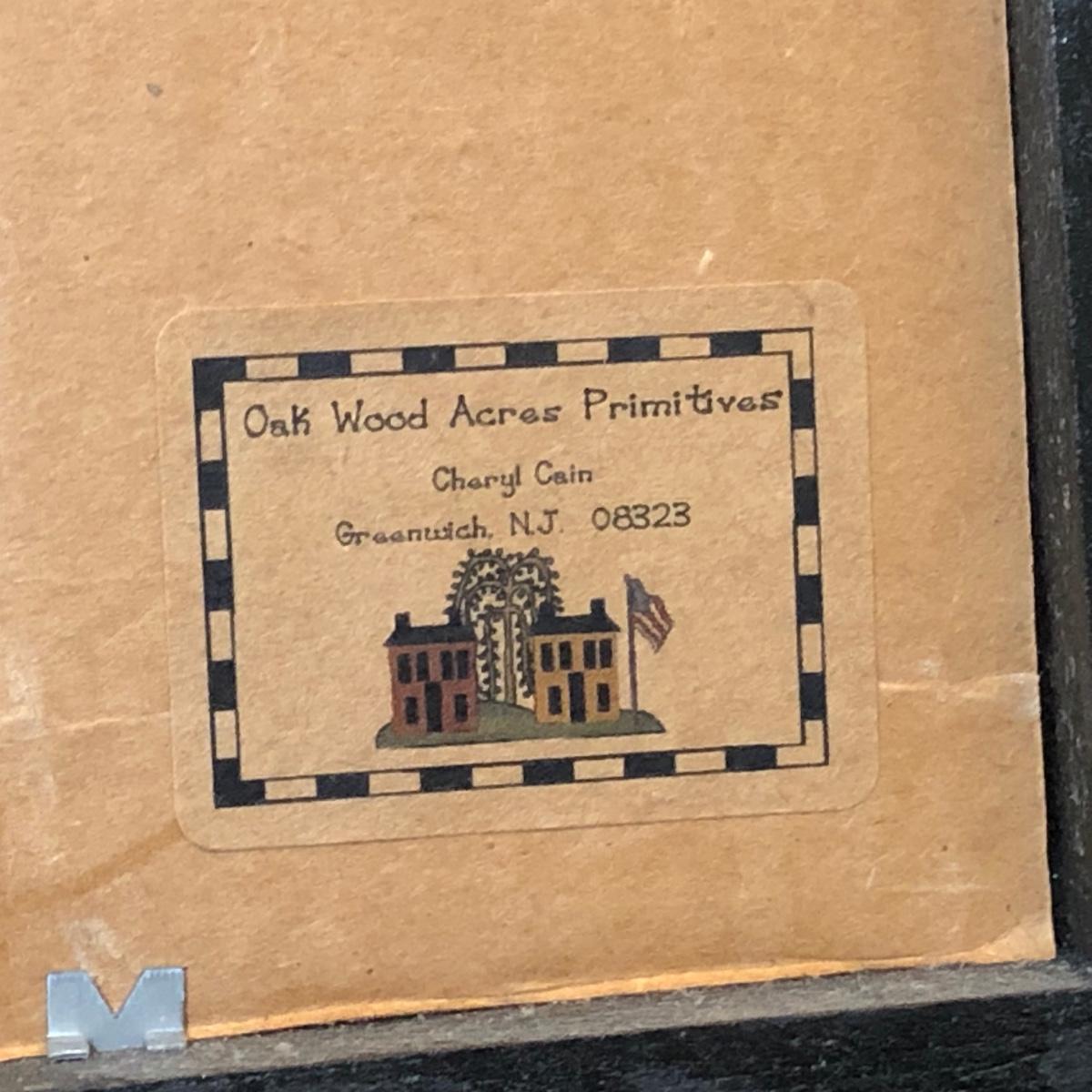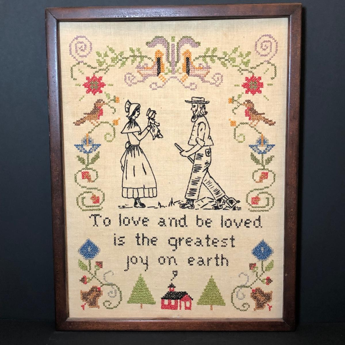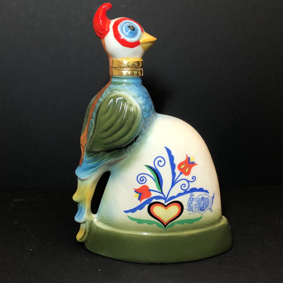 LOT 28D: Vintage 1974 Jim Beam Pennsylvania Dutch Bottle Club Decanter, Cross Stitch Home Decor, Oak Wood Acre Primitives Framed Piece, Royal Catch-All Coasters & Rooster Decor
