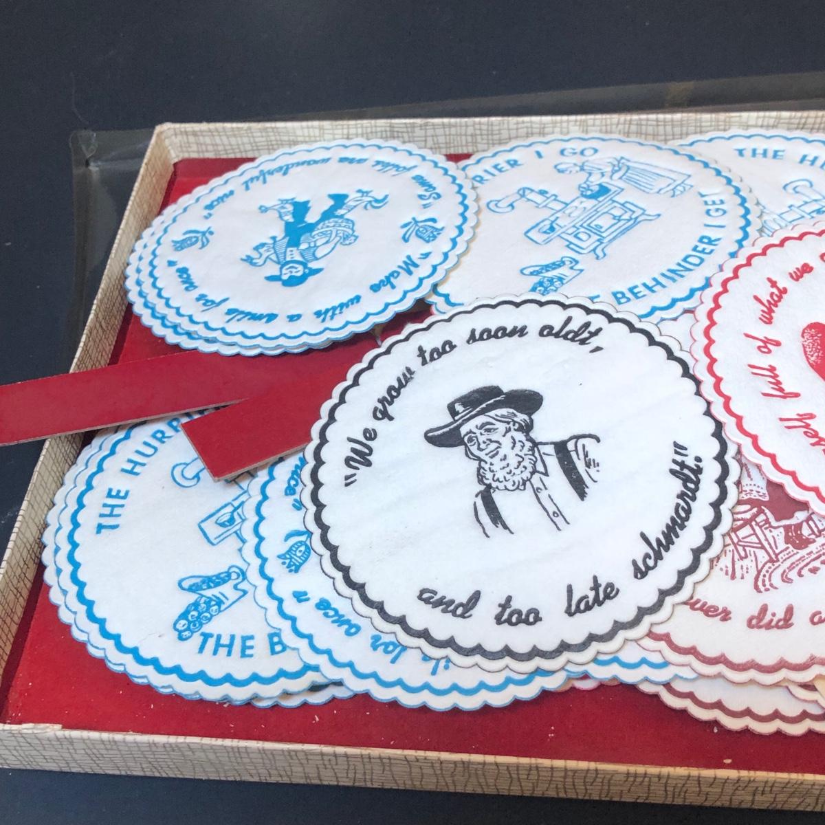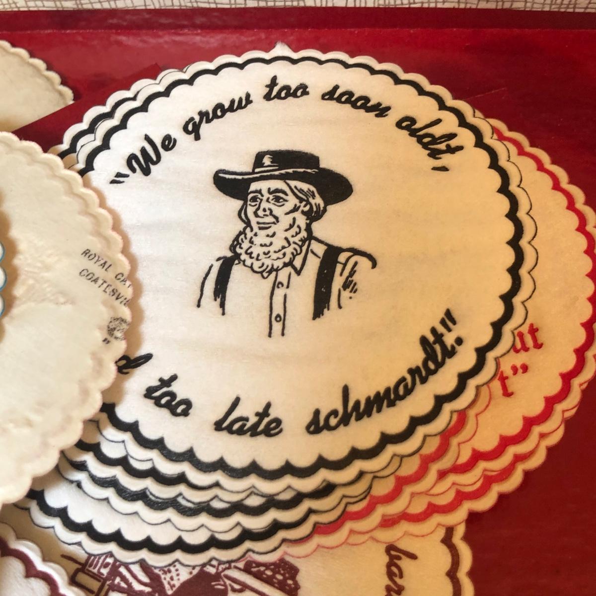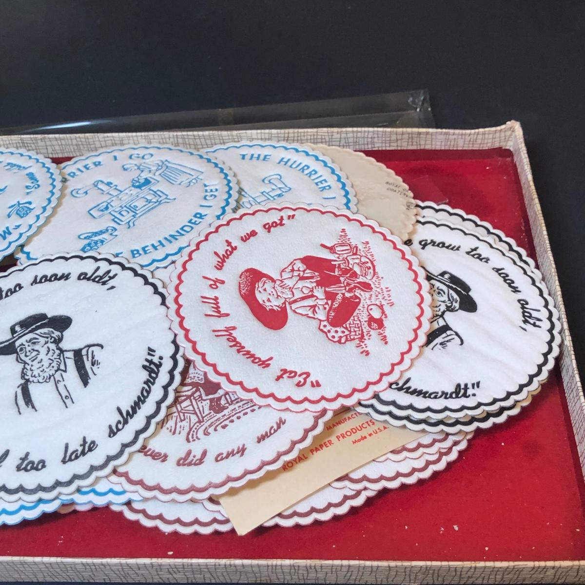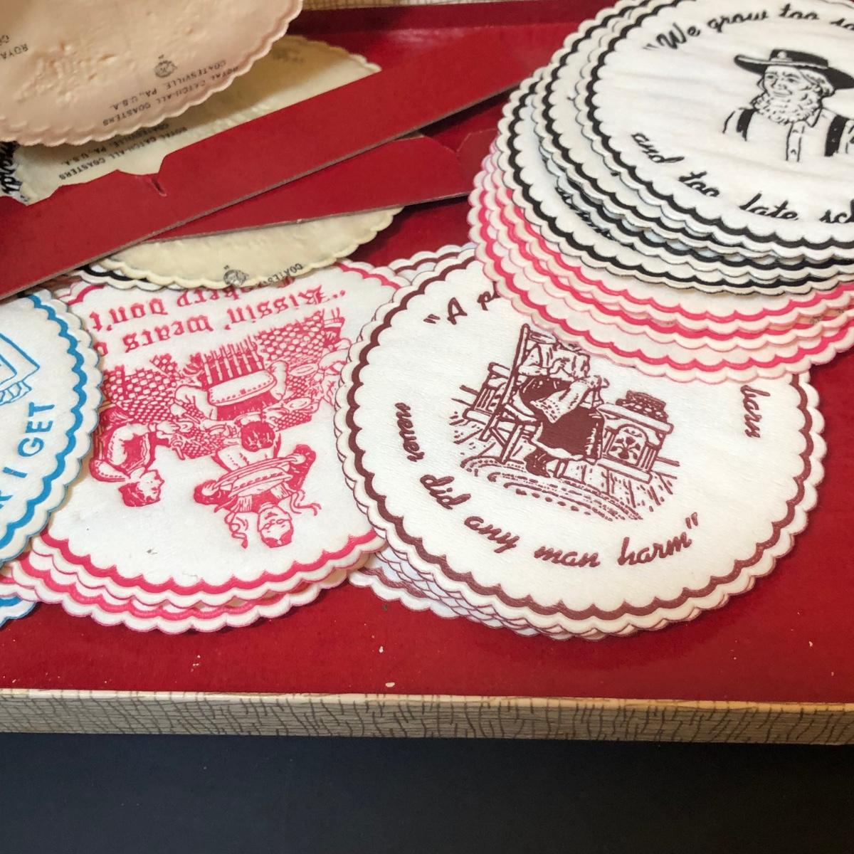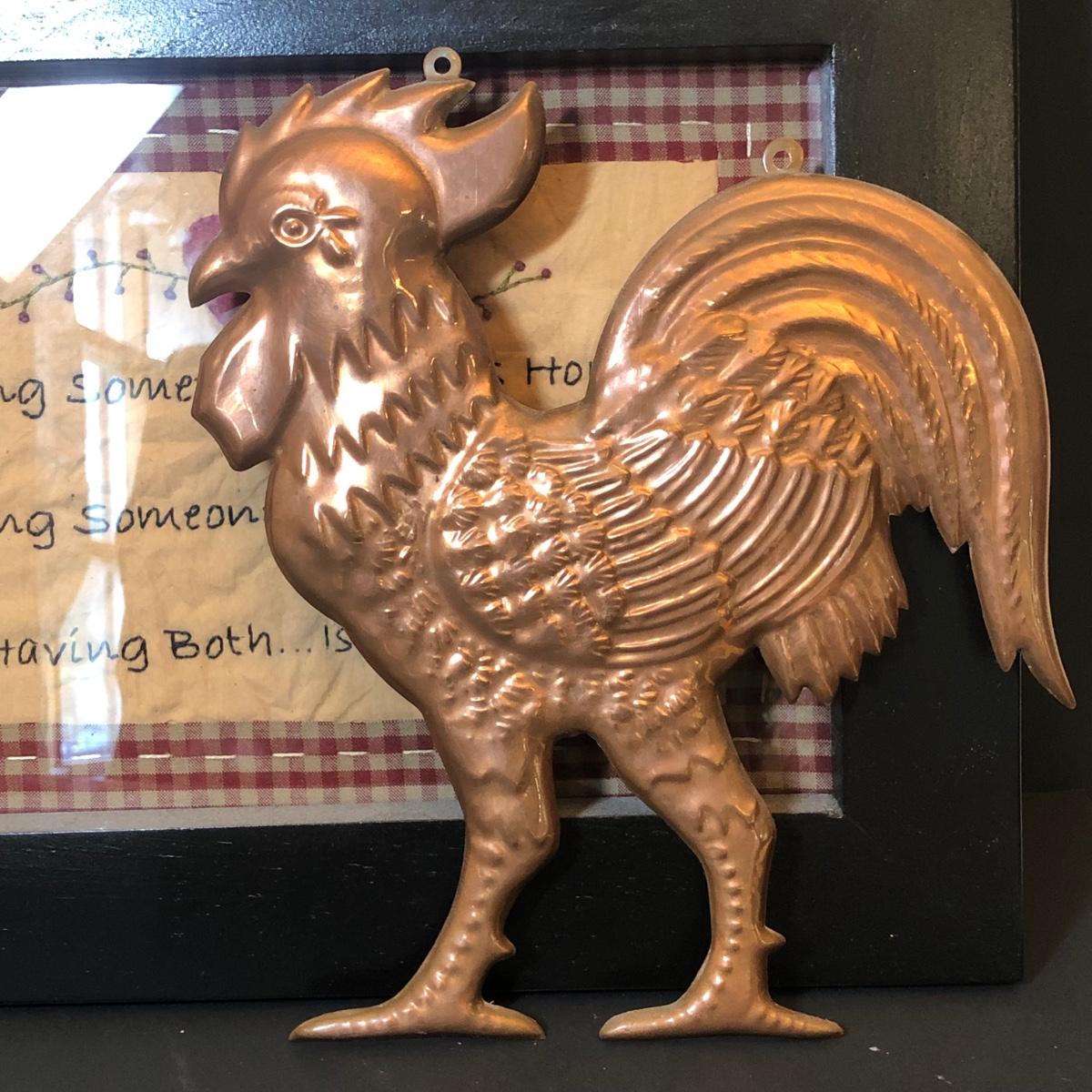 LOT 28D: Vintage 1974 Jim Beam Pennsylvania Dutch Bottle Club Decanter, Cross Stitch Home Decor, Oak Wood Acre Primitives Framed Piece, Royal Catch-All Coasters & Rooster Decor