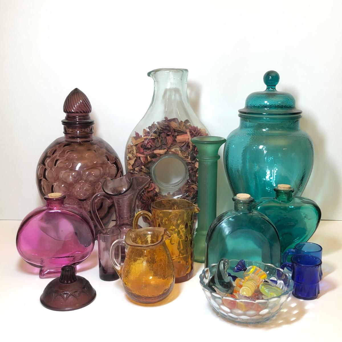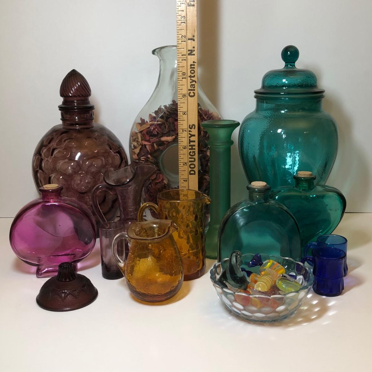 LOT 48L: Colorful Glass Collection - Apothecary Style Jars, Potpurri Vase, Small Pitchers & More
