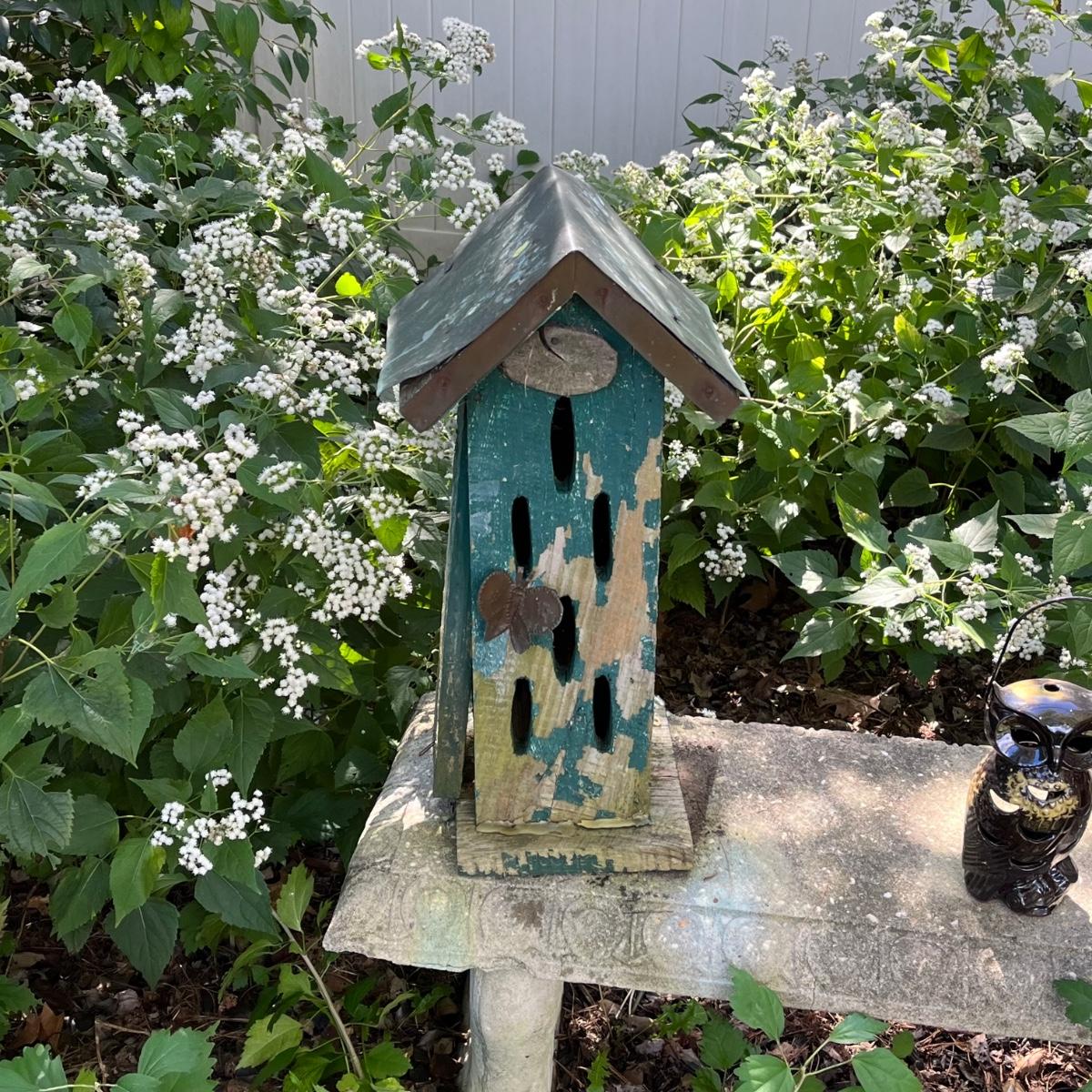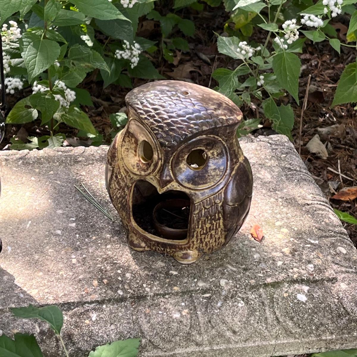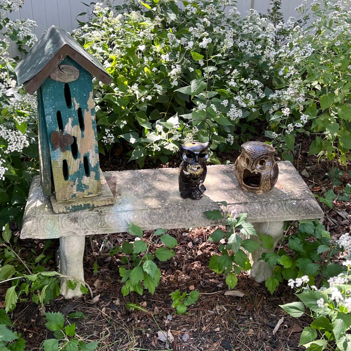 LOT 64Y: Concrete Bench and Garden Decor, Birdhouse, Owls