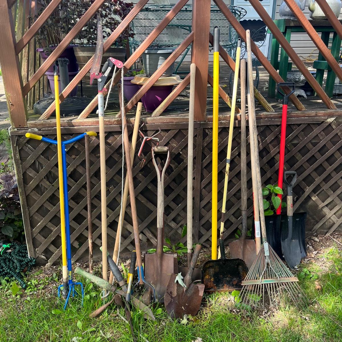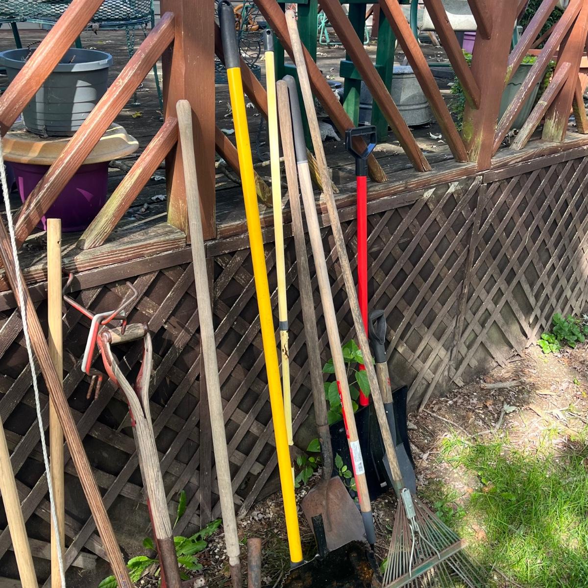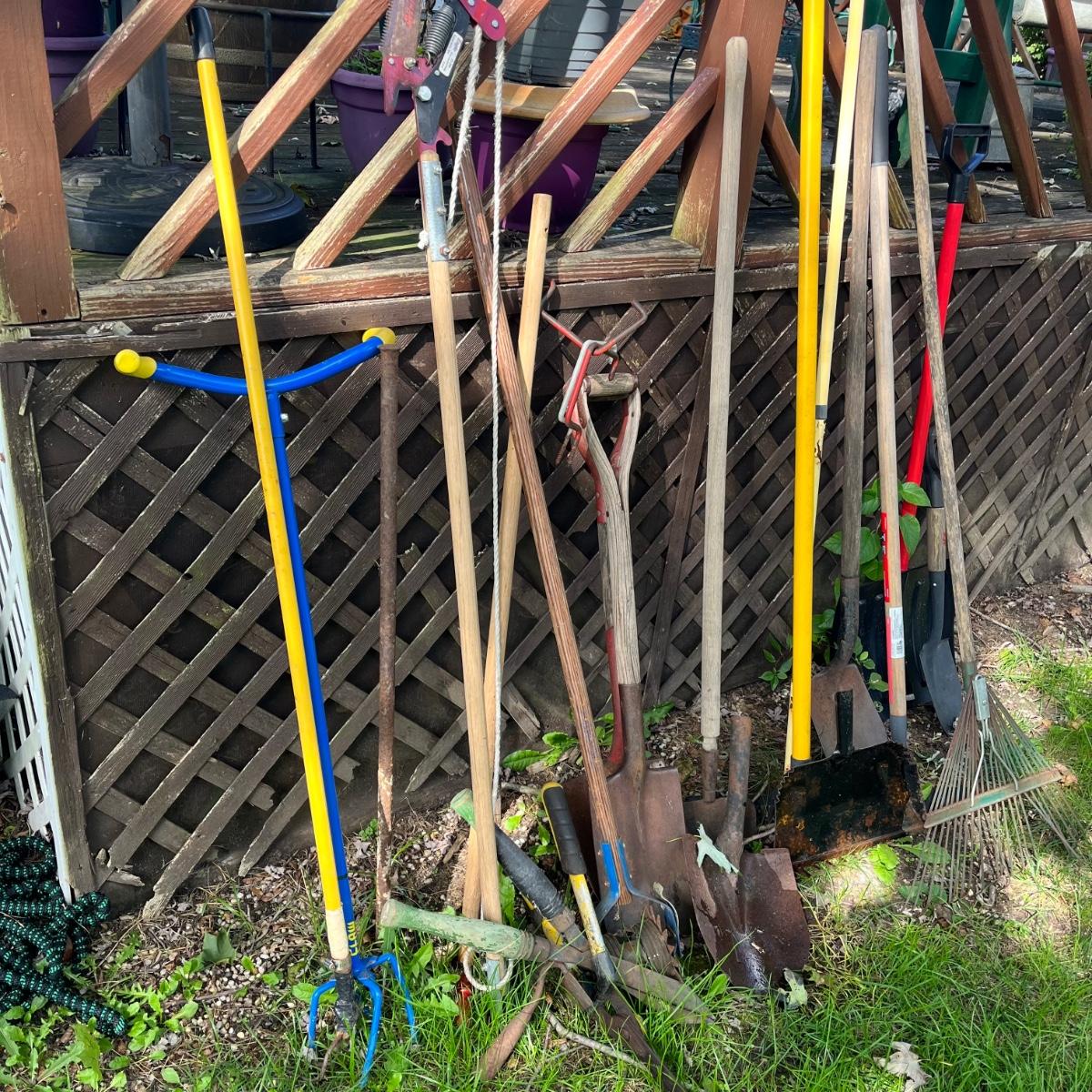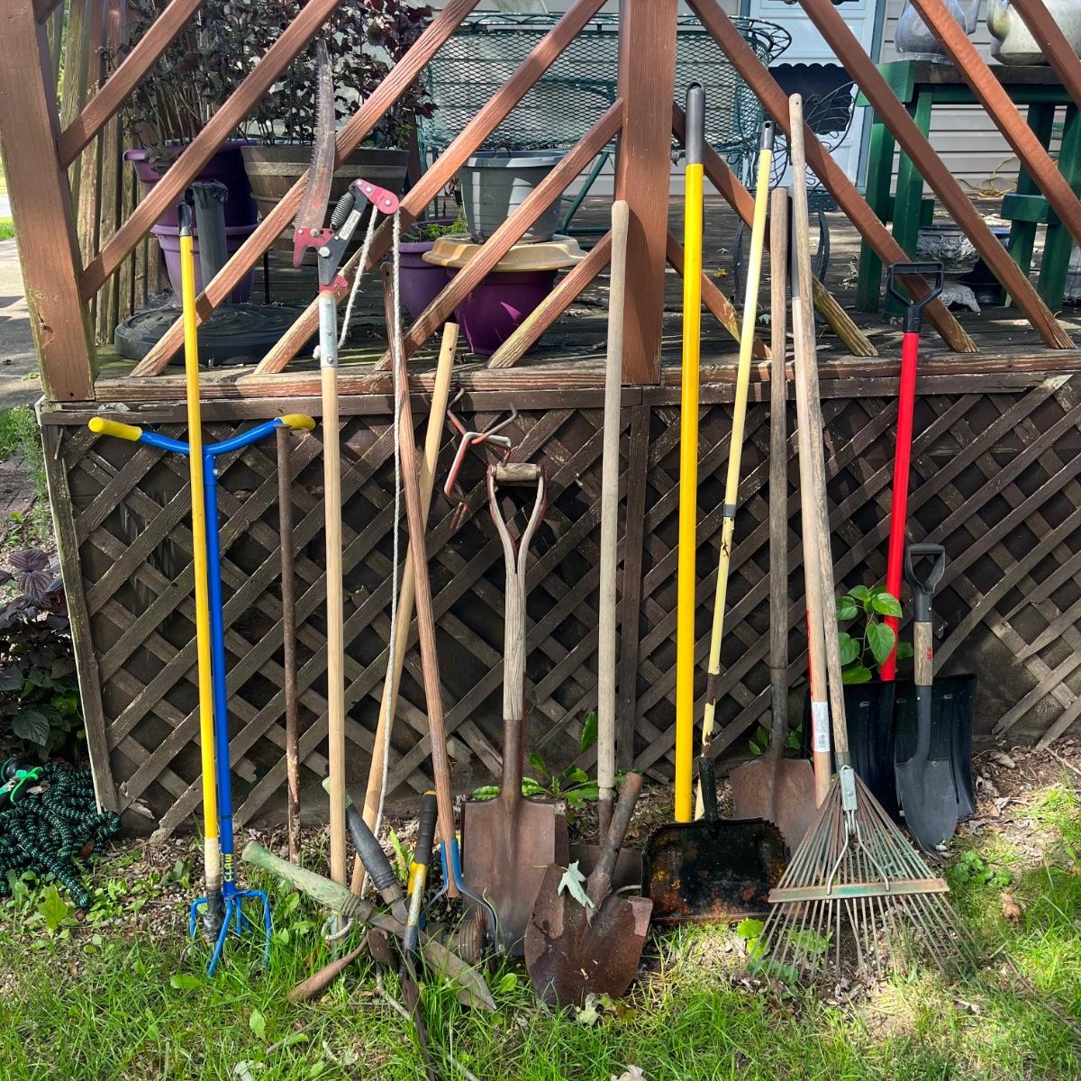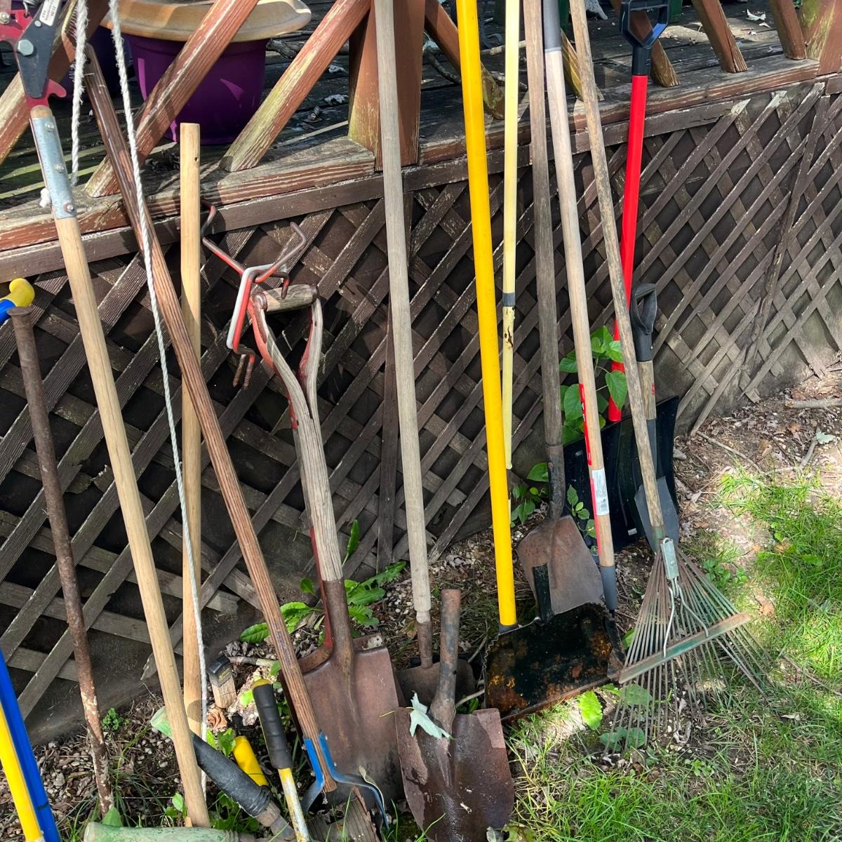 LOT 69S: Garden / Yard Tools, Shovels, Rakes, Pole Saw