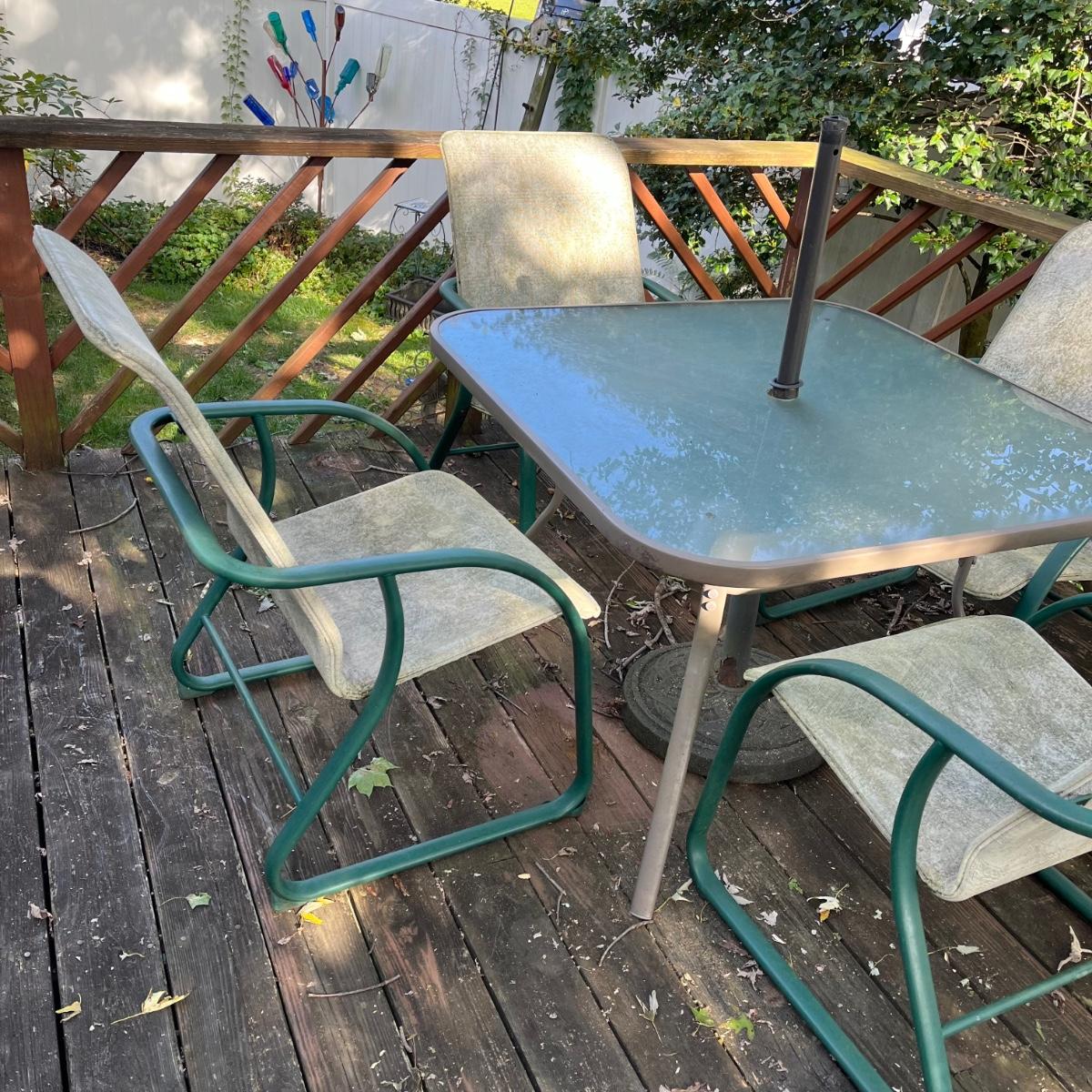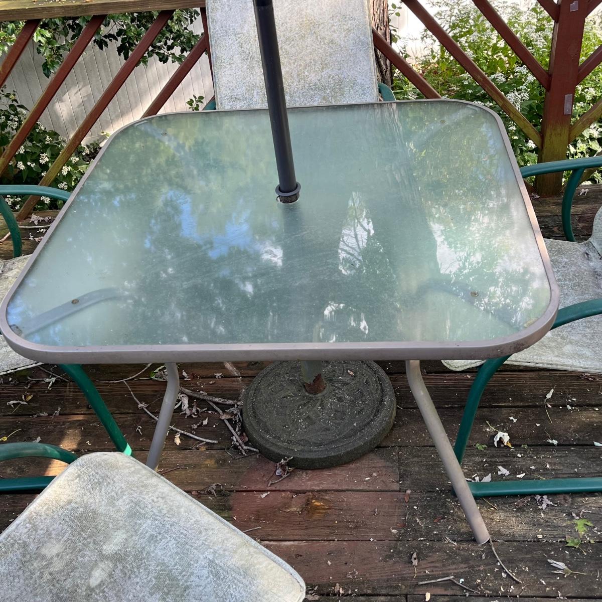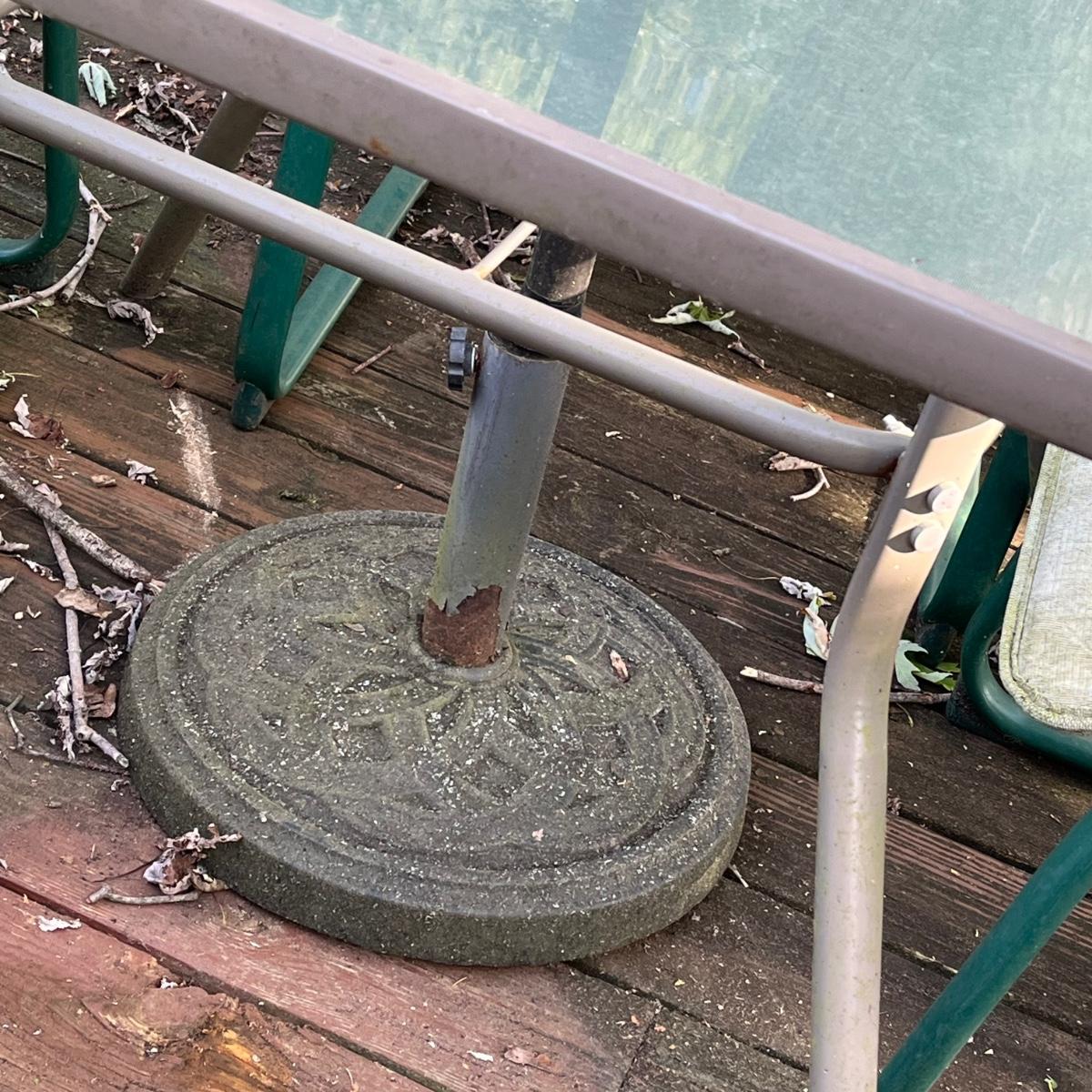 Lot includes table, which measures, 42" x 42", four chairs and umbrella base only.